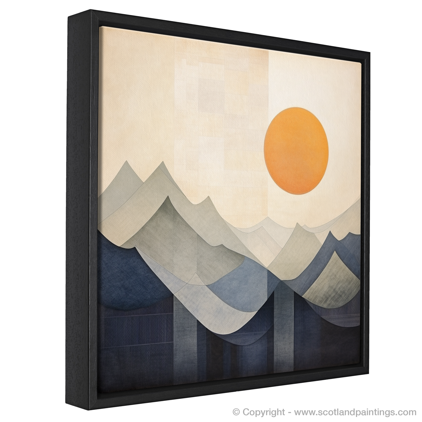 The piece showcases a series of overlapping mountain shapes, their peaks rising and falling in a rhythmic pattern reminiscent of the soothing undulations of Scotland's famed highland topography. This study in abstraction distils the landscape to its purest forms, with each layer of the mountains rendered in a different soothing shade of blue and grey. This gradient of cool tones is a nod to the misty atmosphere often found draping the Scottish hills, as well as the depths of lochs concealed within their valleys.
