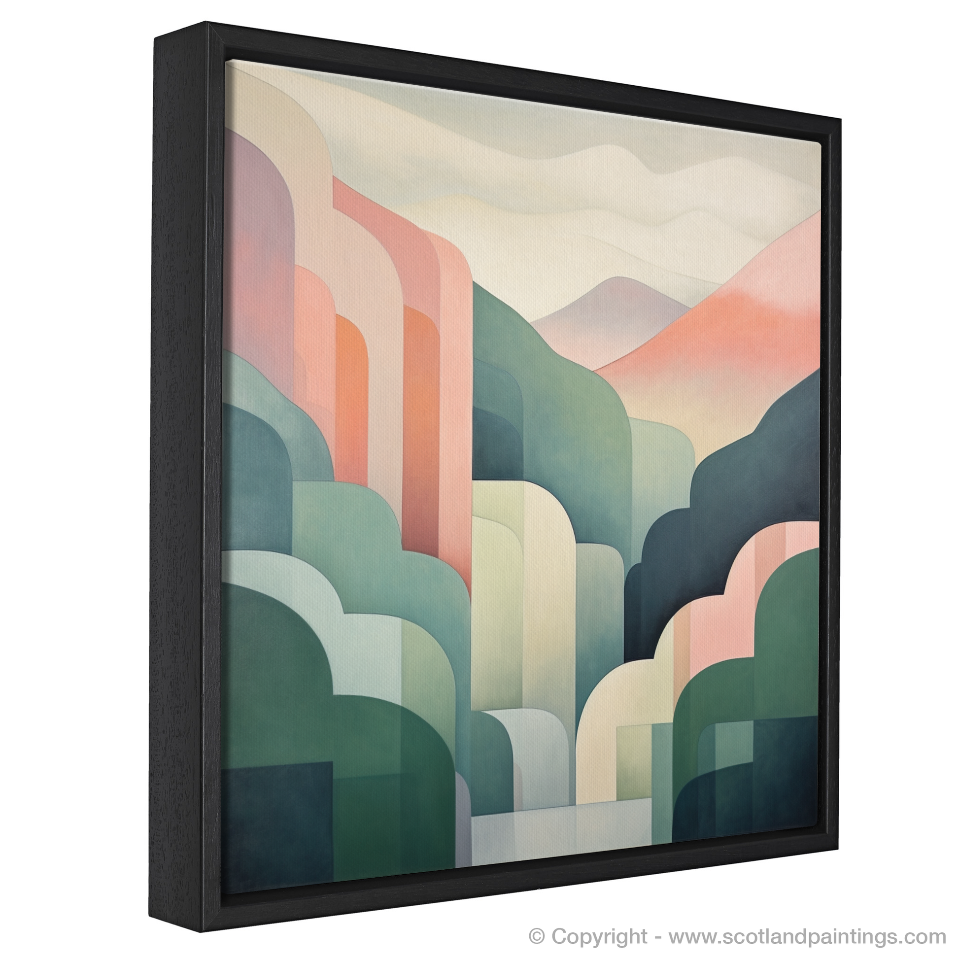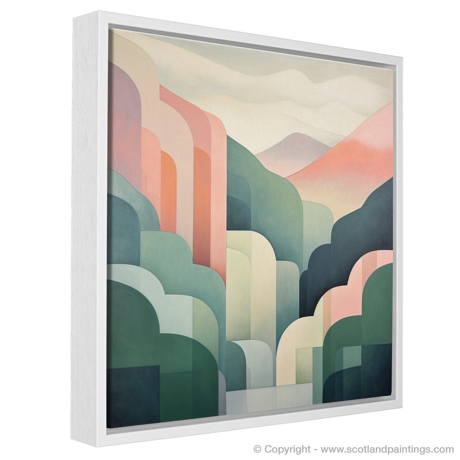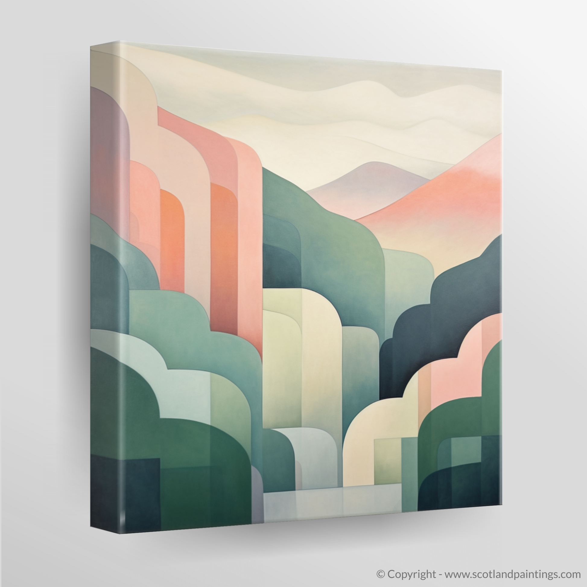 Boasting a composition that celebrates the balance between form and colour, the print is a symphony of harmonious shades, with each whisper-soft layer lending depth and dimension. Organic shapes in shades of green, pink, and cream converge, hinting at the luscious grass, heather, and mist that are signature to the Scottish Highlands.