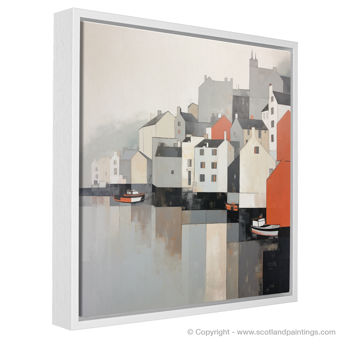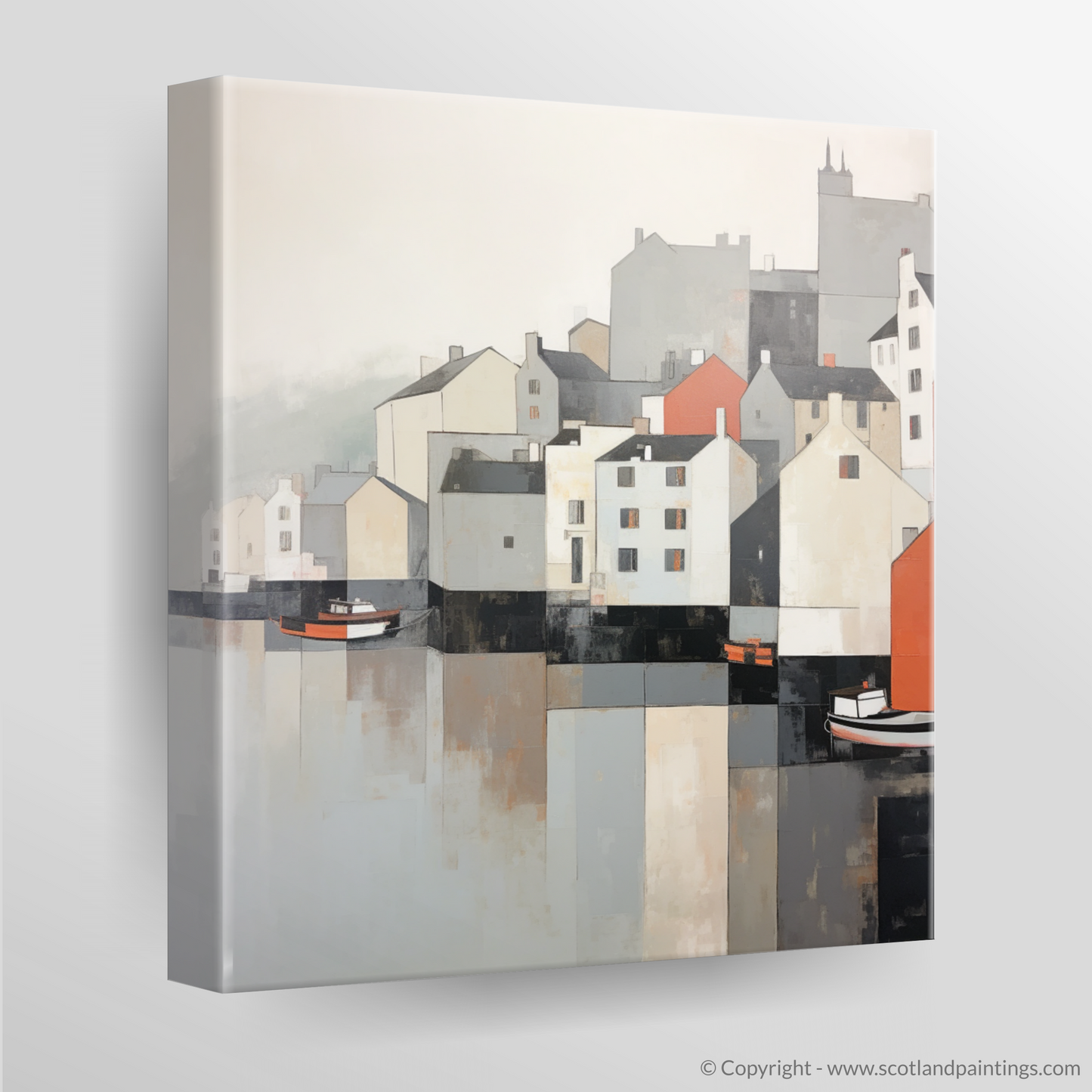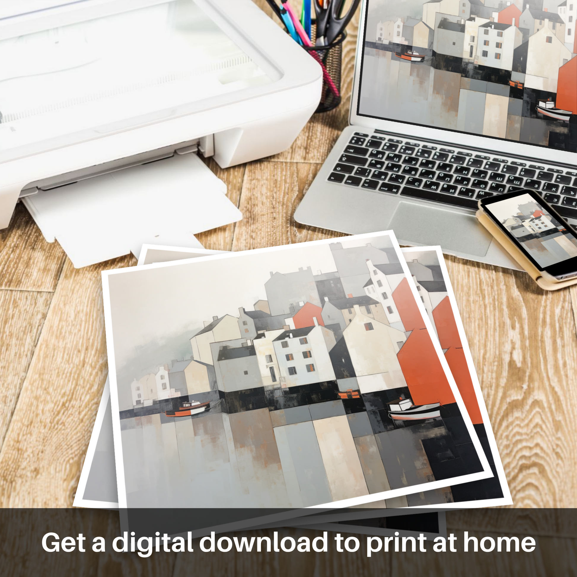 This serene composition features unembellished forms and solid blocks of colour, outlining the charming architecture that is characteristic of this iconic location. Hues of muted greys, whites, and creams dominate the scene, reflecting the quietude of a misty morning, delicately intersected by soft outlines suggesting depth and perspective. An accent of bold crimson on select buildings adds a captivating visual contrast, drawing the eye and enlivening the print.