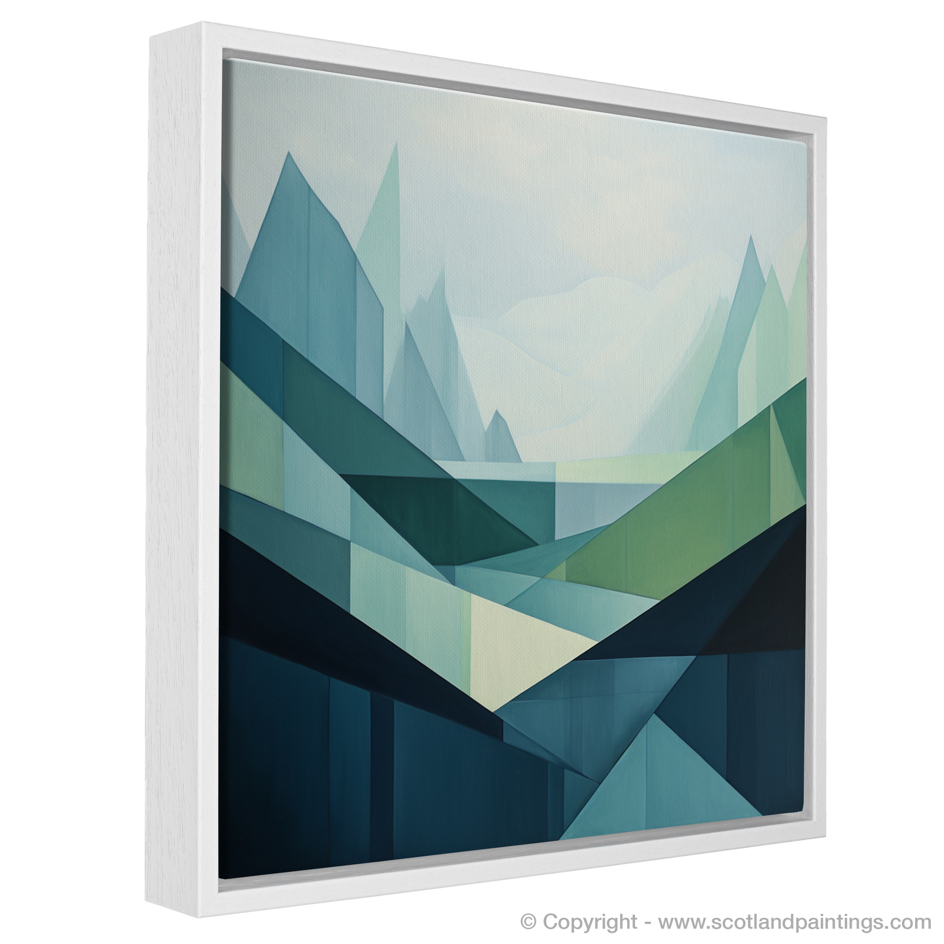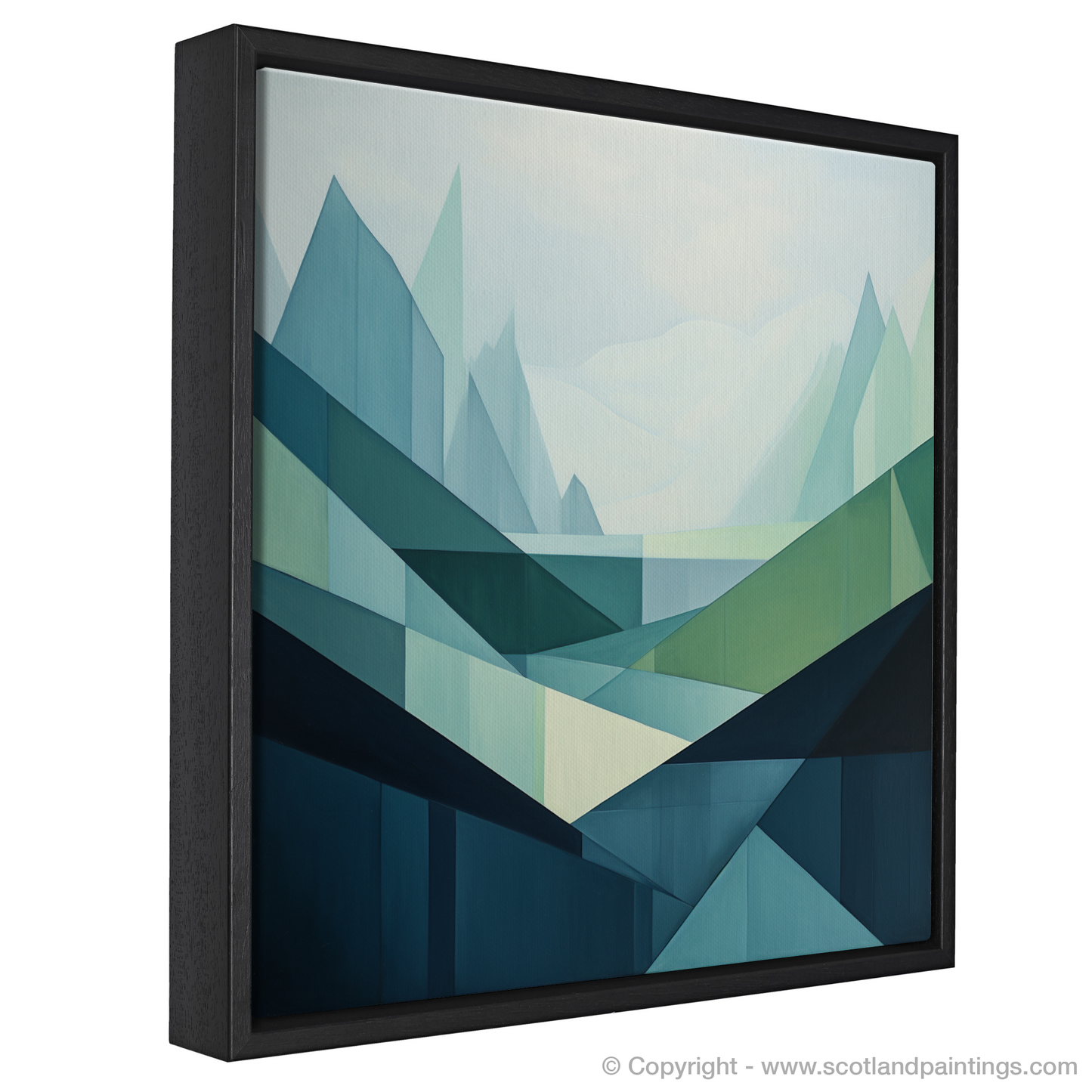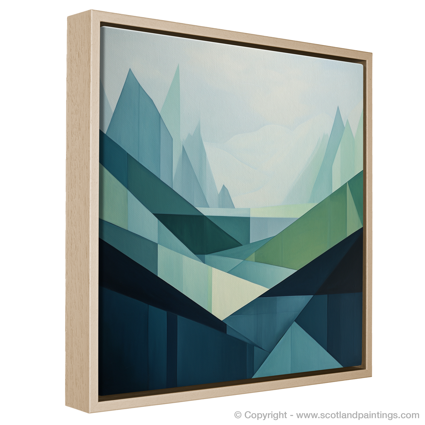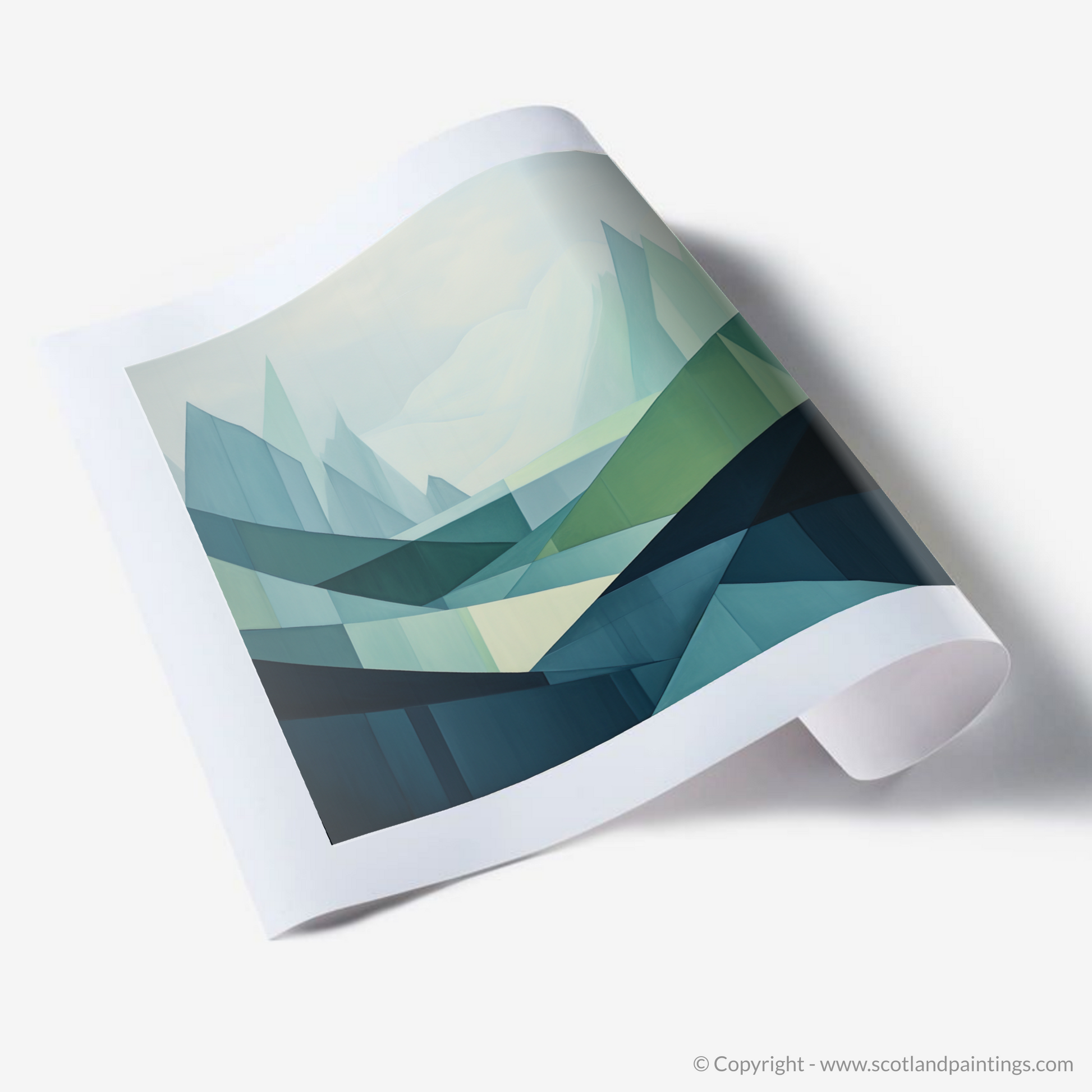 The art divides the landscape into a series of sharply cut planes, creating a rhythmic contrast between the angular segments and the soft, ethereal backdrop. Shifting from verdant moss to slate grey, and from sky blue to the deepest navy, the work plays with light and shadow, evoking the shifting moods of a glen as day passes into night.