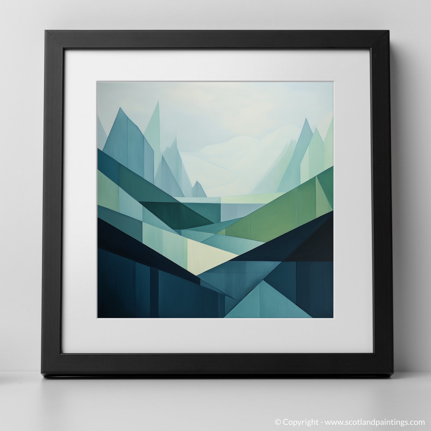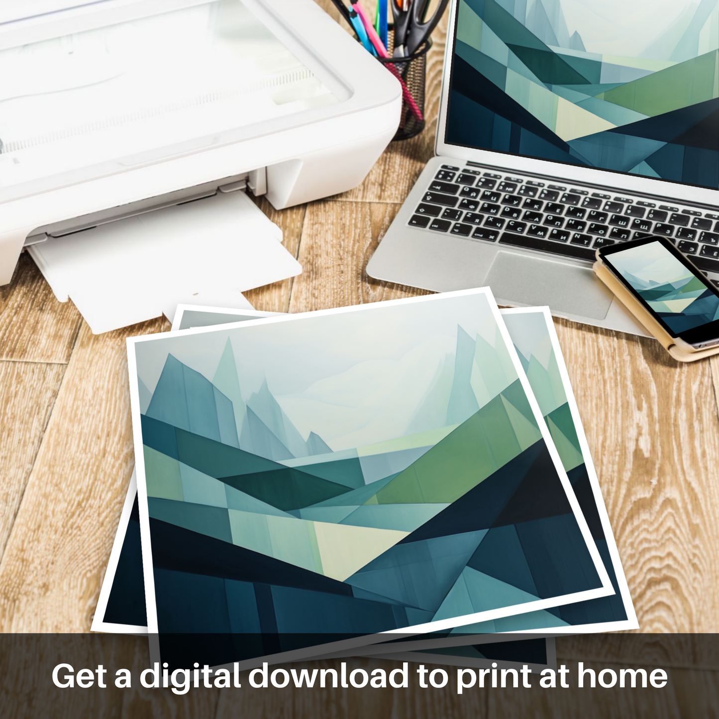 Summon the serene splendour of Scotland's natural landscapes into your space with this evocative minimalist print. With its crisp, geometric shapes and a soothing palette of blues and greens, this piece captures the tranquil essence of a Scottish glen, distilled into a symphony of abstract forms. Each hue is carefully chosen to reflect the myriad shades you might find in the Highland vistas, from the deep, pine-scented greens of the forest floor to the soft, misty blues of the distant, towering mountains.