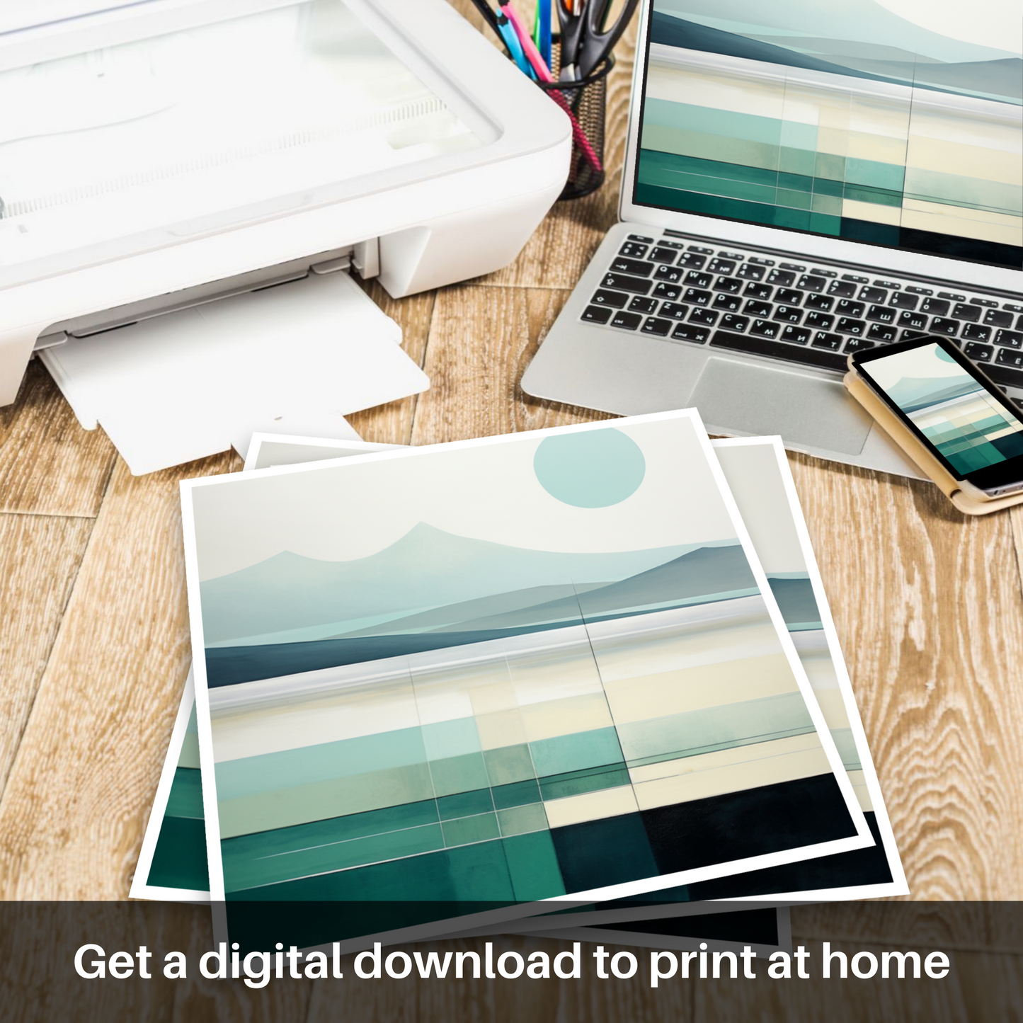 Immerse yourself in the serene tranquility and understated elegance with this minimalist aesthetic print, evocatively capturing the essence of Luskentyre Sands. With a soothing palette of aquamarine, soft jade and muted blues, each hue seamlessly blends to evoke the quiet beauty of the beach's distinctive shores. Bold, horizontal bands define the composition, inviting contemplation of the majestic dunes and reflective waterlines, all beneath a pale, ethereal sun that hangs in a creamy sky.