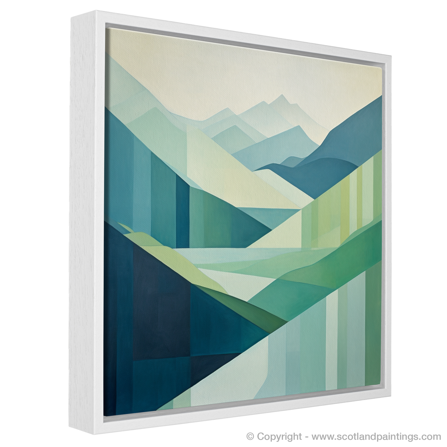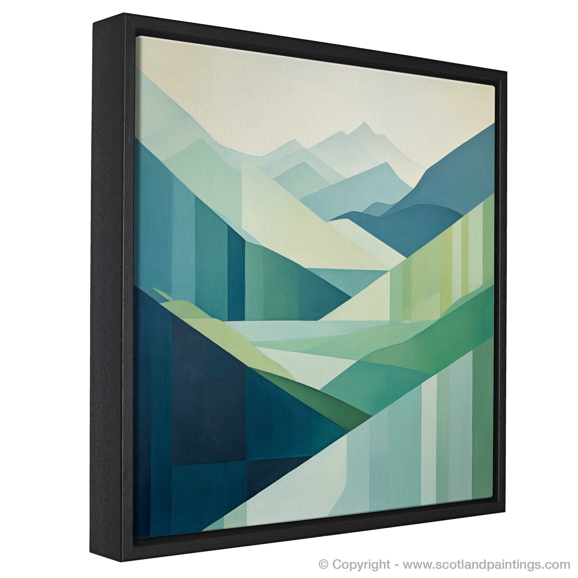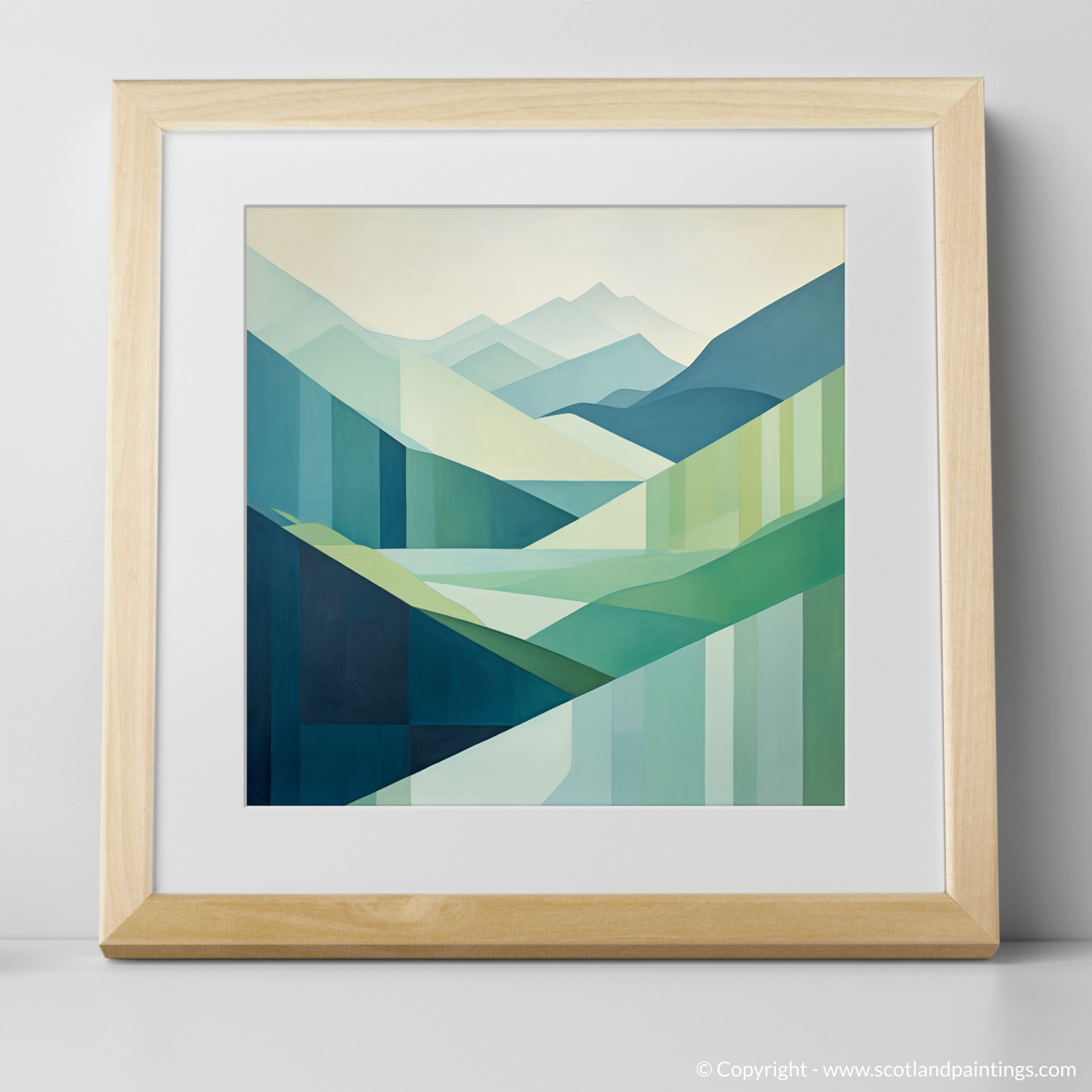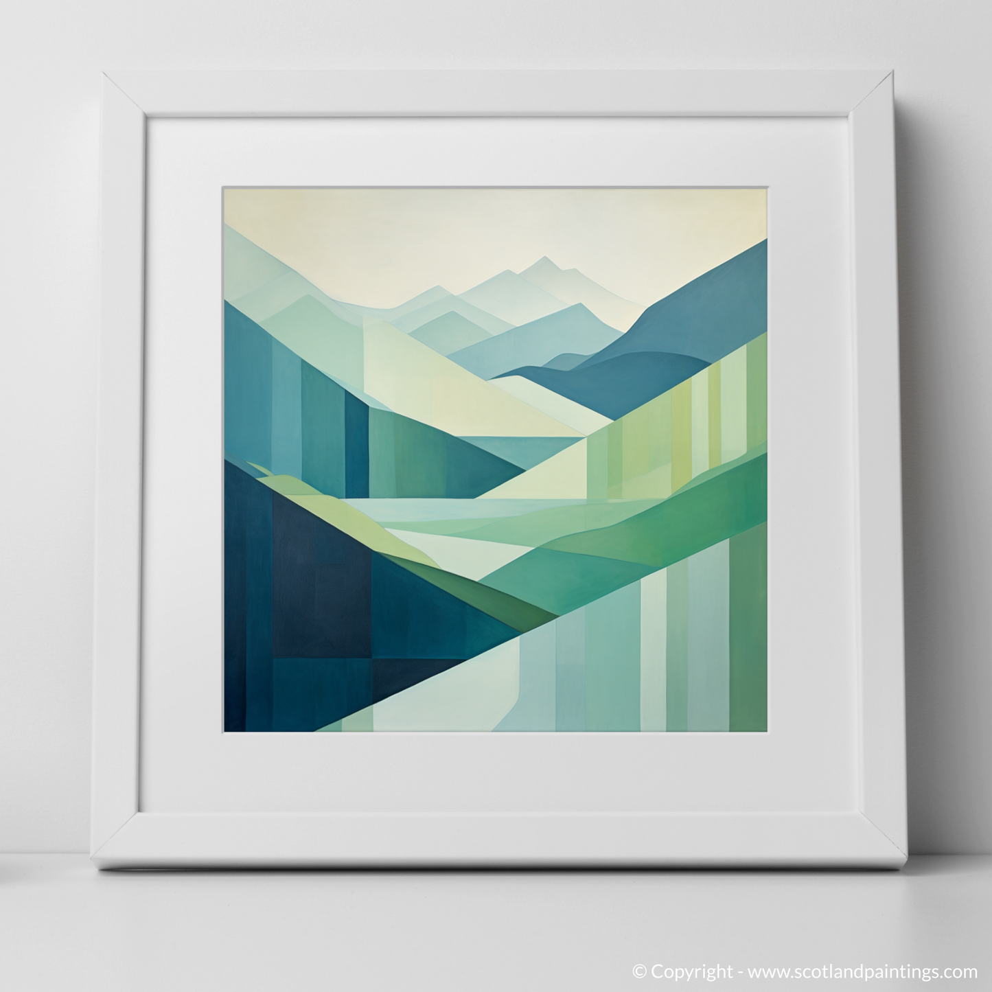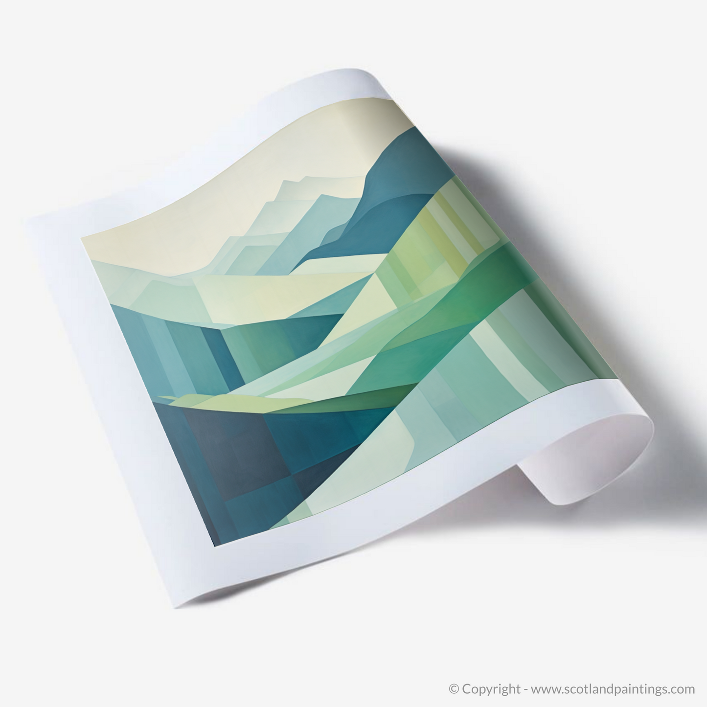 Embrace the serene tranquillity of Glen Nevis reimagined through the prism of minimalism. This captivating piece encapsulates the essence of the Scottish highlands with a composed palette of harmonious greens and blues, evoking the natural beauty and grandeur of the landscape. Geometric forms converge to depict the majestic peaks and undulating valleys, each angle and line deliberately crafted to guide your gaze through a stylised vision of these timeless terrains.