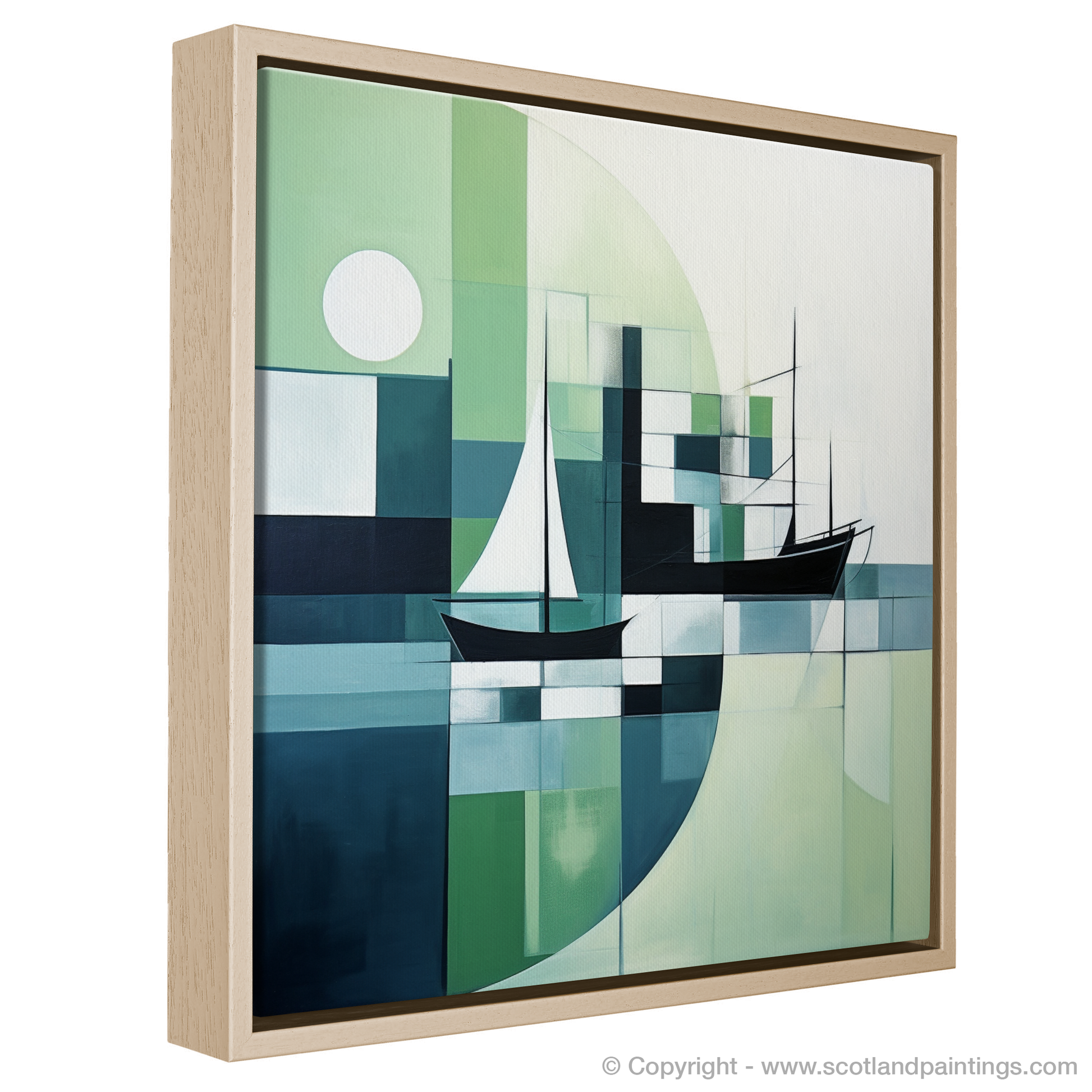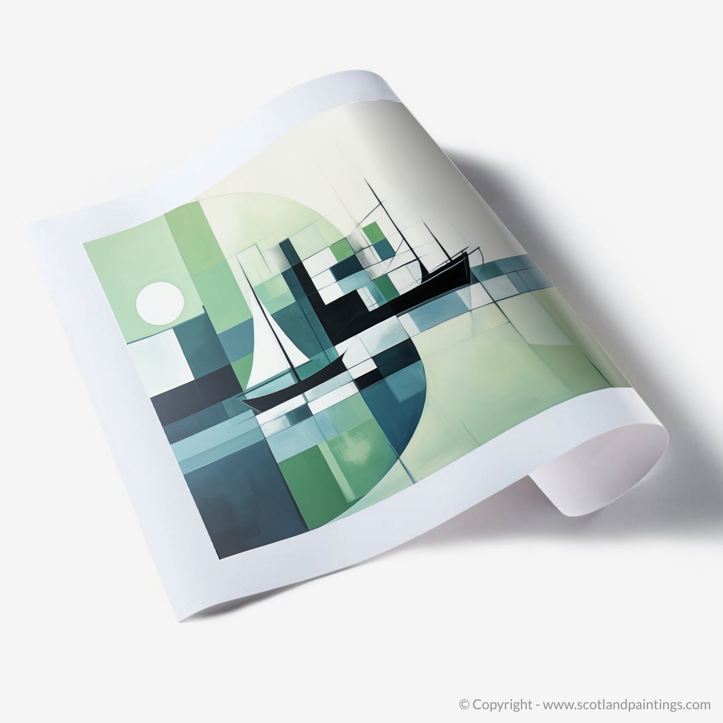 Capture the serene essence of a Scottish harbour distilled into a symphony of geometric abstraction with this exquisite art print. This piece is resplendent with a refreshing palette of crisp whites, deep blues, and soothing greens, evoking the tranquil atmosphere of Scotland's coastal waters.