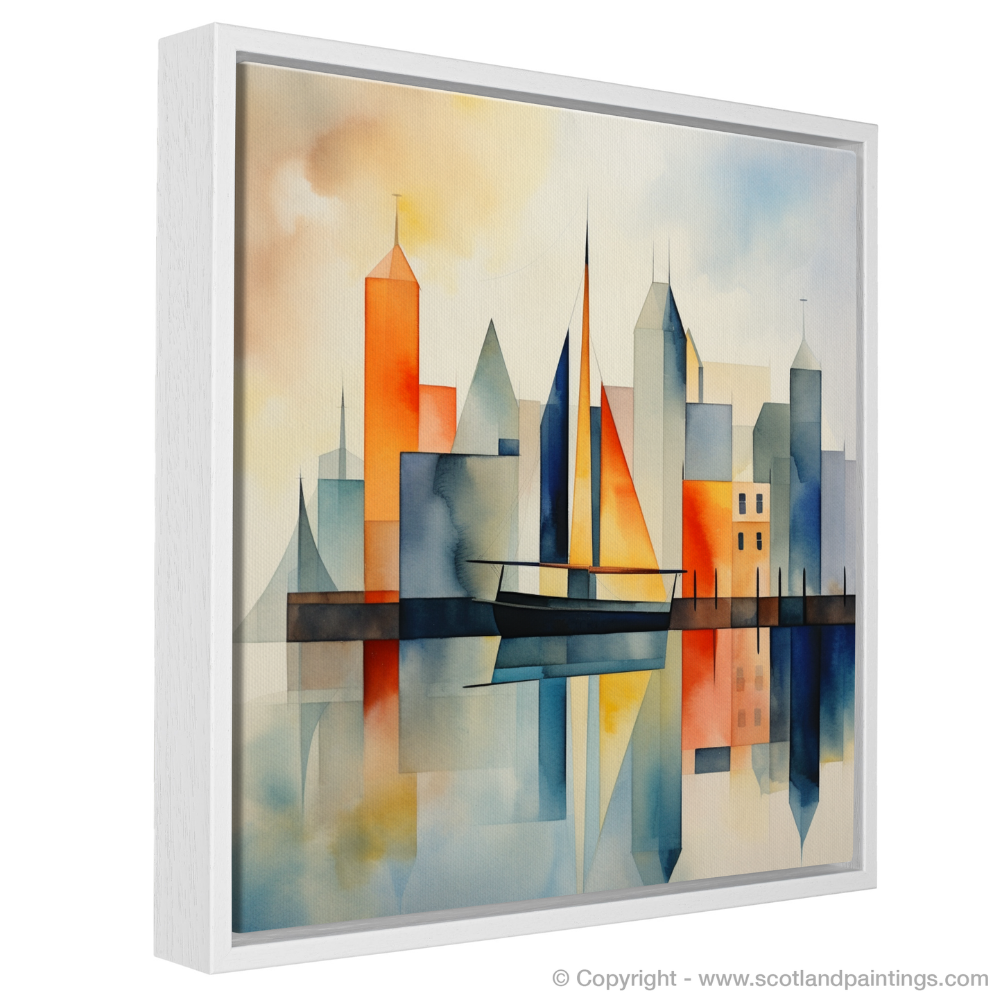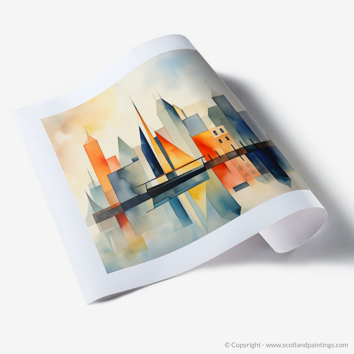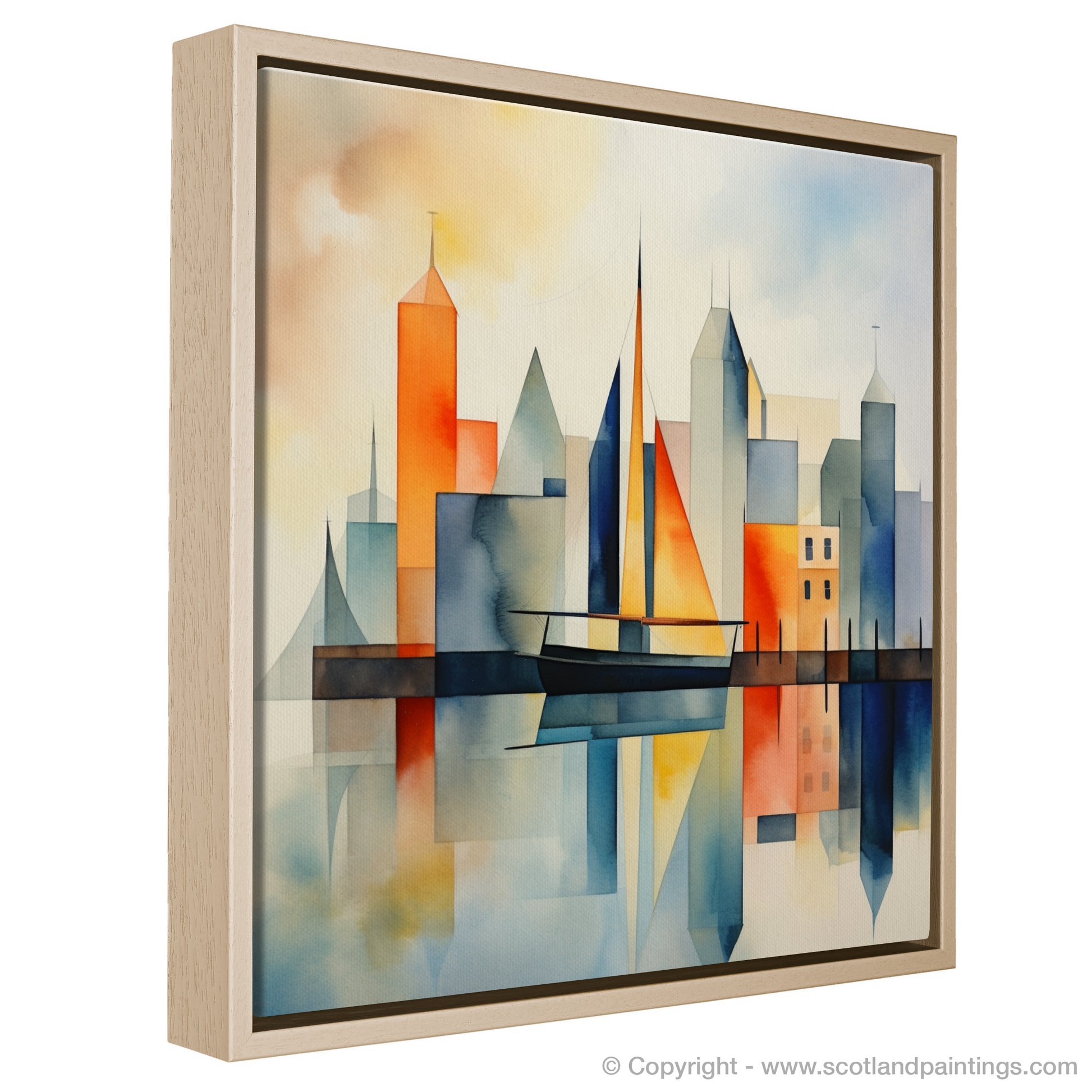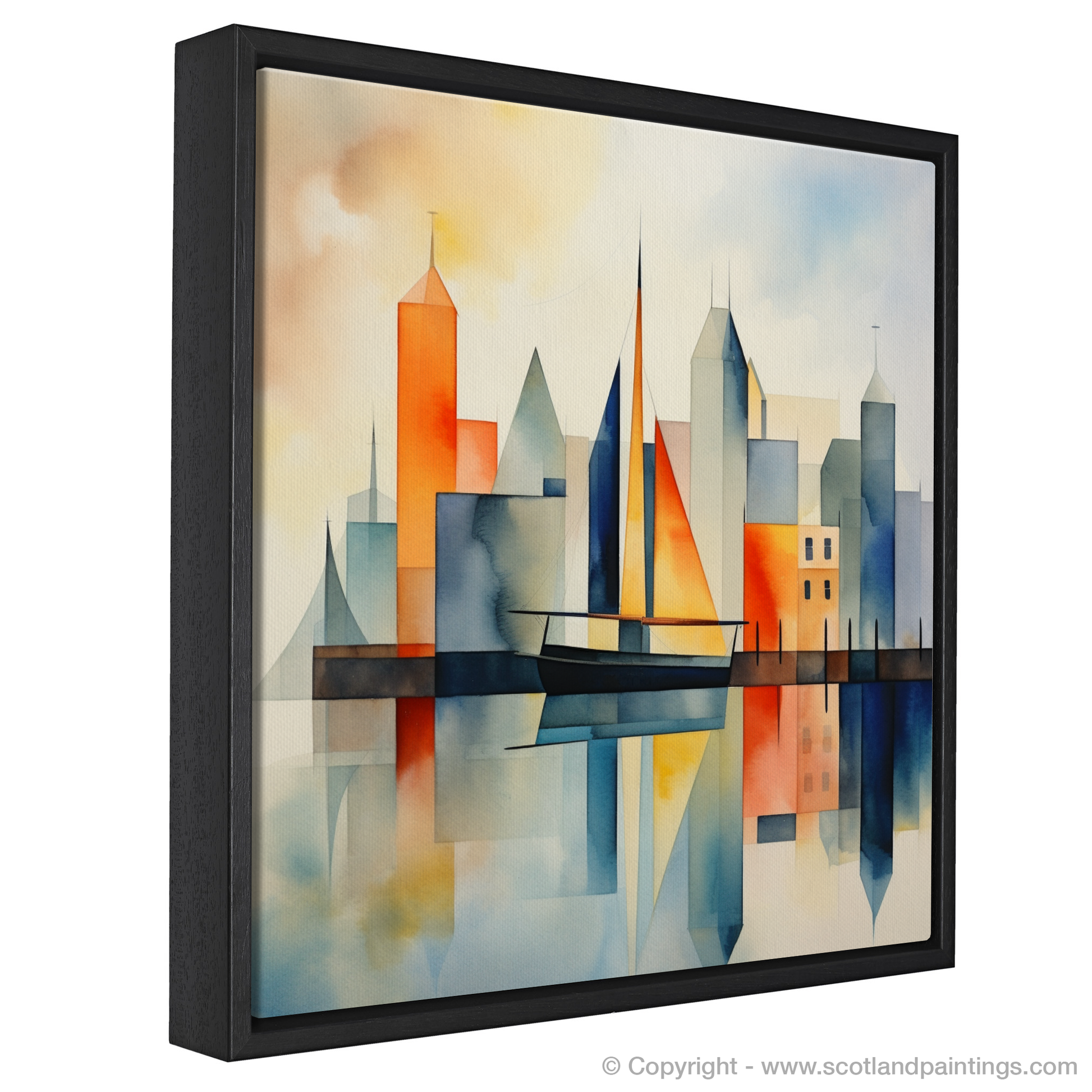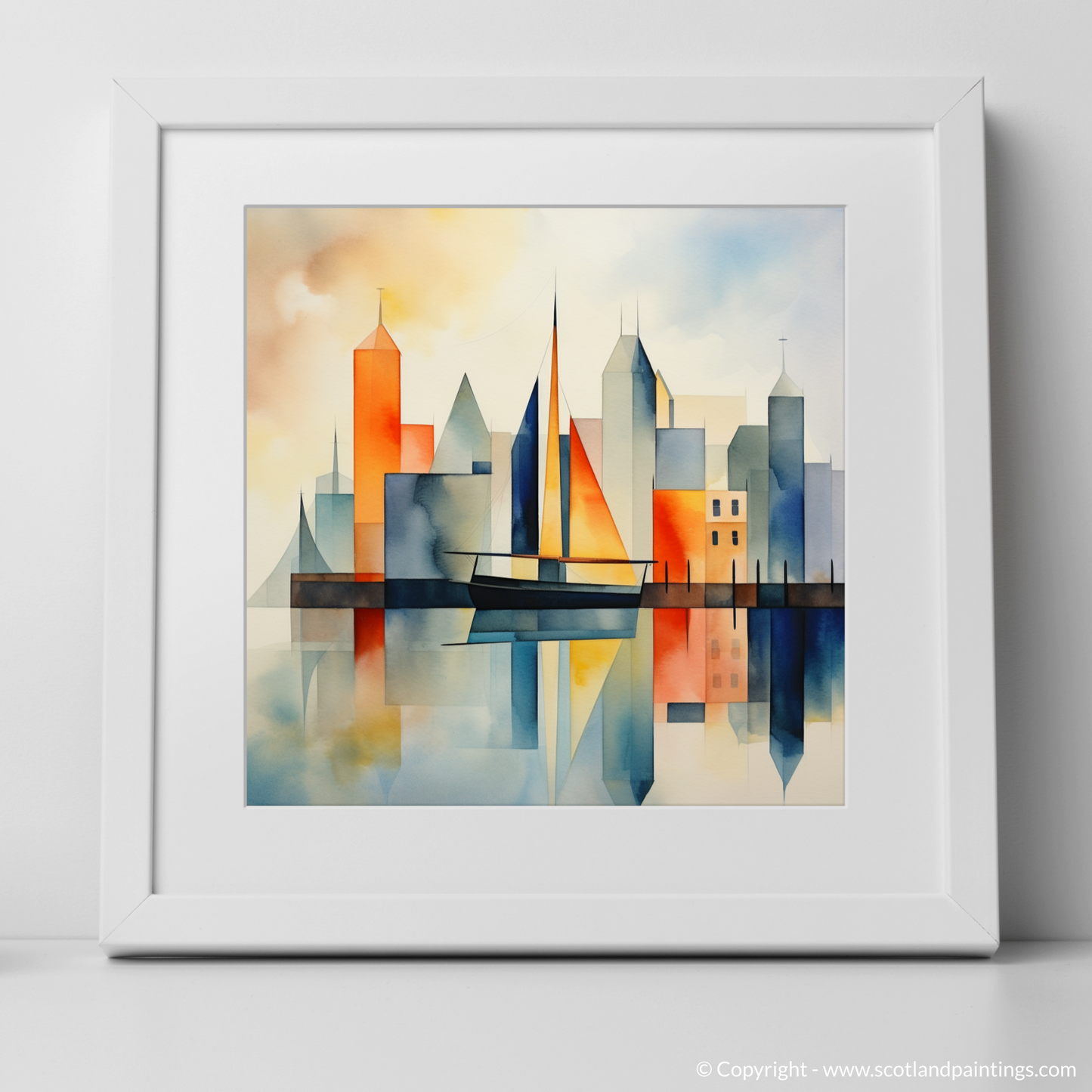 Let serenity wash over you as your gaze settles on this evocative portrayal of simplicity and elegance. This art print captures the essence of a Scottish harbour with a minimalist flair, distilled into geometric shapes and soothing colours that evoke a dreamlike tranquillity. The composition masterfully juxtaposes the rigidity of architectural forms with the fluidity of natural elements, using a harmonious palette that ranges from the warm tones of a setting sun to the cool blues of the sea.