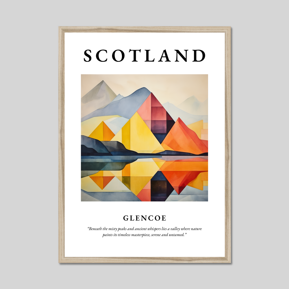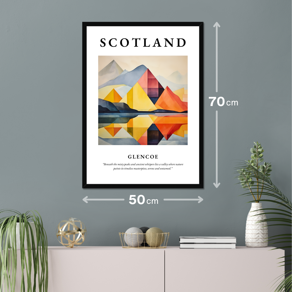 Experience the serene beauty of Scotland in your own space with our breathtaking framed poster print, a part of our “Modern & Minimal” collection. This striking piece, measuring an impressive 50cm x 70cm, transforms any room with its captivating yet minimalist depiction of Glencoe. The word “SCOTLAND” stands proud in bold lettering above a stunning painting, capturing the raw and timeless essence of one of the country's most iconic landscapes. Beneath the image, the evocative quote, “Beneath the misty peaks and ancient whispers lies a valley where nature paints its timeless masterpiece, serene and untamed,” adds a touch of poetic resonance.