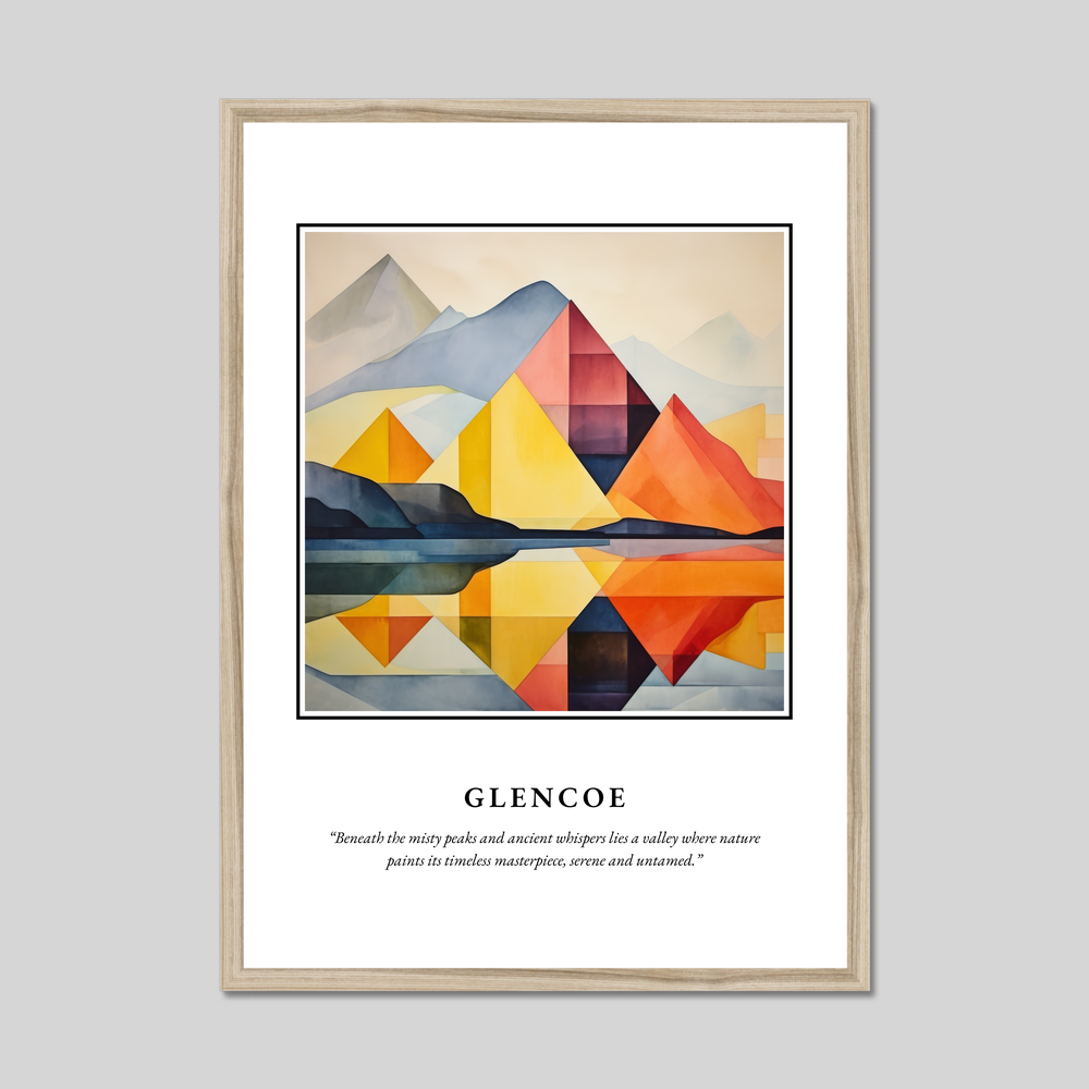 Available with options of a black, white, or natural wood-effect frame, this large poster offers an expansive portrayal of Glencoe's dramatic landscape without breaking the bank. The minimalist painting style presents the epic mountains with clean lines and soft hues, allowing the beauty of the slopes and valleys to speak through their simplicity and elegance. This makes it perfect for art enthusiasts and lovers of the minimalist style, as well as anyone with a connection to Scotland or memories of visiting Glencoe.