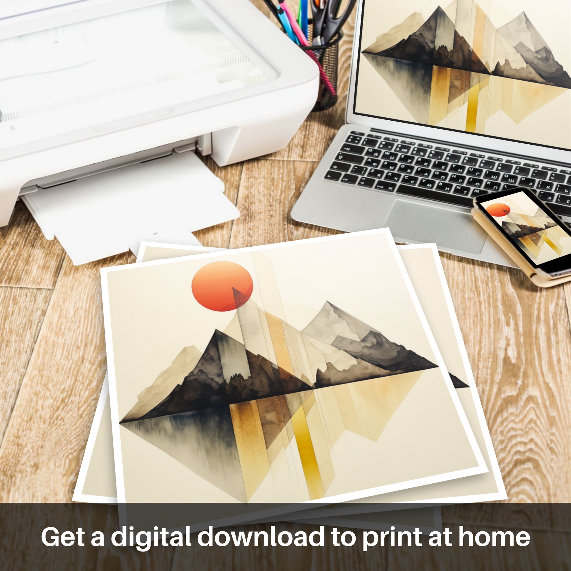 In a symphony of geometric abstraction, this captivating print embodies the essence of Glen Coe's legendary landscape through the lens of minimalism. At first glance, the eyes are drawn to the stark, fiery orb of the sun as it hangs above a distilled representation of rugged terrains and undulating peaks.