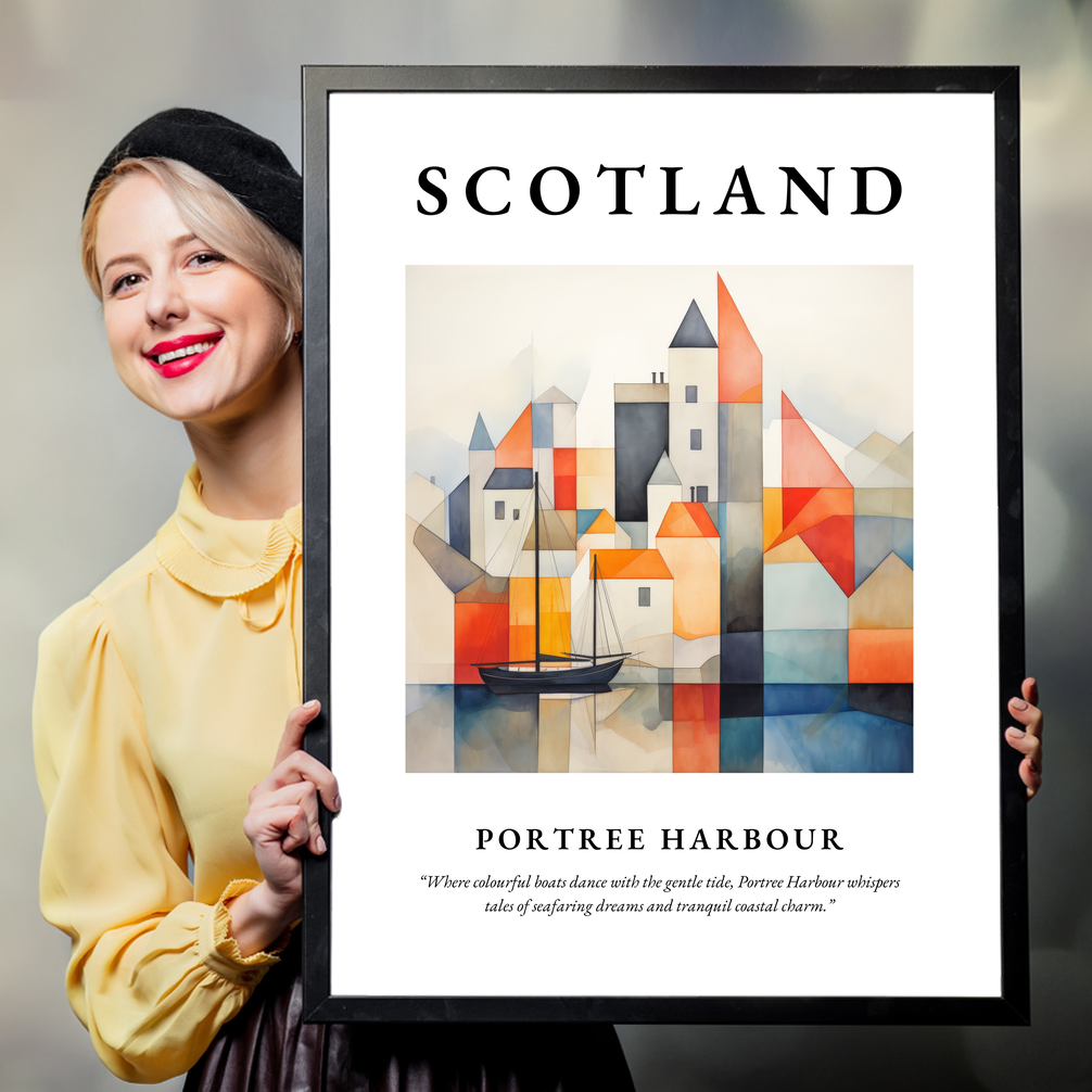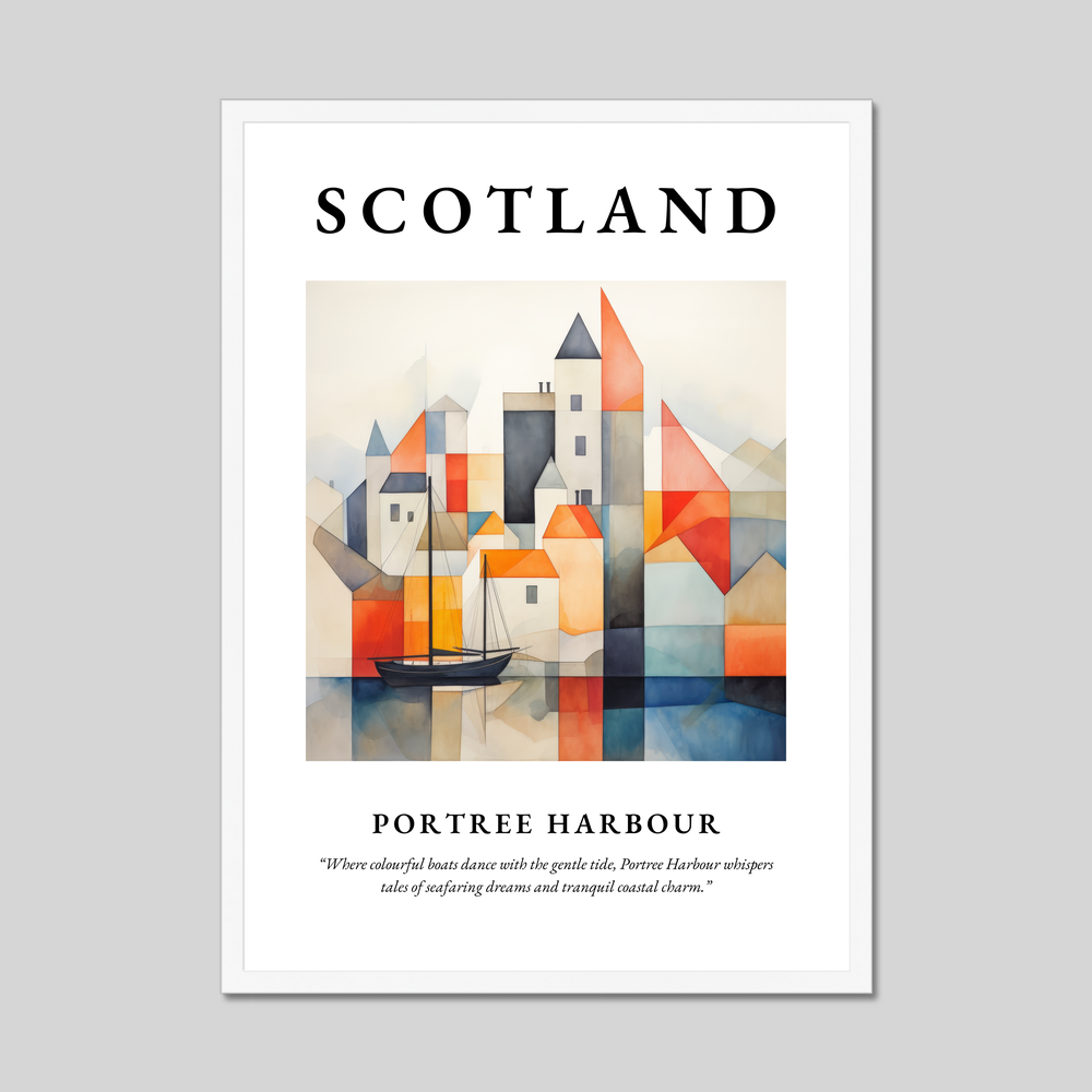 At the top, “SCOTLAND” stands boldly, drawing you into the picturesque depiction of Portree Harbour below. The painting captures the essence of the harbour’s graceful charm, where geometric simplicity meets a palette of soothing hues. Each element of this minimalist artwork resonates with the subtle dance of colourful boats against a backdrop of abstract buildings. The complementary quote beneath softly echoes the painting’s sentiment: “Where colourful boats dance with the gentle tide, Portree Harbour whispers tales of seafaring dreams and tranquil coastal charm.”