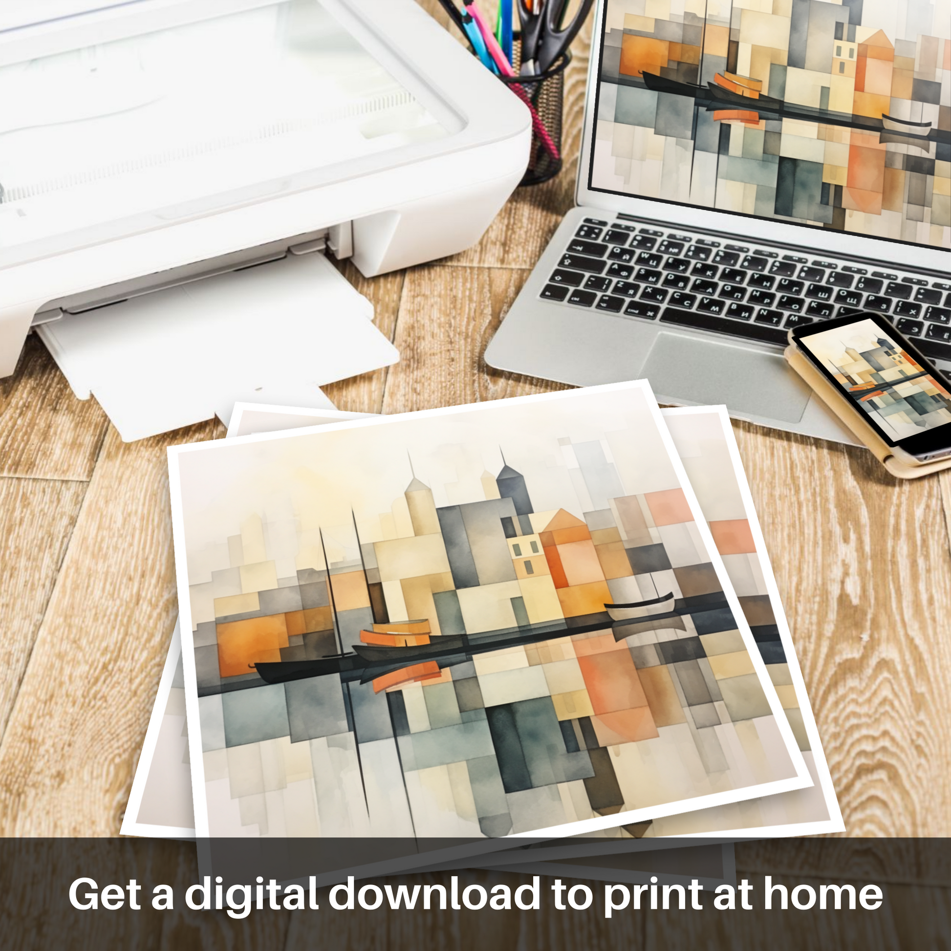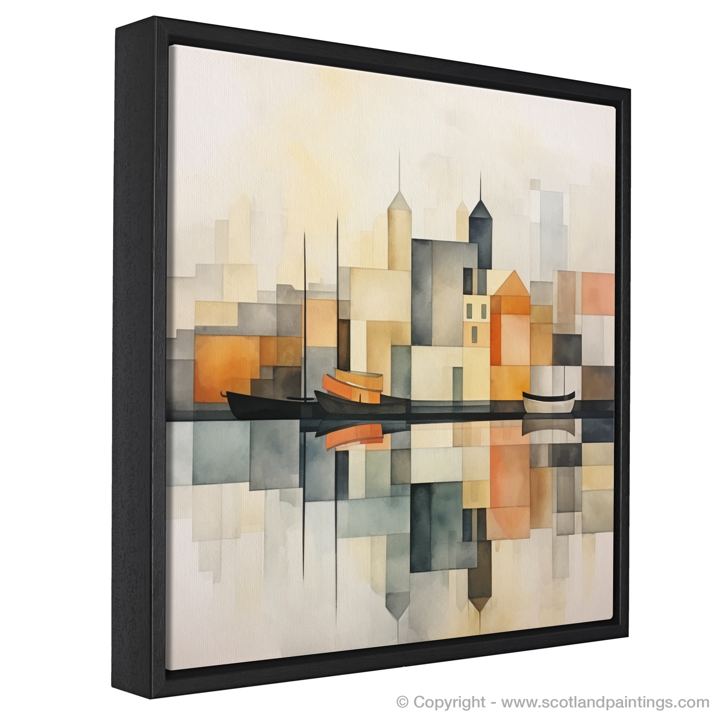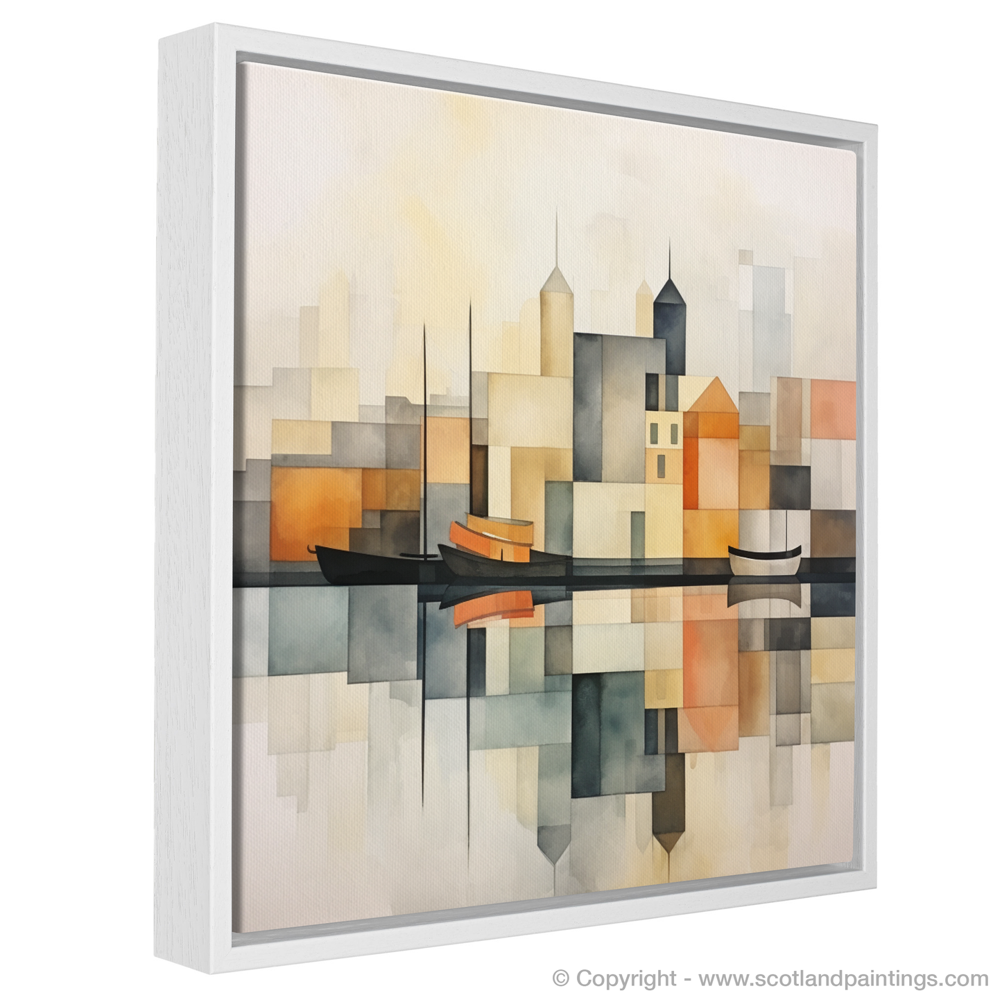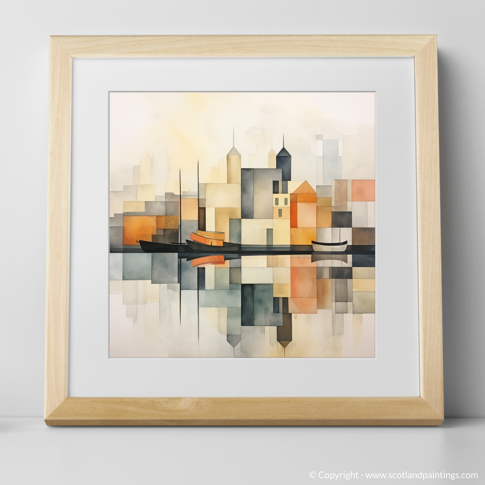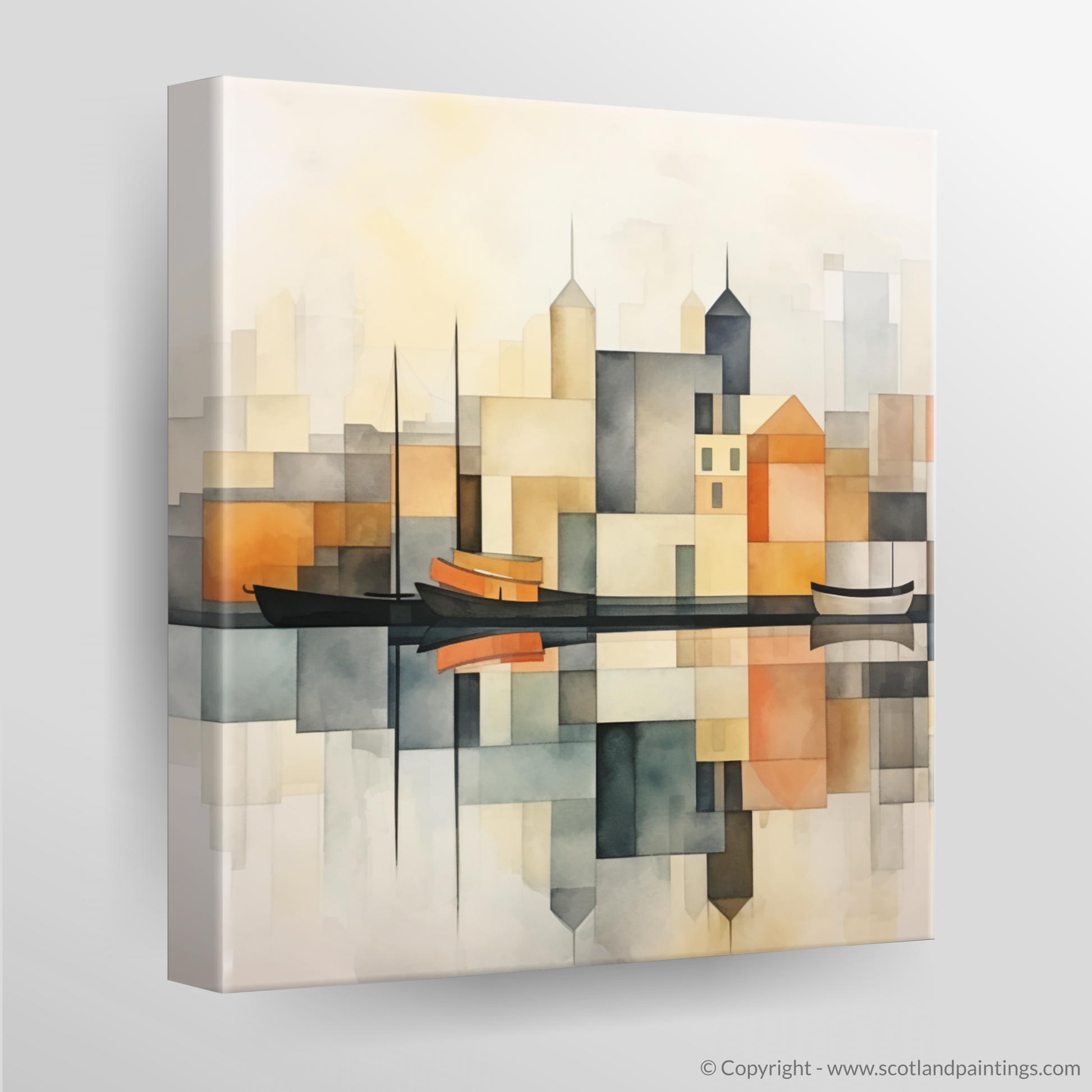 In the foreground, the elegant silhouette of sailboats bobbing gently on the harbour's mirrored surface adds a touch of nautical tranquillity. The landscape behind is portrayed in a tapestry of simplified forms, capturing the architectural features of the harbour buildings. Towering spires and rooftops are juxtaposed with cubist-inspired shapes creating an interplay of structure and open space that is hallmark to minimalist design.