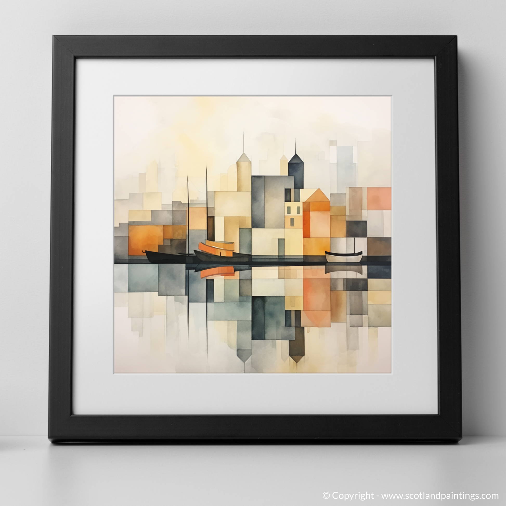 Capturing the essence of tranquillity through an artistic lens, this exquisite print celebrates the serene charm of Oban Harbour with a striking minimalist approach. Hues of golden yellow, soft peach, and a spectrum of blues and greys are thoughtfully arranged in geometric abstraction. They ebb and flow across the piece, evoking the reflective water's surface and the tranquil skies at dusk.