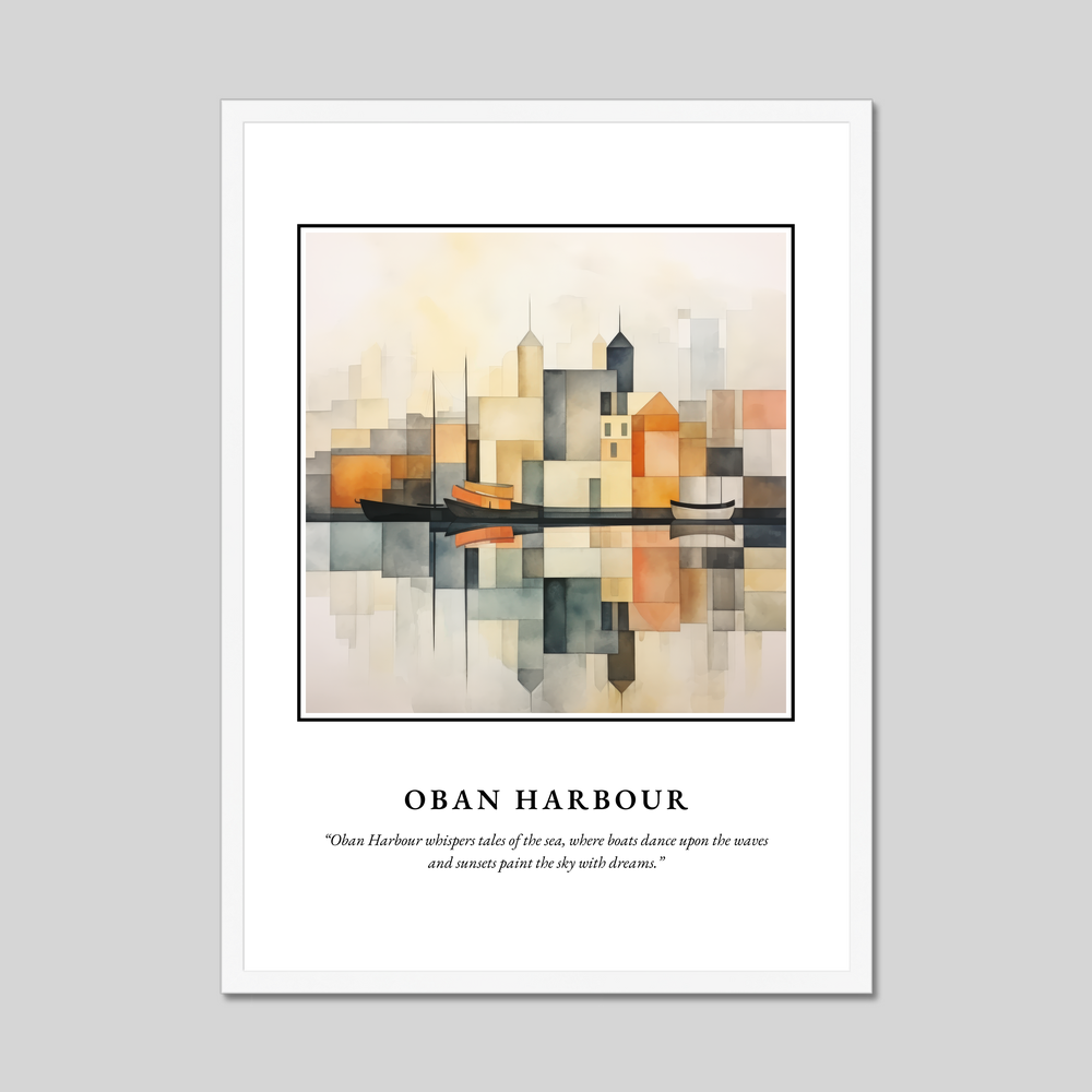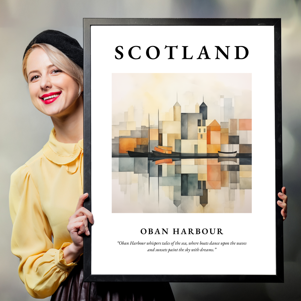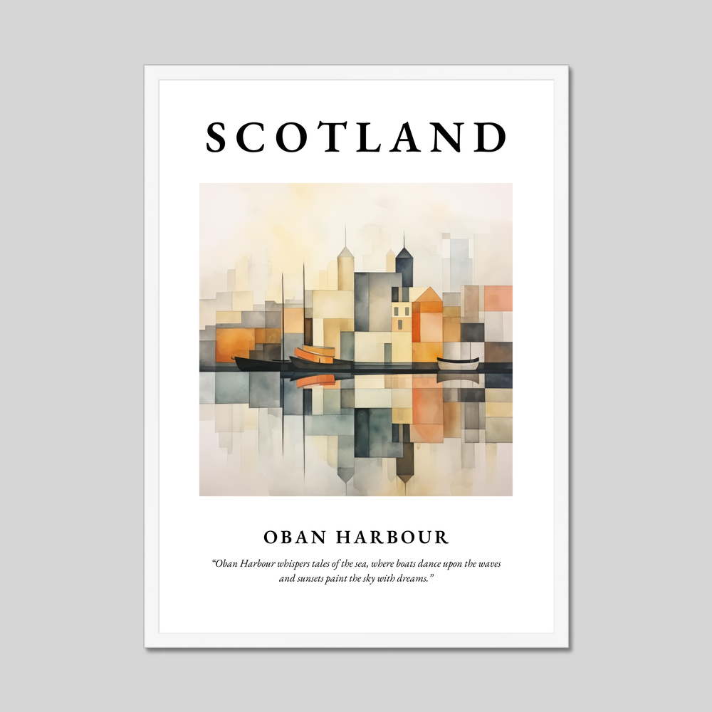 Below this elegant depiction, the quote, “Oban Harbour whispers tales of the sea, where boats dance upon the waves and sunsets paint the sky with dreams,” evokes the poetic allure of the place, inviting viewers to imagine themselves amidst the calm waters and vibrant sunsets that the artwork elegantly encapsulates.