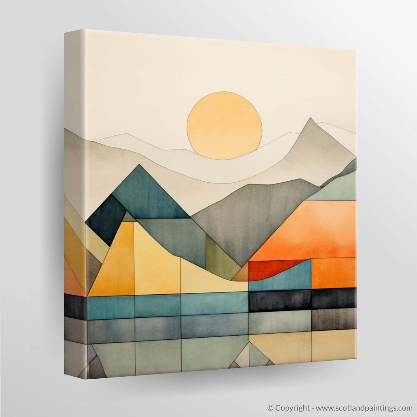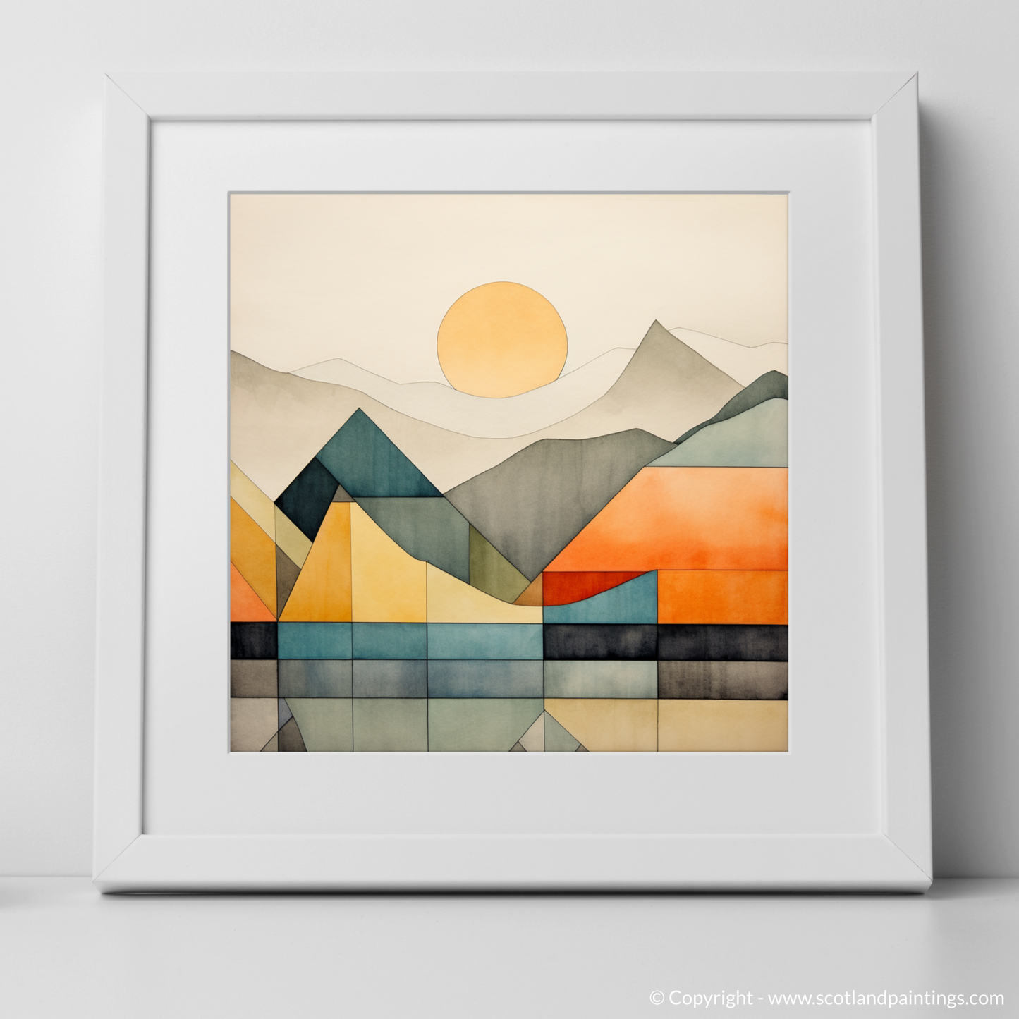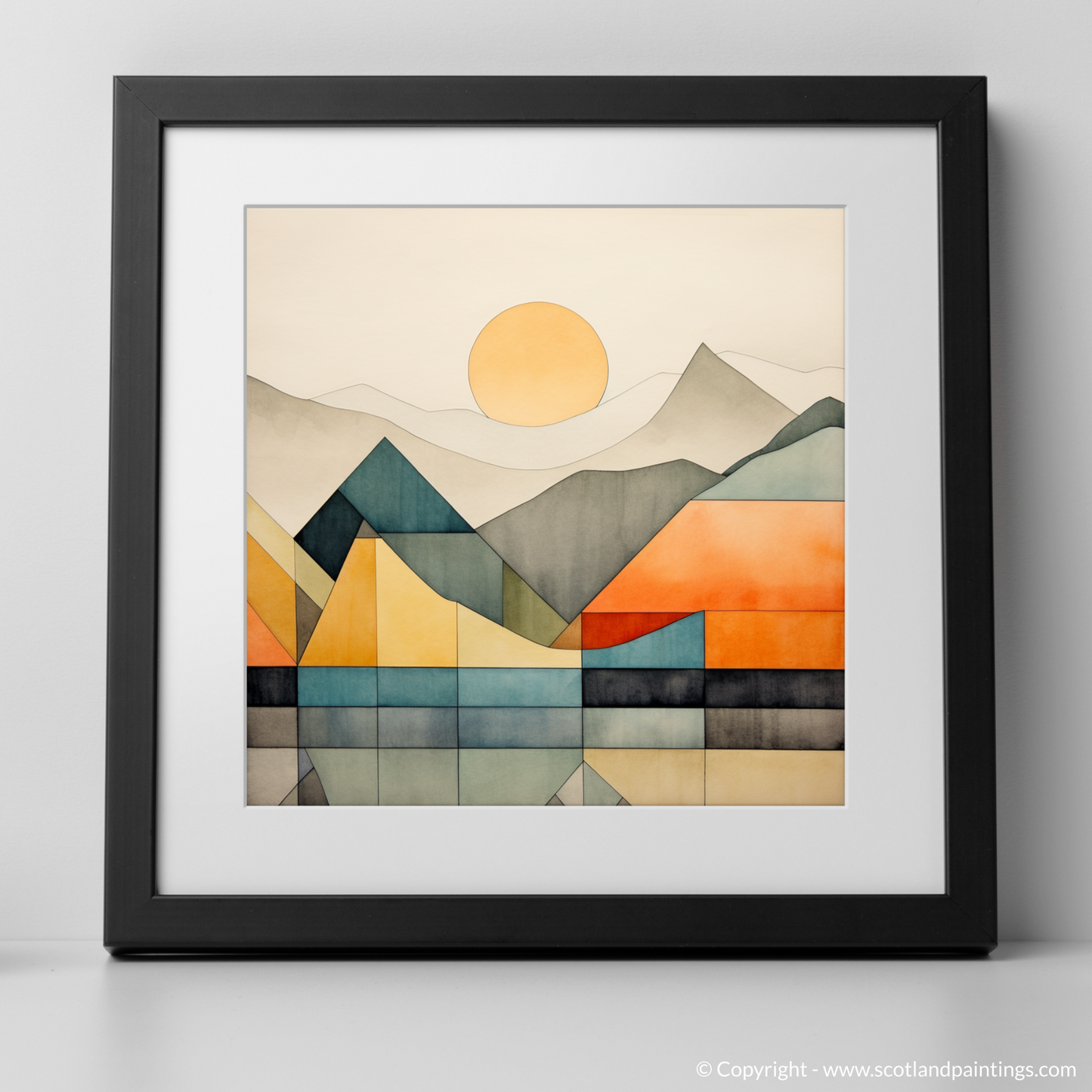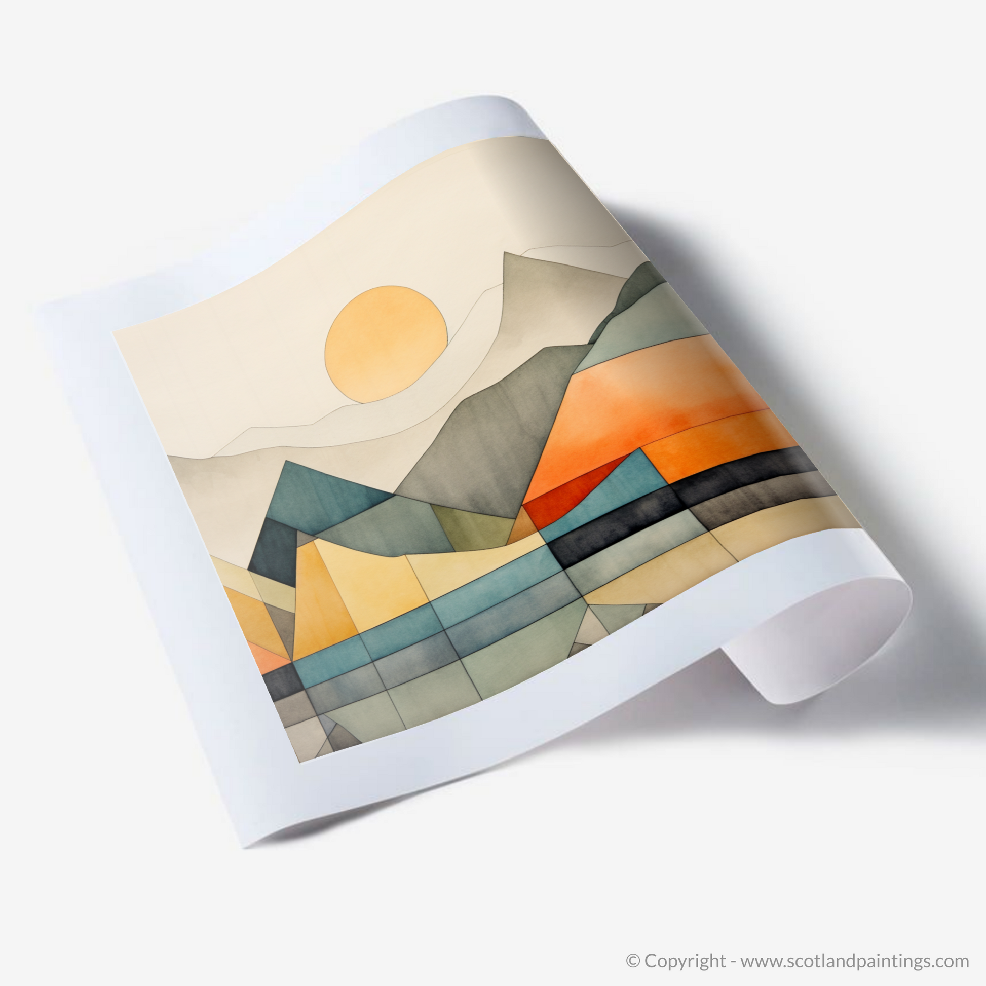 Embrace the serene simplicity of this evocative piece, capturing the essence of the Isle of Skye with a minimalist touch that speaks volumes. Bold geometric shapes converge to form an abstracted landscape, with overlapping mountains boldly etched in a spectrum of calming colours. Warm ochre, terracotta, and sandy hues echo Skye's rugged cliff faces, while cooler blues and greys mirror the island's famously tranquil seas and skies.