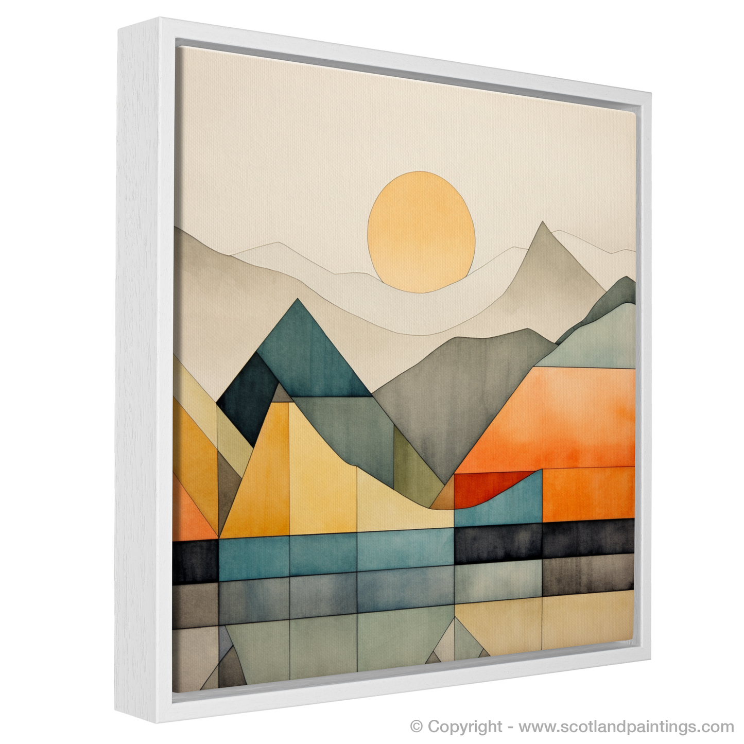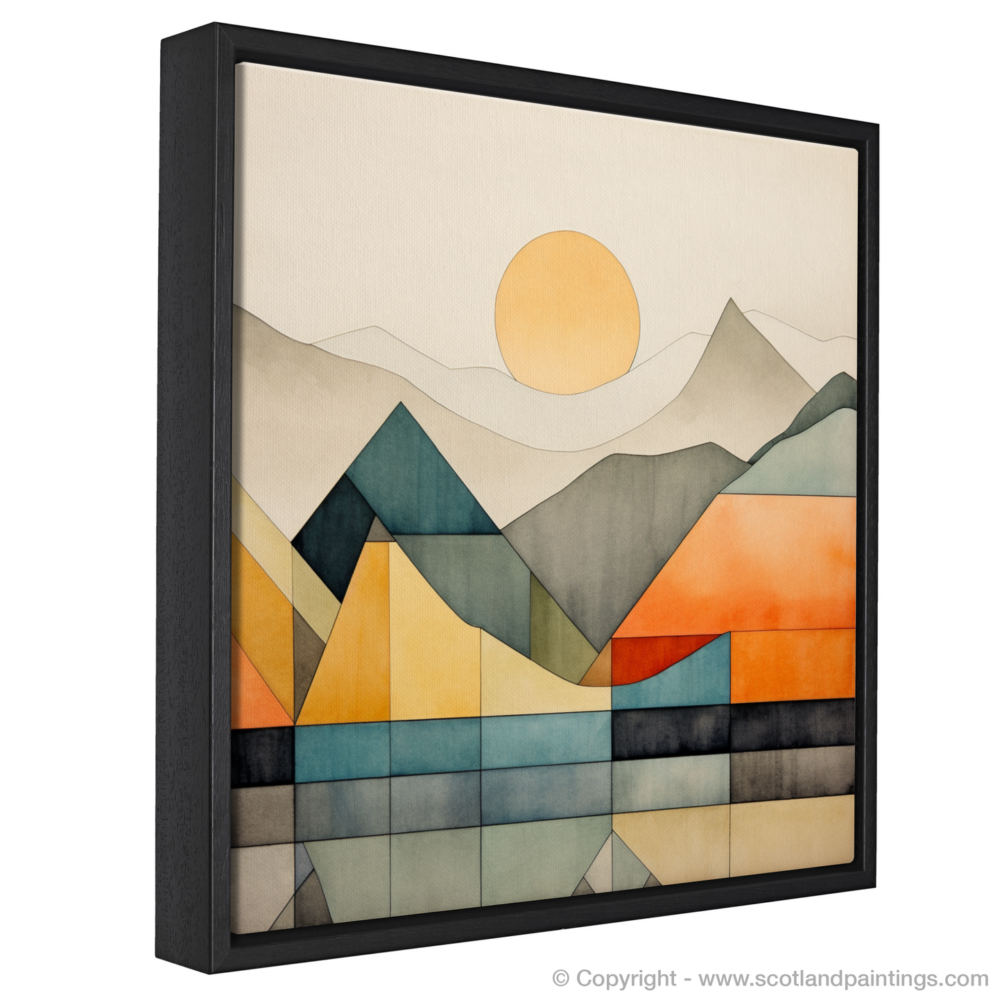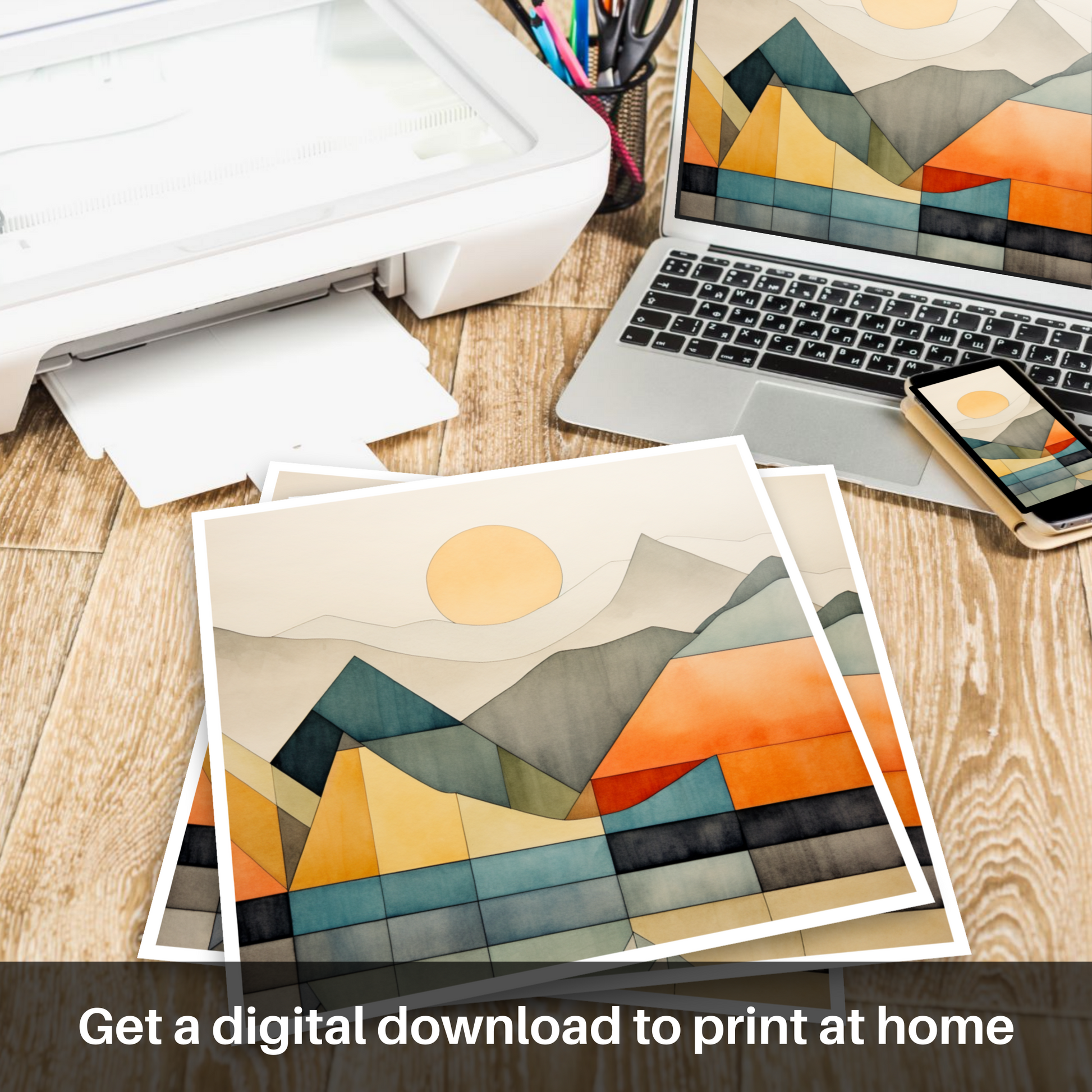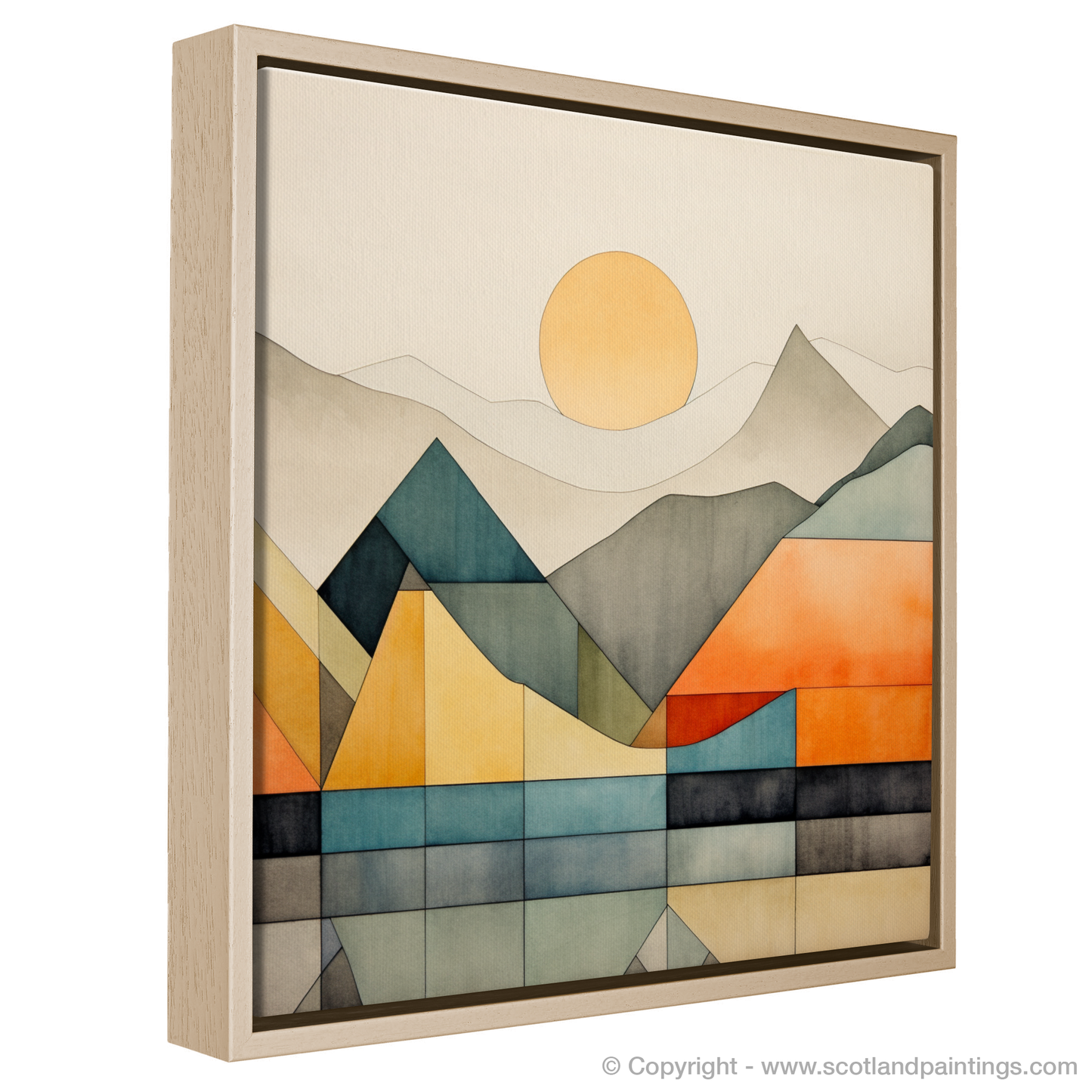 Embrace the serene simplicity of this evocative piece, capturing the essence of the Isle of Skye with a minimalist touch that speaks volumes. Bold geometric shapes converge to form an abstracted landscape, with overlapping mountains boldly etched in a spectrum of calming colours. Warm ochre, terracotta, and sandy hues echo Skye's rugged cliff faces, while cooler blues and greys mirror the island's famously tranquil seas and skies.
