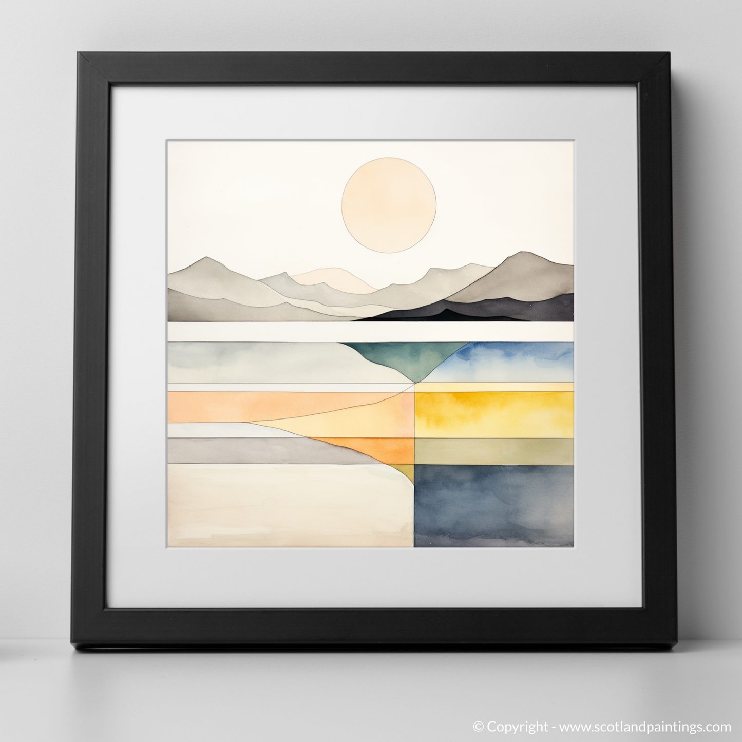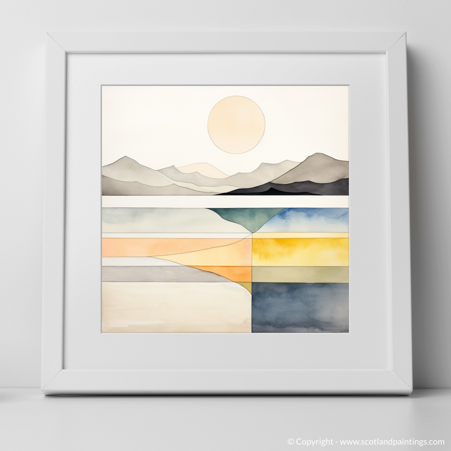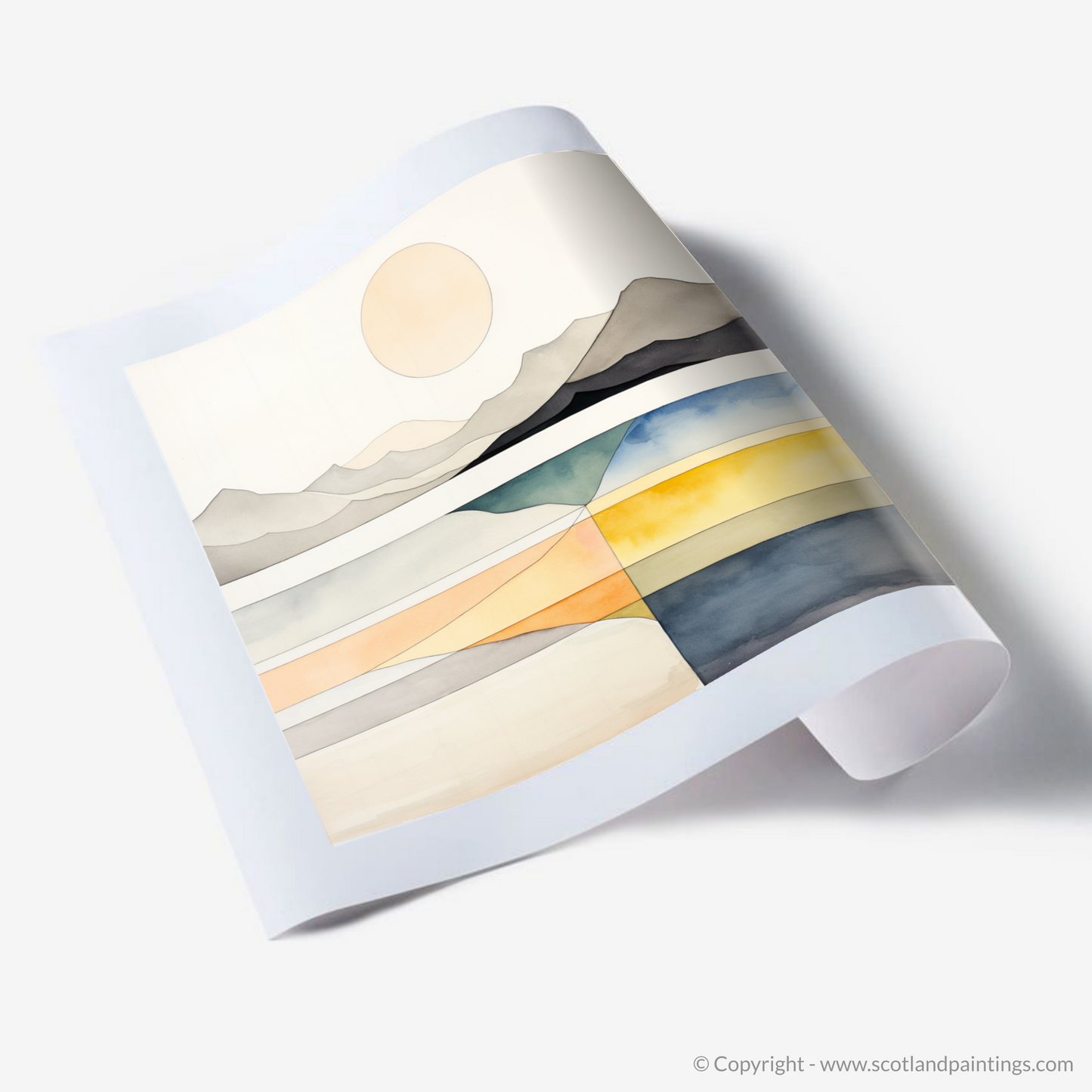 A harmony of serene shades and clean lines captures the tranquil essence of Camusdarach Beach in this exquisite print from our 'Modern & Minimal' collection. The calm, pale circle of the sun hangs elegantly in a stark, uncluttered sky, while the subtle undulations of the distant mountains are rendered in monochrome, their silhouettes portraying a quiet majesty.