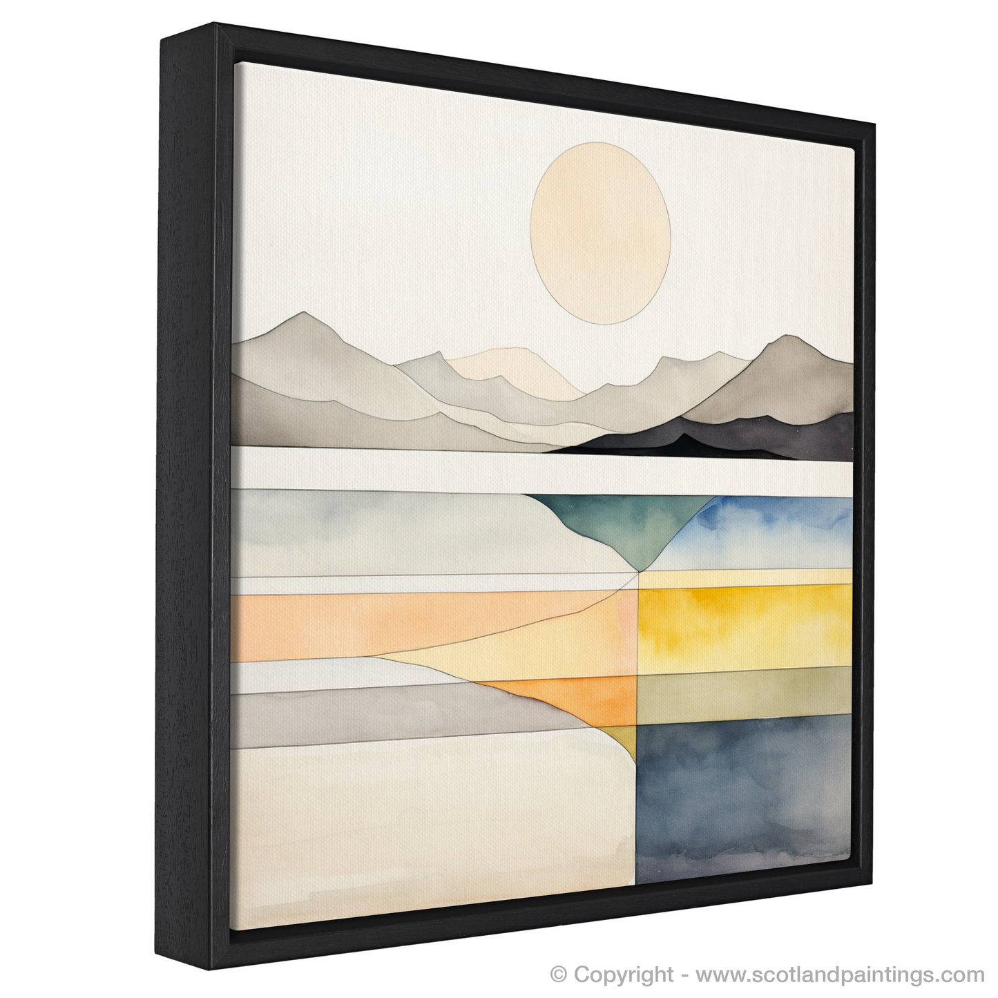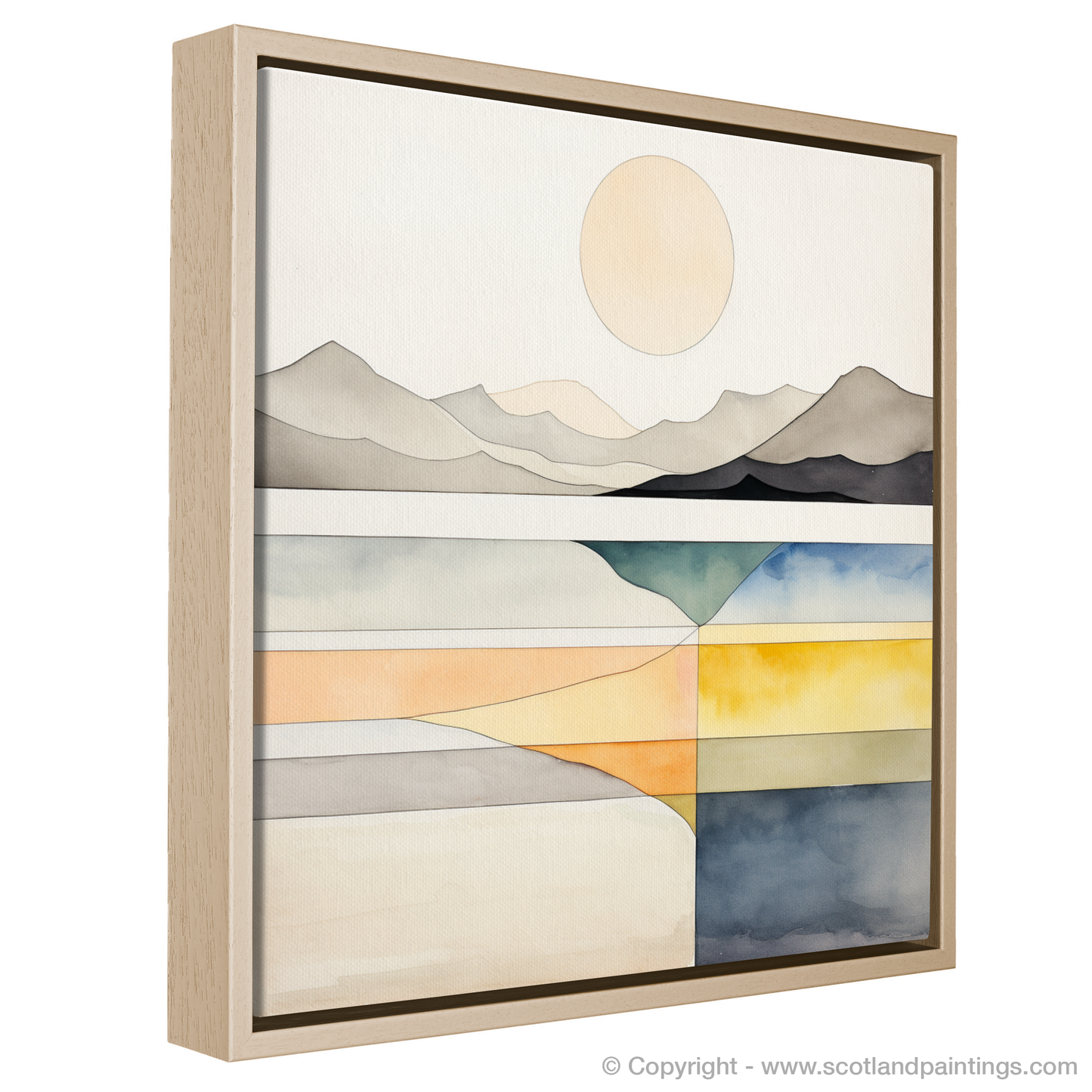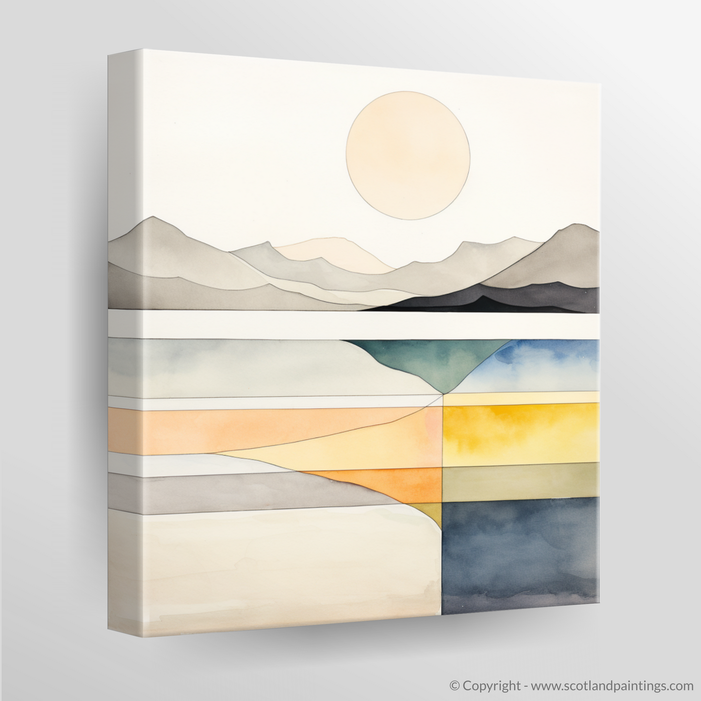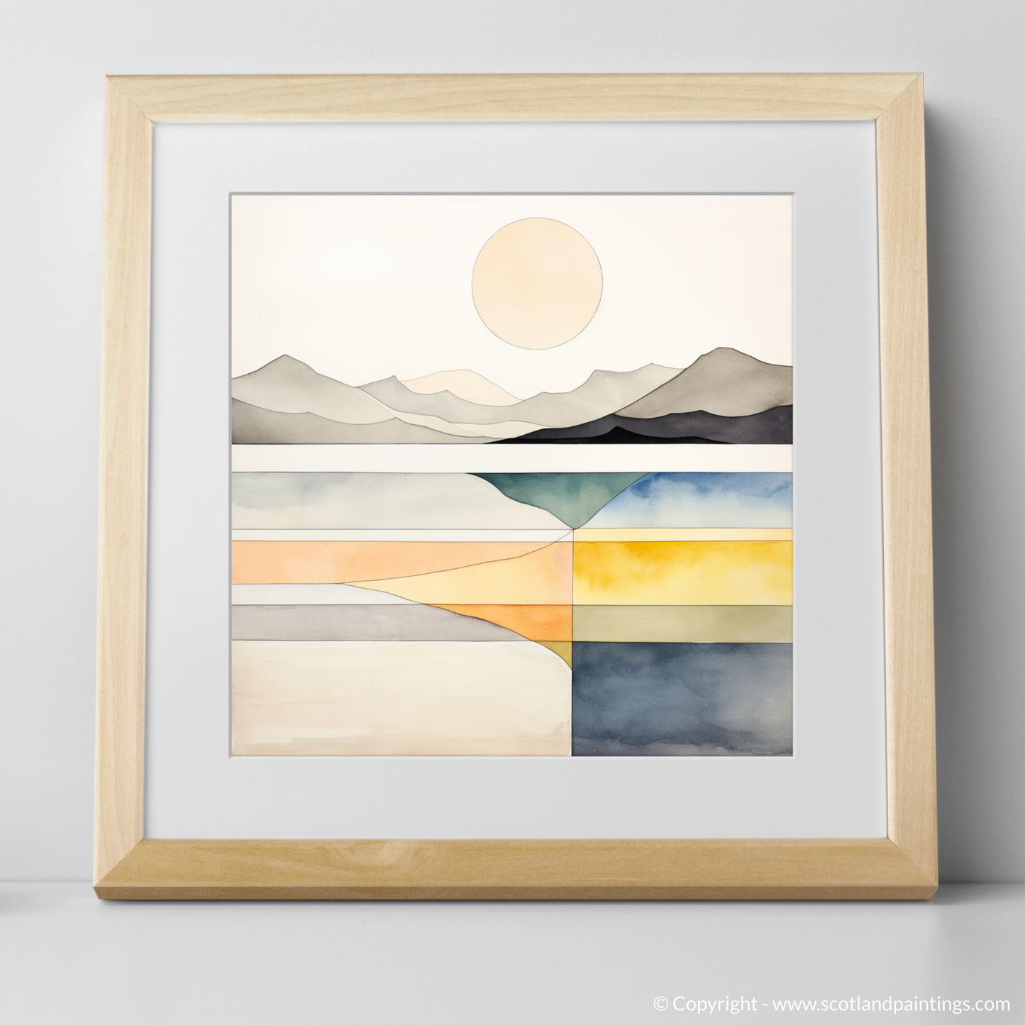 A harmony of serene shades and clean lines captures the tranquil essence of Camusdarach Beach in this exquisite print from our 'Modern & Minimal' collection. The calm, pale circle of the sun hangs elegantly in a stark, uncluttered sky, while the subtle undulations of the distant mountains are rendered in monochrome, their silhouettes portraying a quiet majesty.