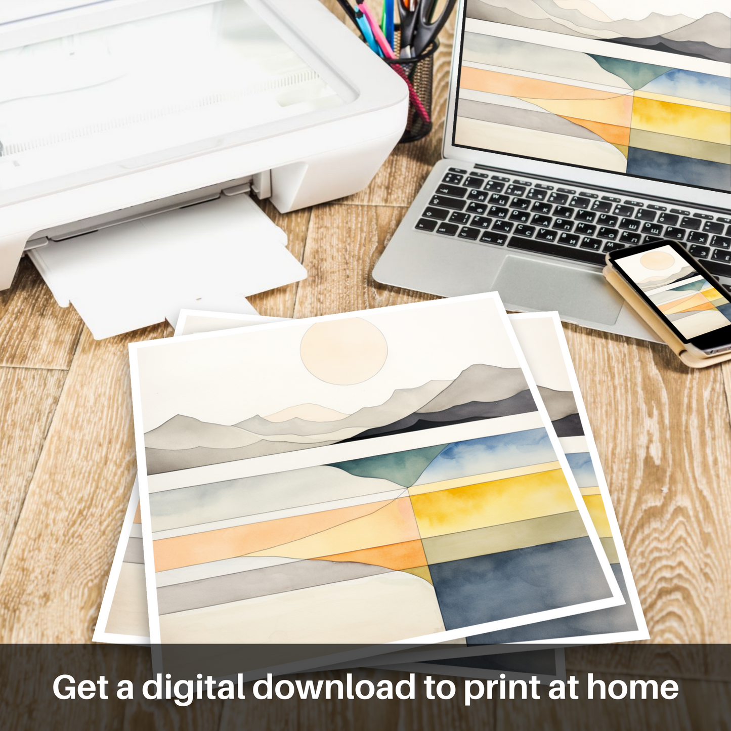 Below, an abstract interpretation of the beach's allure unfolds through layered blocks of colour, each one transitioning smoothly from sandy neutrals to the vivid oranges of a setting sun, and then to the ocean's mesmerising spectrum of blues and greys. This thoughtful use of colour not only encapsulates the beach's natural beauty but also evokes the cool, reflective stillness of the water and sand dunes, which are a signature of this stunning locale.
