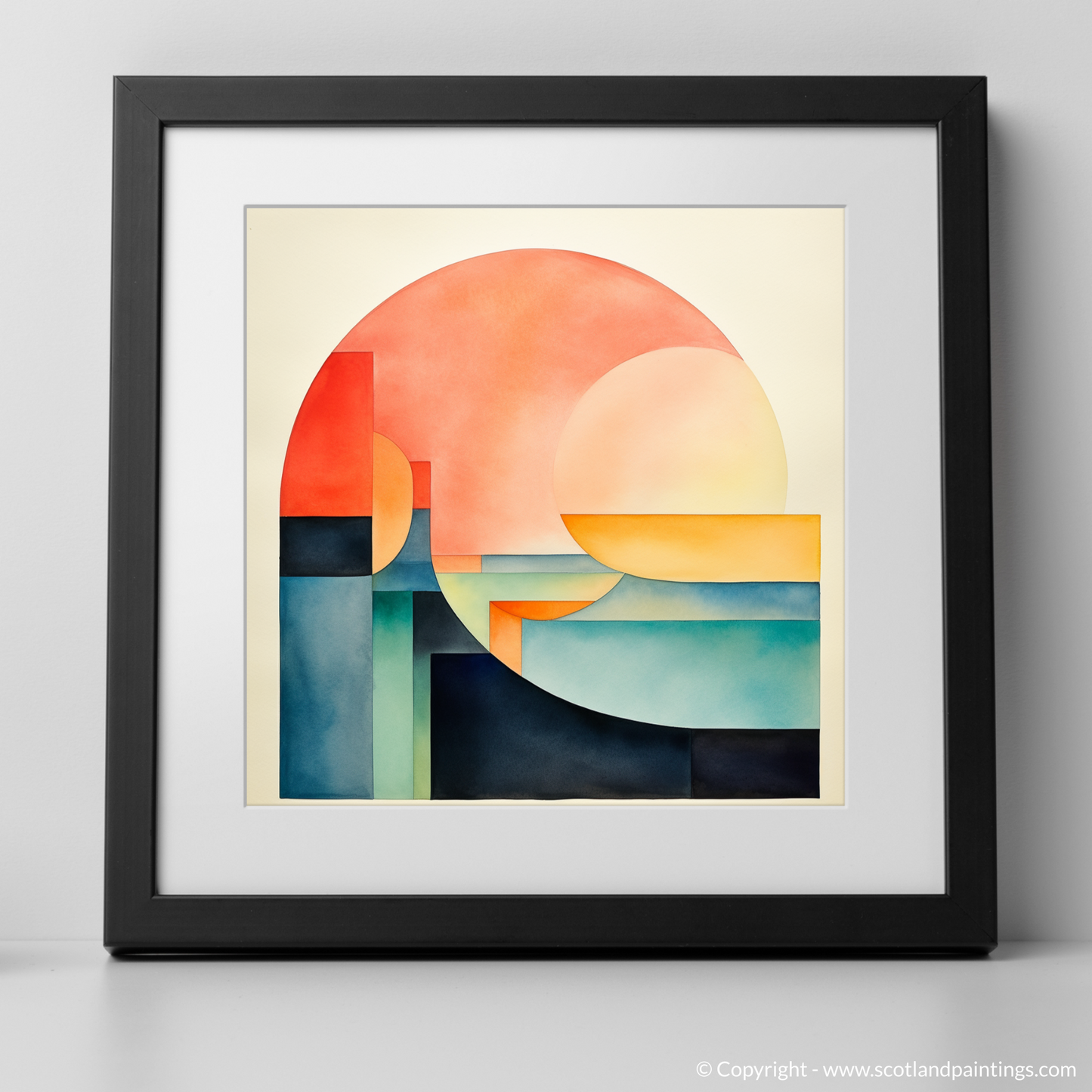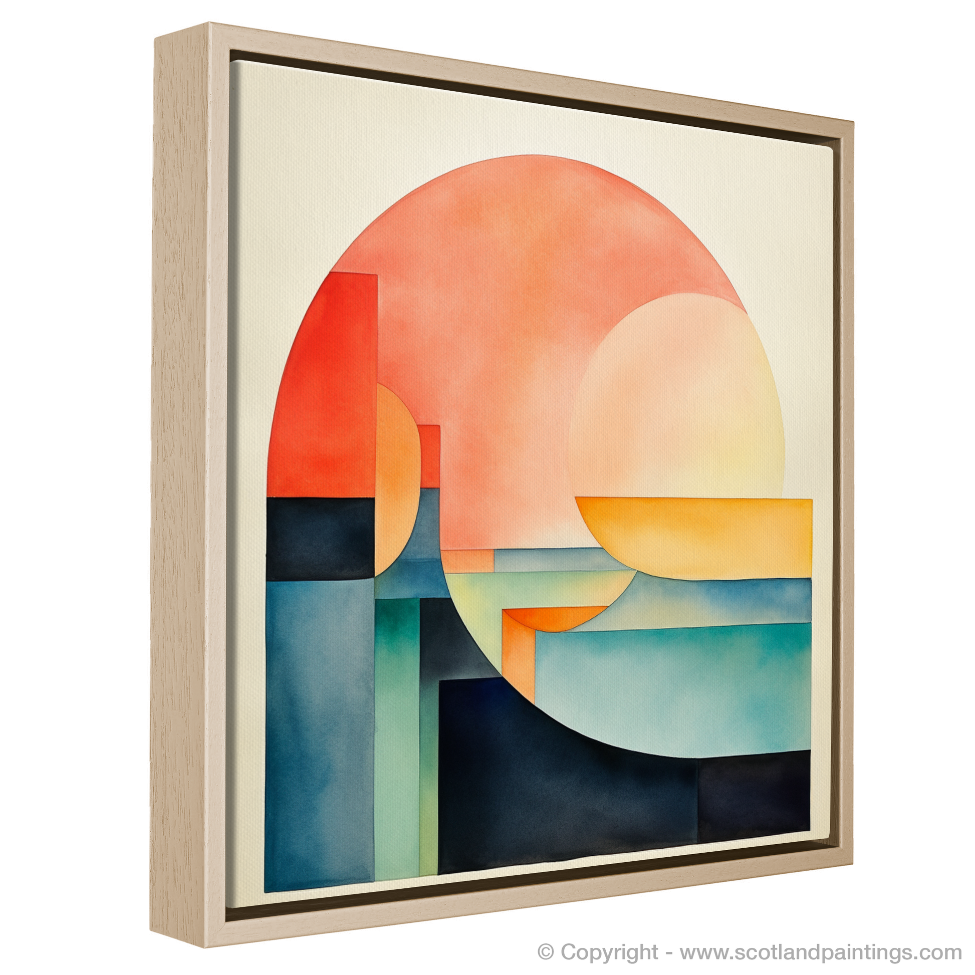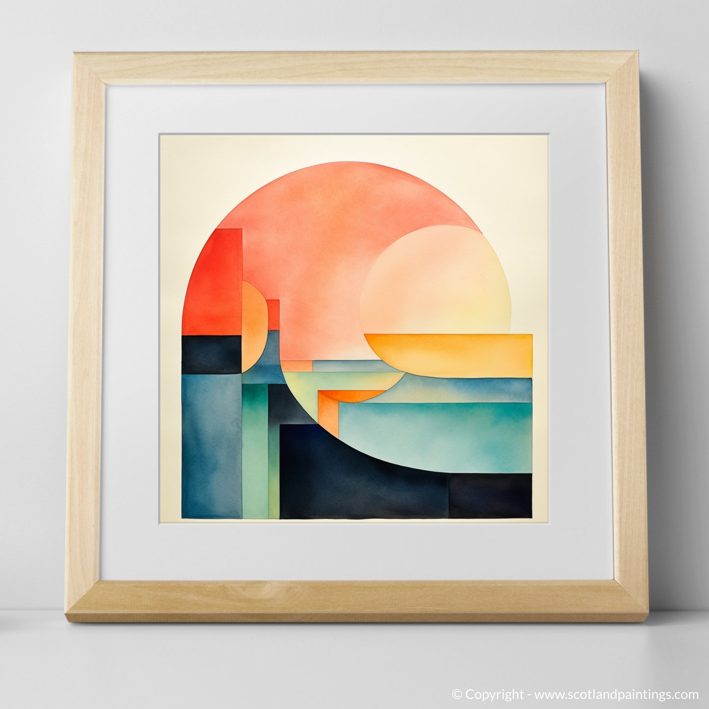 Minimalist in approach, each shape is carefully placed to create a sense of balance and stillness. Subtle gradients impart depth, drawing the eye through the stratified landscape and watery depths to explore the interplay of light and form.