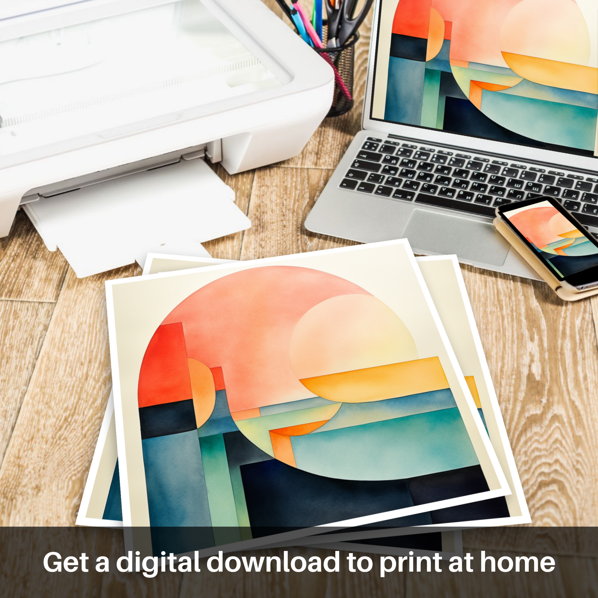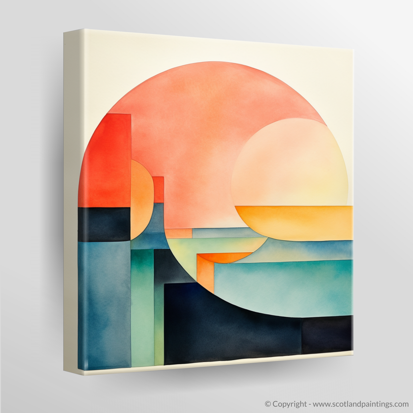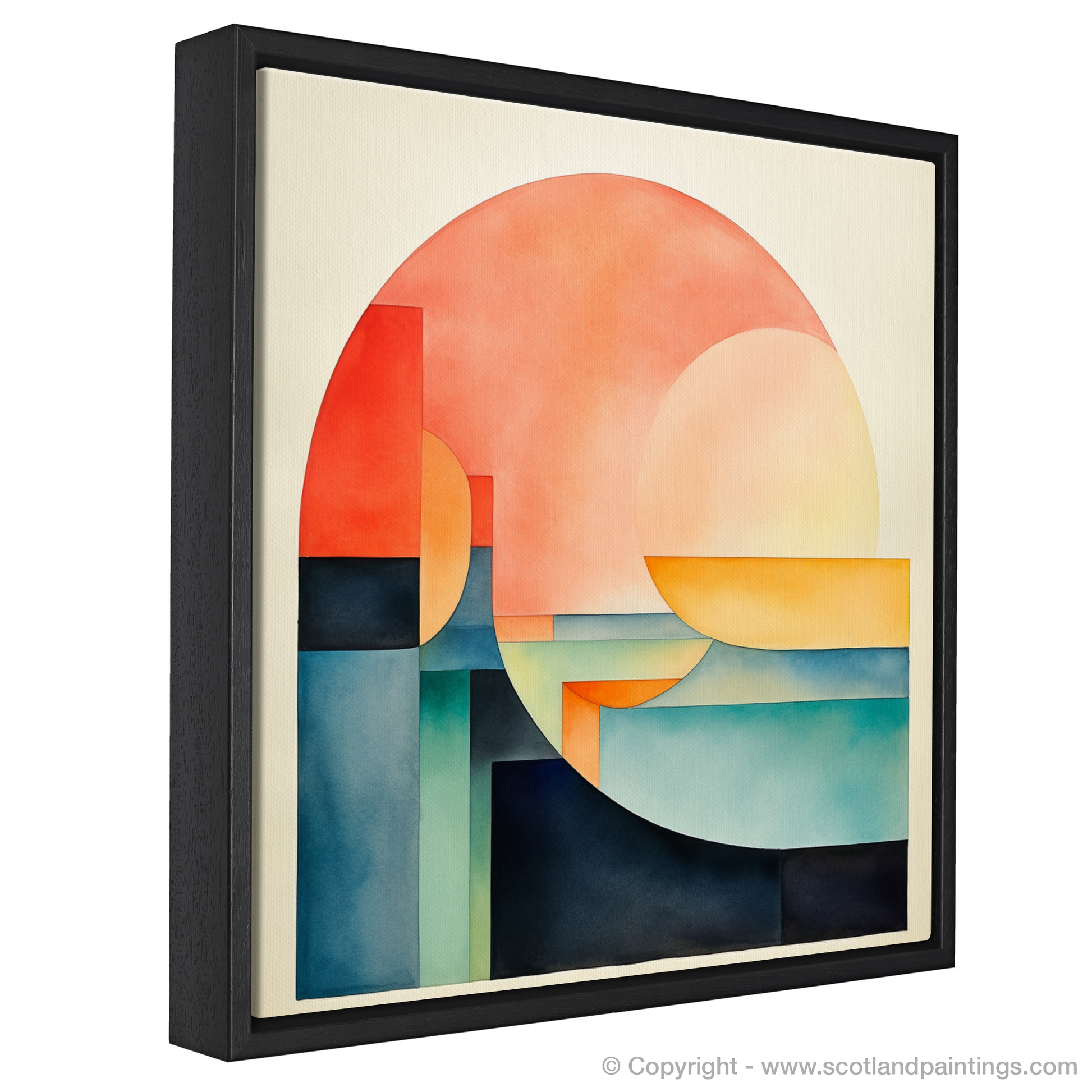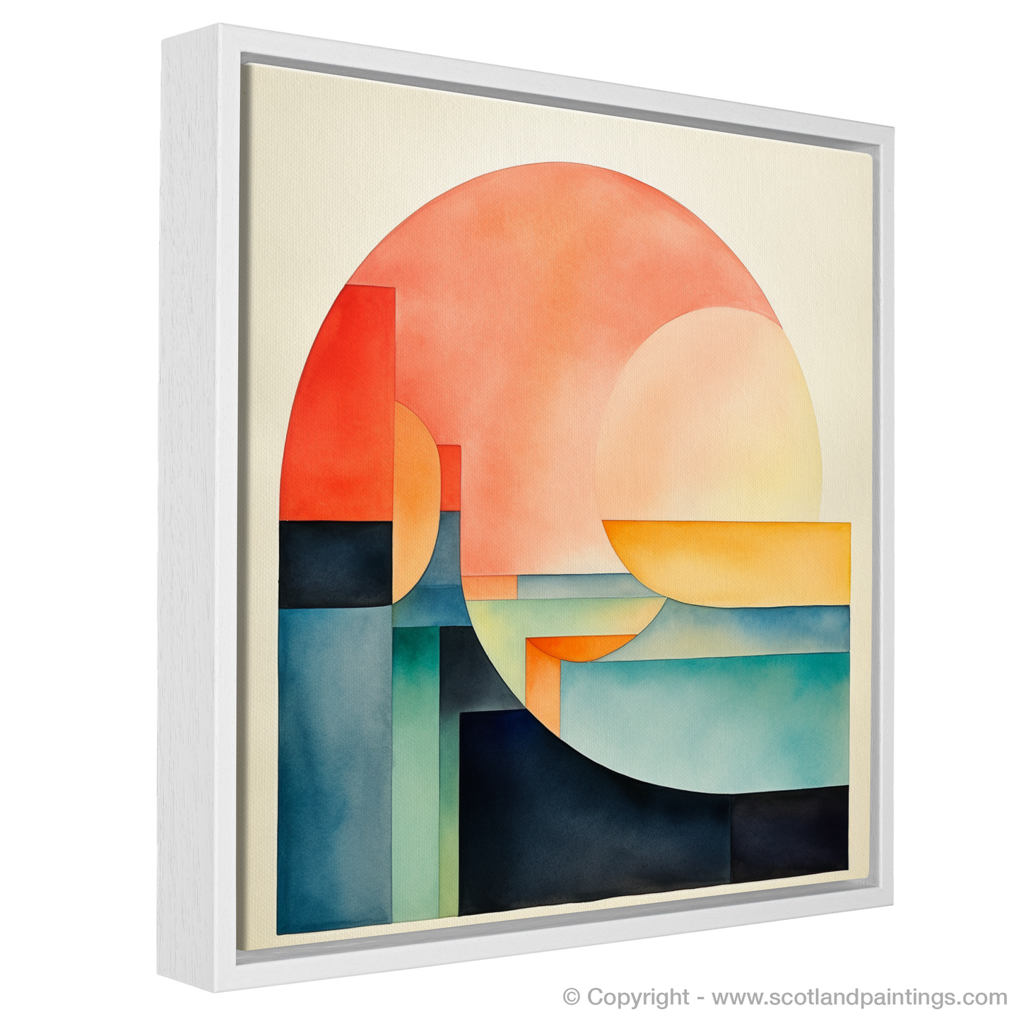 Minimalist in approach, each shape is carefully placed to create a sense of balance and stillness. Subtle gradients impart depth, drawing the eye through the stratified landscape and watery depths to explore the interplay of light and form.