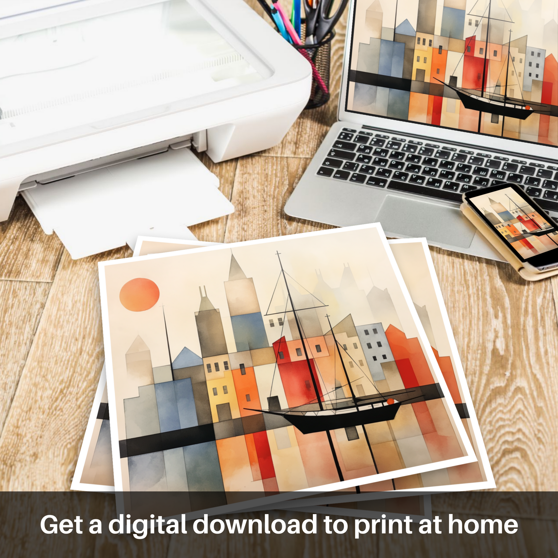 The backdrop is an abstracted cityscape, reflecting the unique architecture of the storied harbour town, simplified to geometric shapes that suggest a skyline rather than dictate it. Each form is a distillation of structure, from the sharp points of gabled roofs to the oblong windows and doors that punctuate the façade.