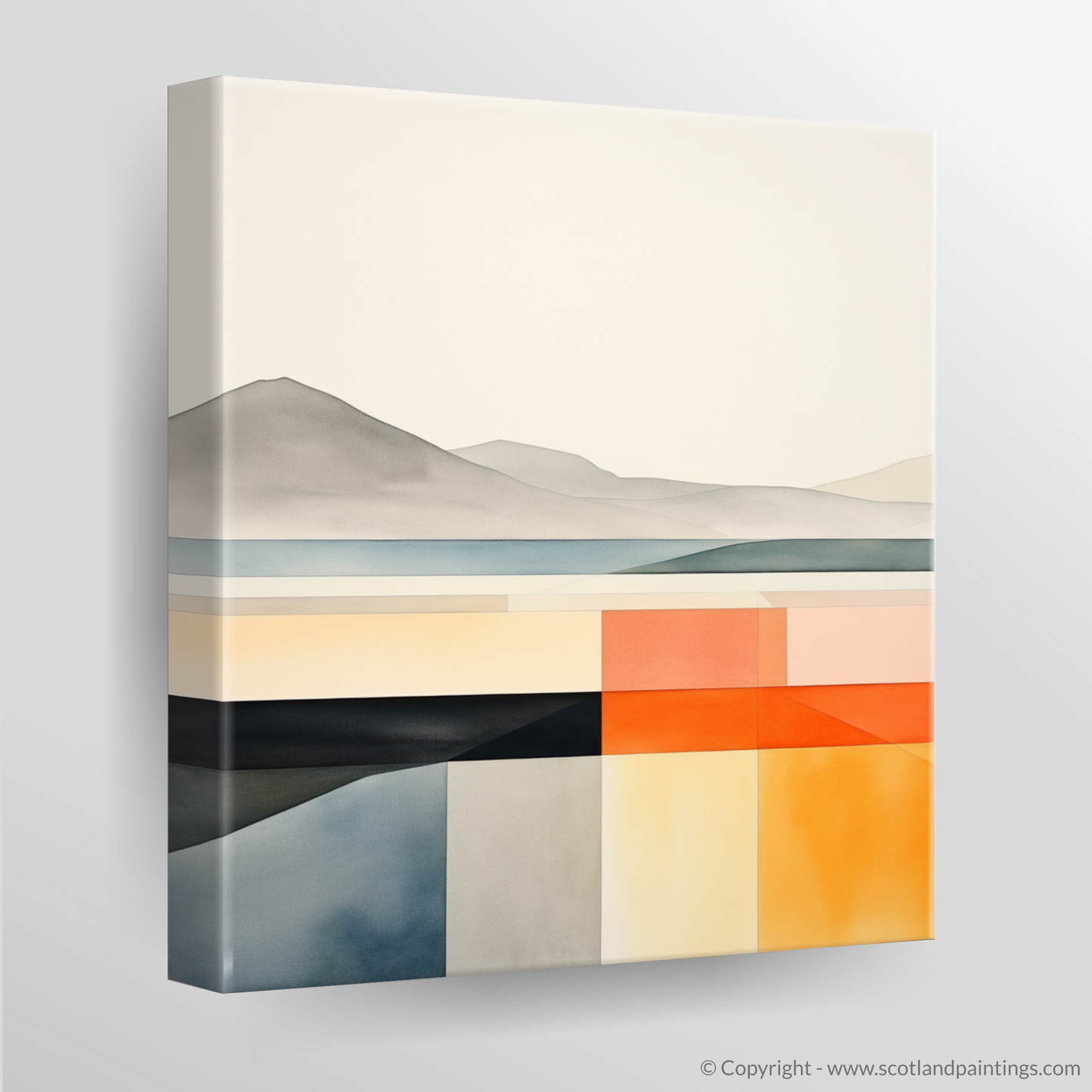 Below the horizon, a tapestry of squares and rectangles in a spectrum of colours echoes the natural textures and layers found at Luskentyre. Warm earthy tones of sand, from pale cream to burnt orange, mix with cool greys and slate blues, evoking reflections of the sun's dance across the water and the shadows cast by the surrounding terrain.