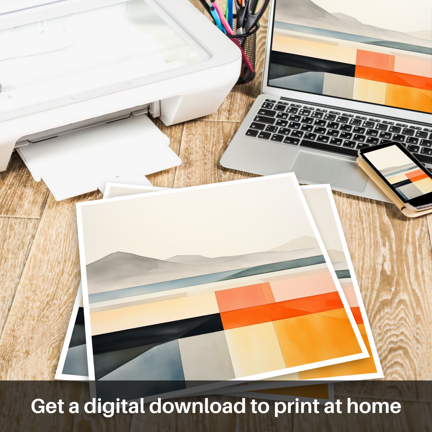 Transitioning seamlessly below, the artwork presents an abstract representation of the shoreline’s splendour through geometric shapes and blocks of colour. The crisp horizon line anchors a juxtaposition of varying shades and tones. A deep navy strip hints at the ocean's vast expanse, offering a sharp contrast to the ethereal landscape above.