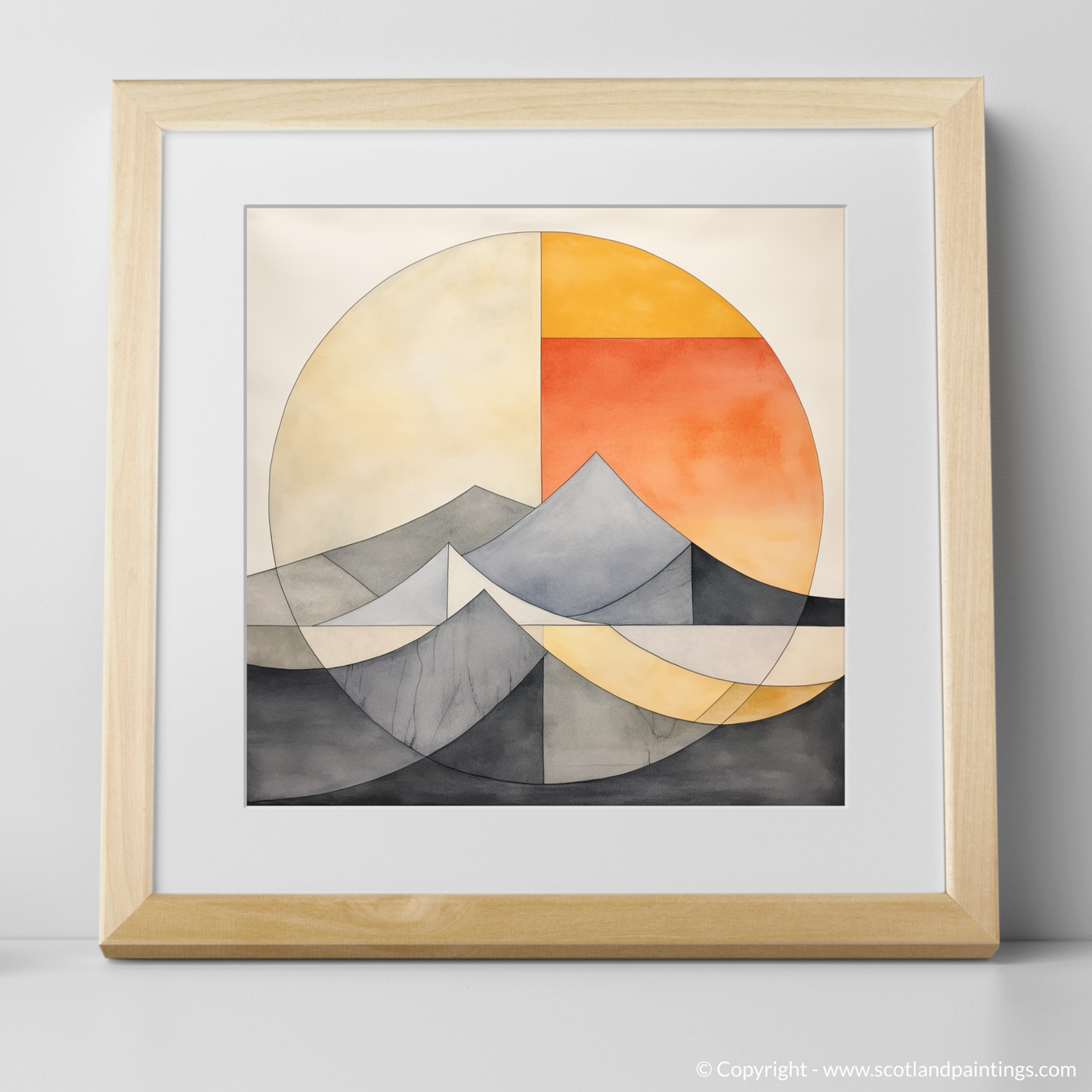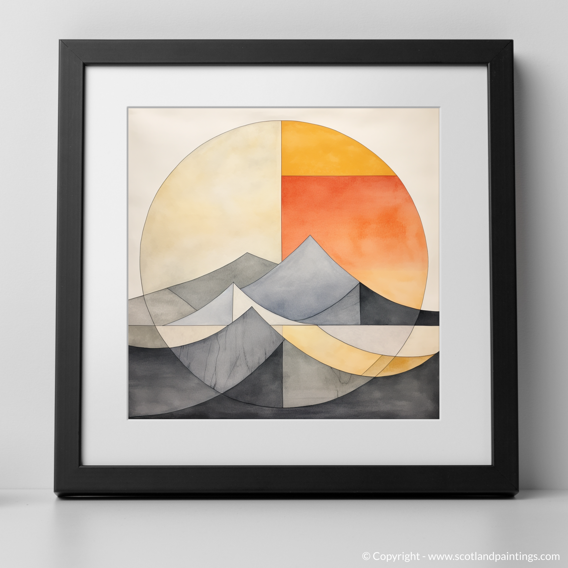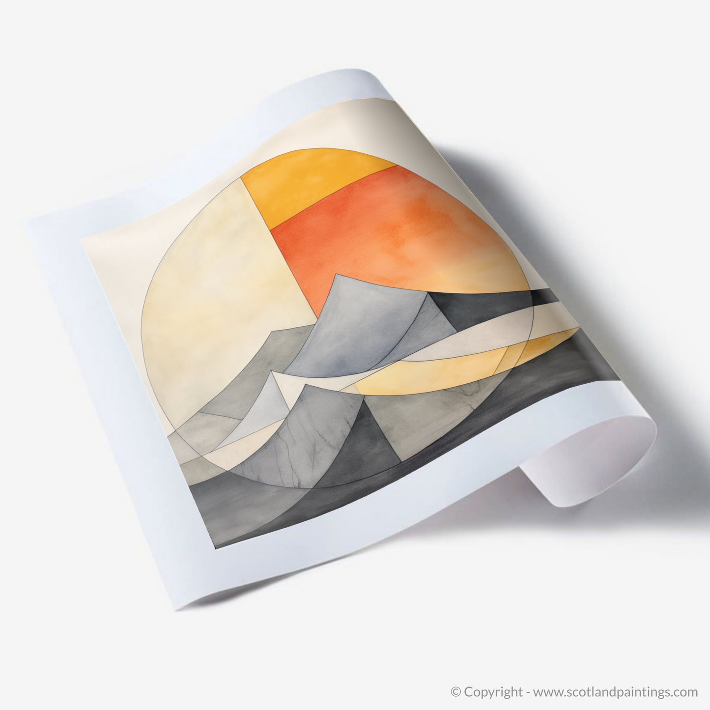 In a captivating fusion of colour and form, this standout piece captures the essence of Aonach Beag through a minimalist lens. The print invites the viewer to explore the grandeur of the highlands with stylised geometric shapes that abstractly represent the majestic peaks and valleys. The artwork features a harmonious palette, where earthy greys and bold blacks form undulating mountain forms, grounding the composition with a sense of tranquillity and strength. A sweeping arc dominates the visual field, artfully segmented into creams, subtle yellow, and a striking burnt orange, invoking the awe of a setting sun against a vast, open sky.