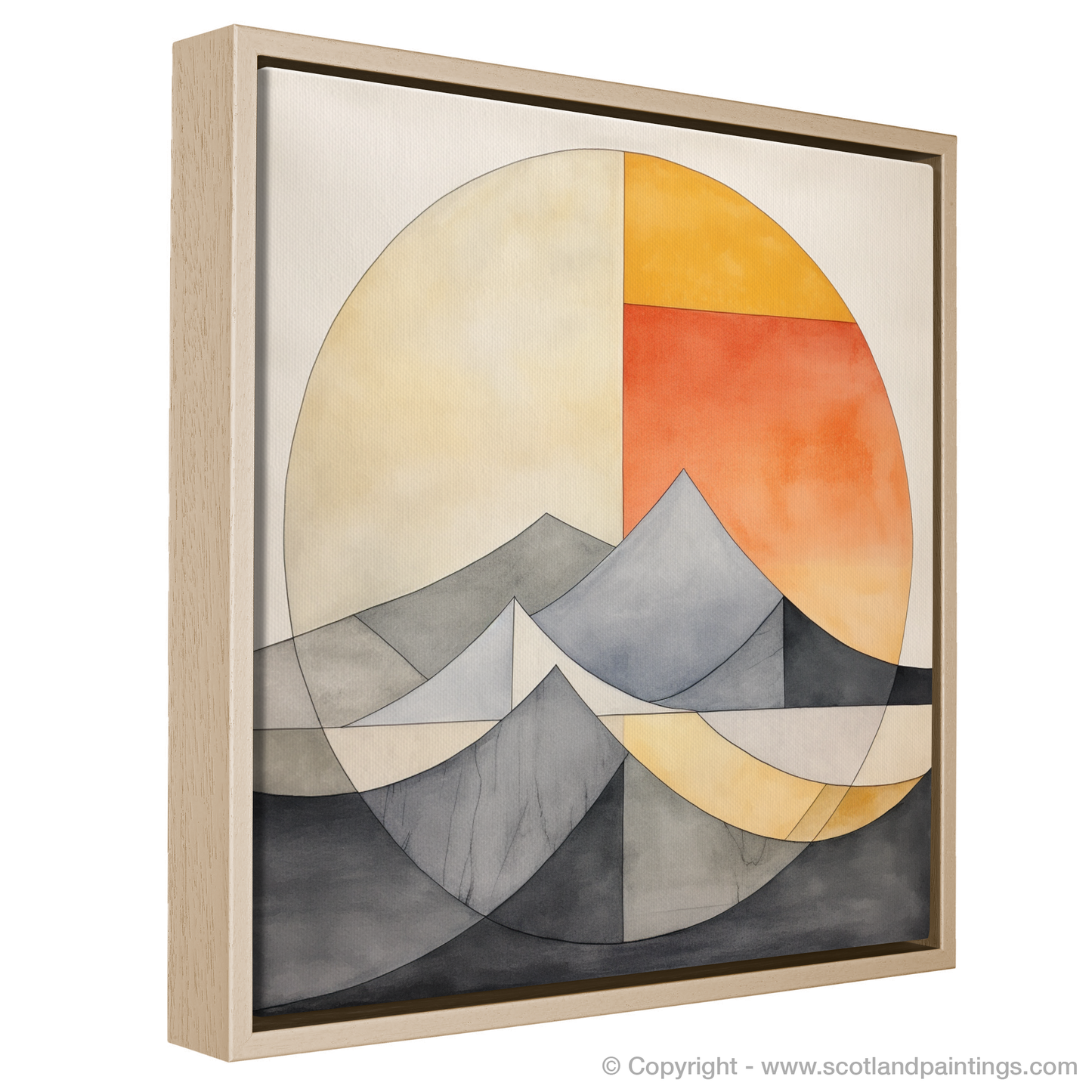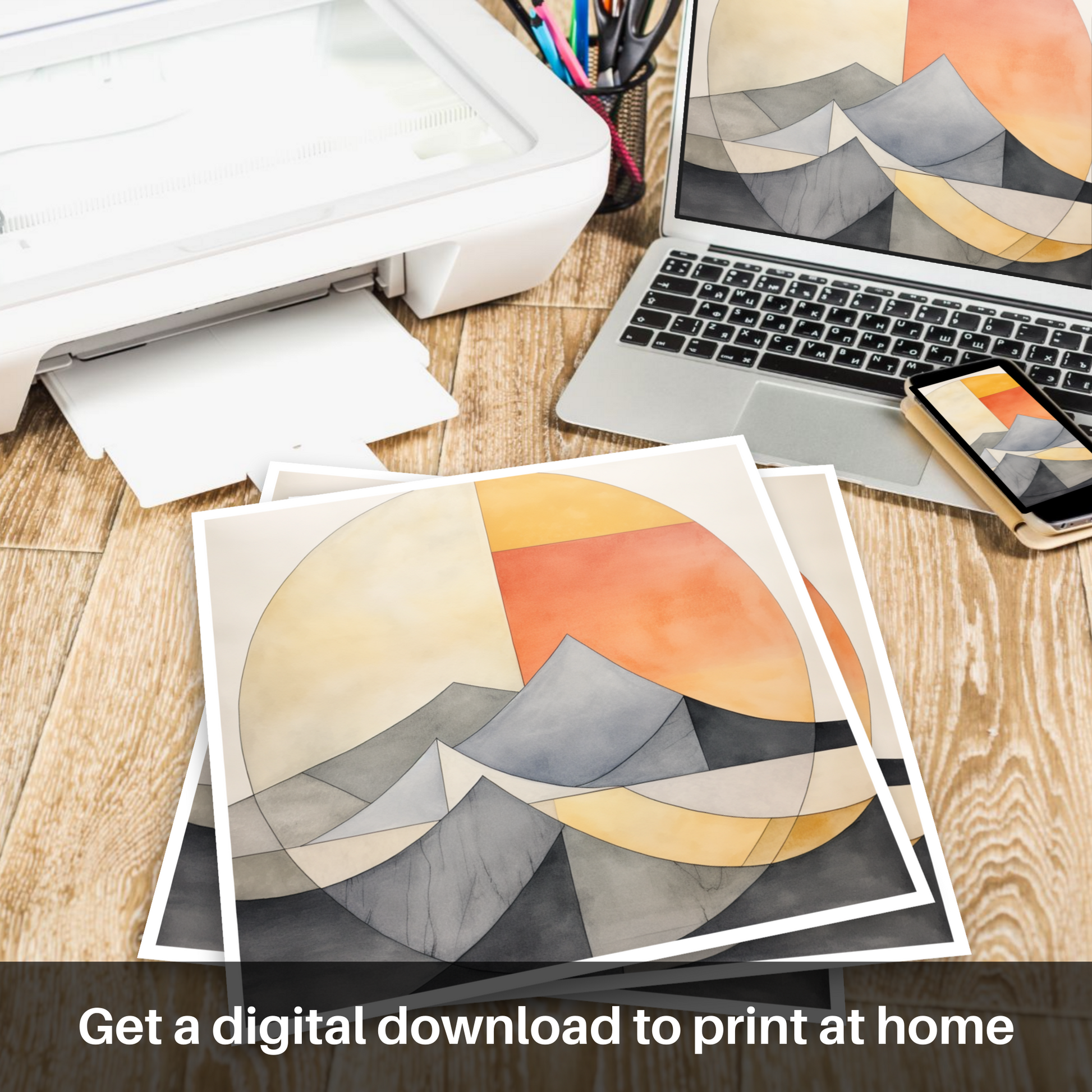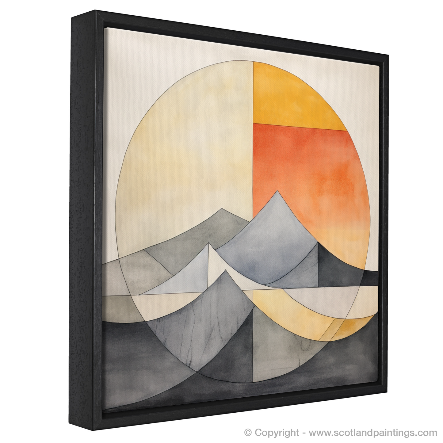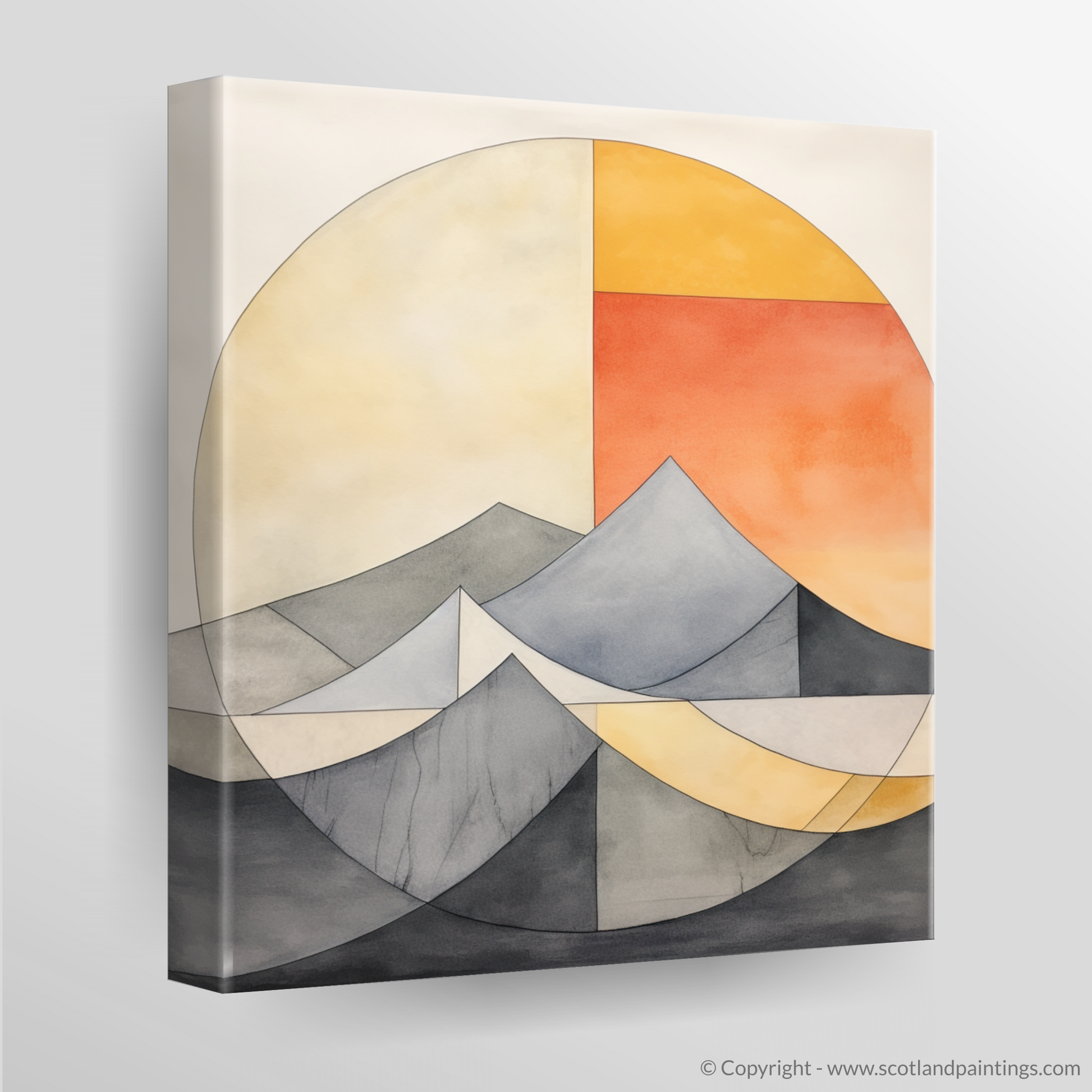 In a captivating fusion of colour and form, this standout piece captures the essence of Aonach Beag through a minimalist lens. The print invites the viewer to explore the grandeur of the highlands with stylised geometric shapes that abstractly represent the majestic peaks and valleys. The artwork features a harmonious palette, where earthy greys and bold blacks form undulating mountain forms, grounding the composition with a sense of tranquillity and strength. A sweeping arc dominates the visual field, artfully segmented into creams, subtle yellow, and a striking burnt orange, invoking the awe of a setting sun against a vast, open sky.