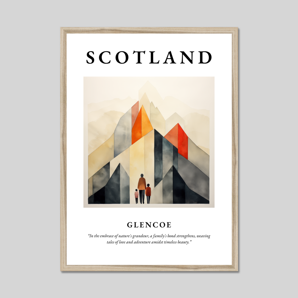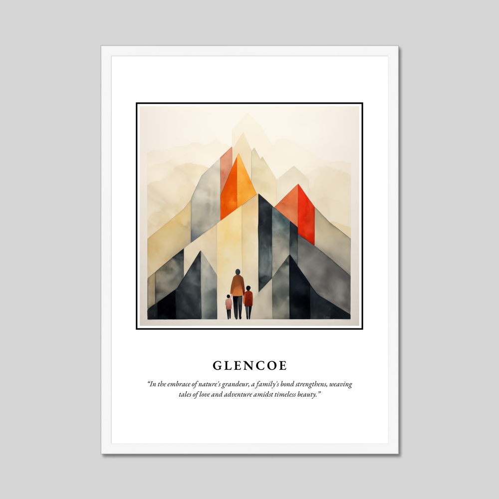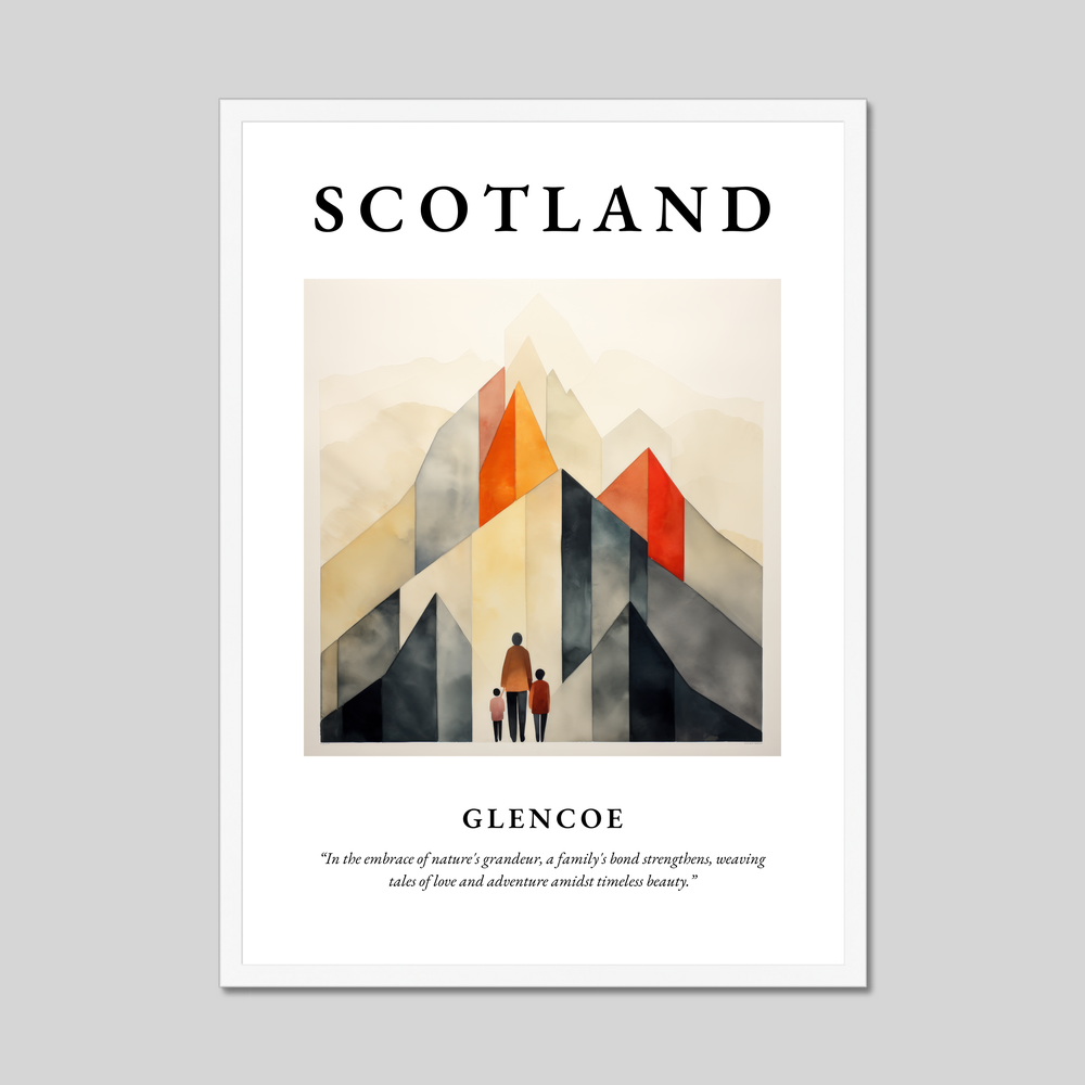 Glencoe is a place of timeless beauty and historical resonance, nestled in the heart of the Scottish Highlands. Often considered one of Scotland’s most awe-inspiring regions, it is a tapestry of towering mountains, serene lochs, and sweeping vistas. The painting masterfully encapsulates the spirit of Glencoe—a place where natural grandeur meets human history, and where visitors are often reminded of their own stories and connections with the land. Whether you've walked its trails, soaked in its tranquillity, or dreamt of visiting, this poster invites you to experience Glencoe's magic every day.