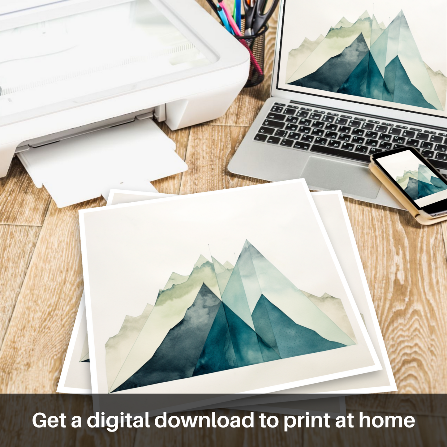 Each hue appears deliberately chosen, from the misty wash of color suggesting a distant, rain-soaked summit to the deep, almost indigo shades carving out the closer, imposing ridges. These colors coalesce to imbue the print with both depth and ethereality, creating an atmospheric mood that can turn any space into a quiet place of contemplation.