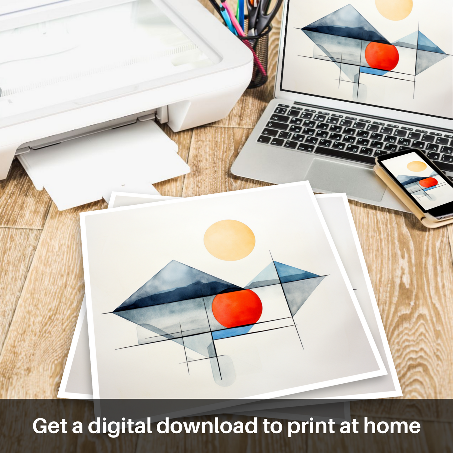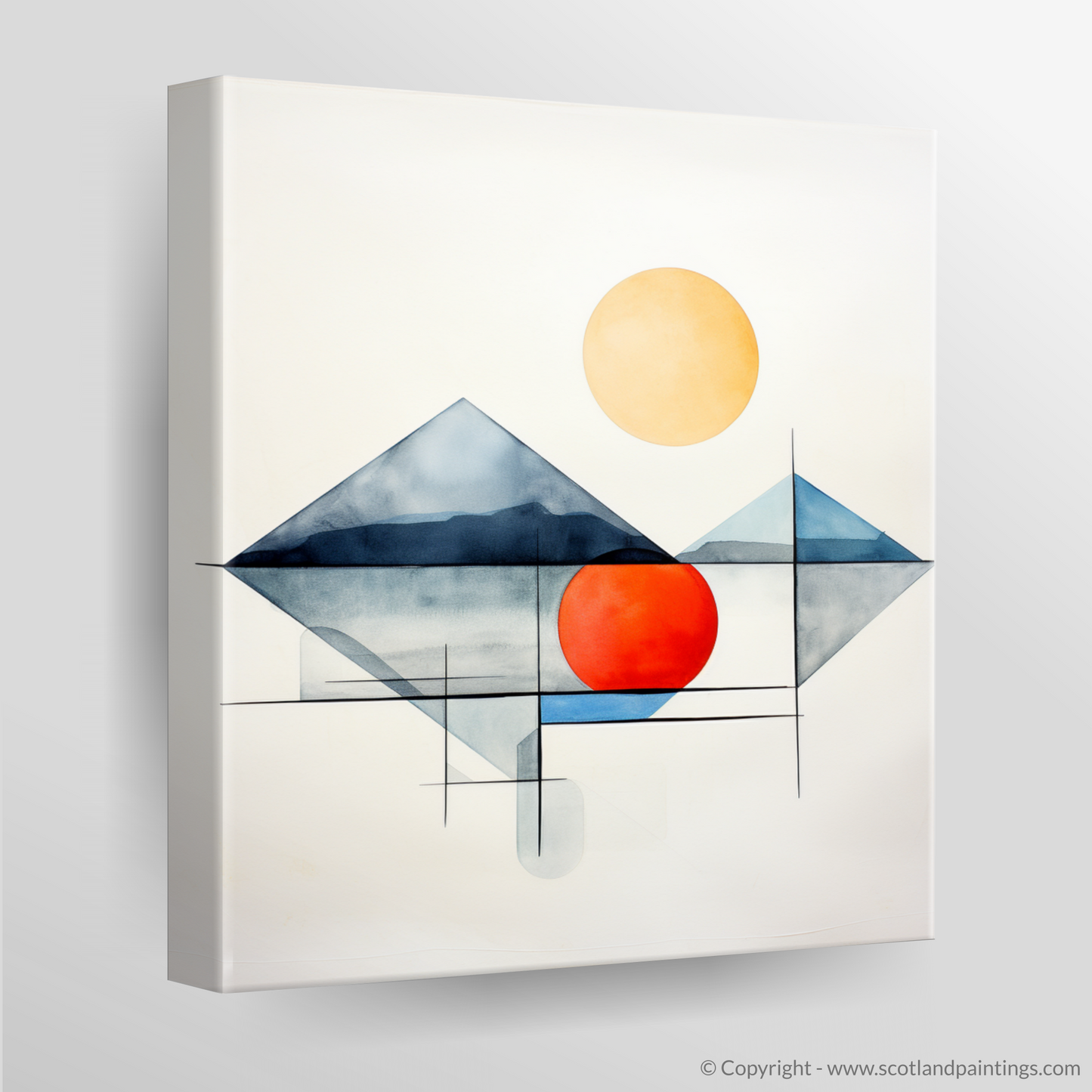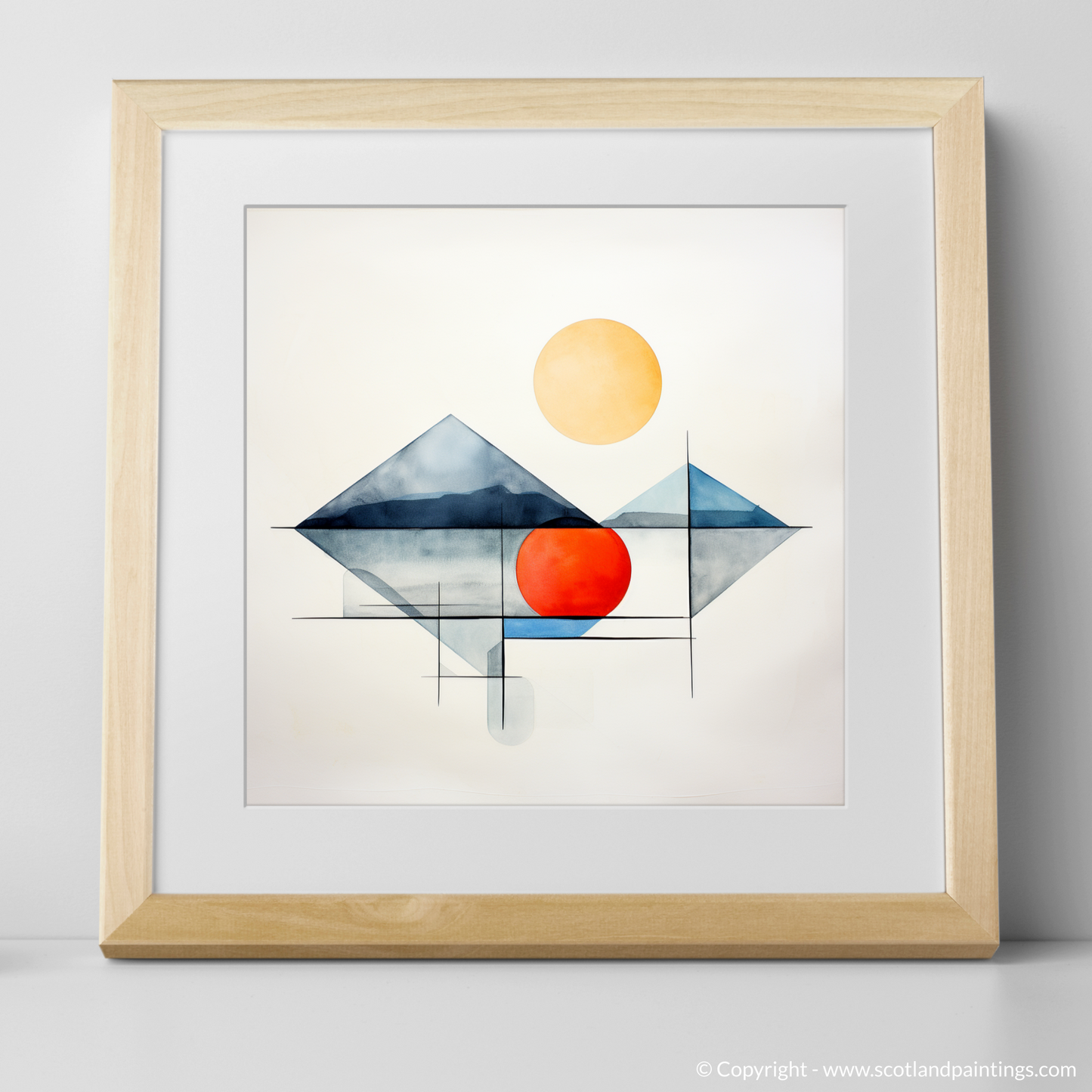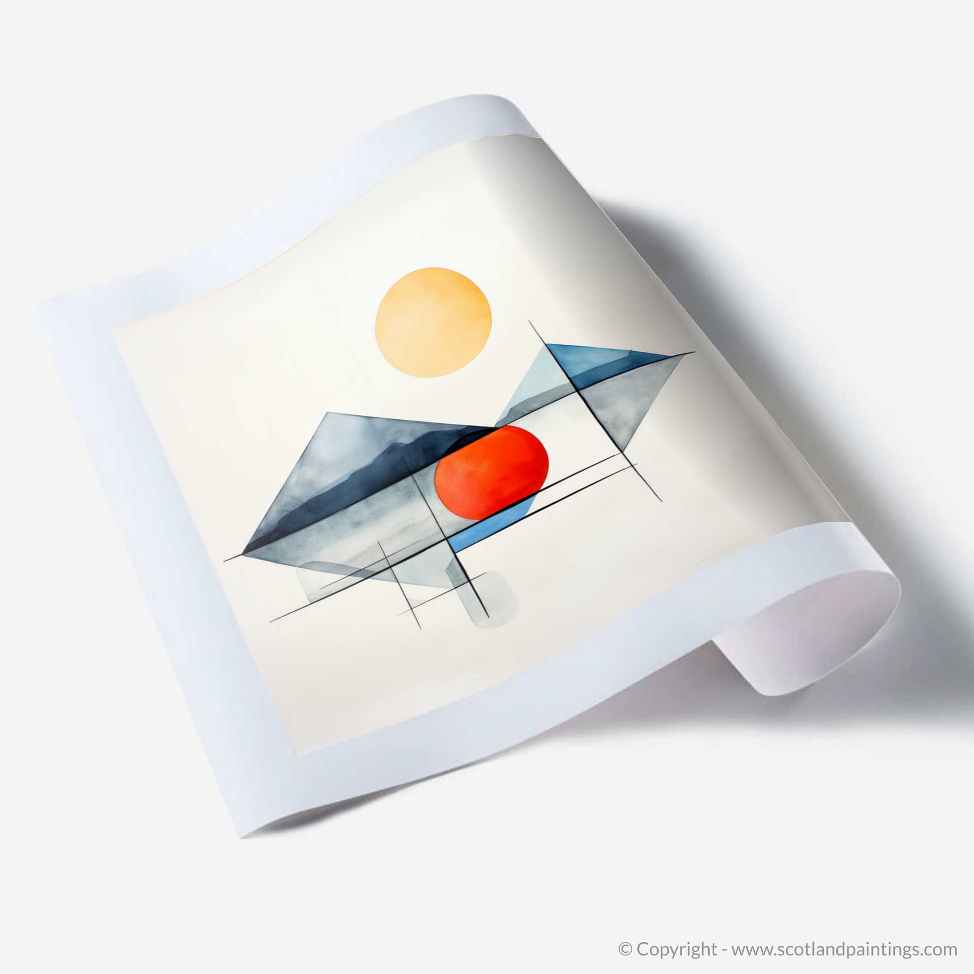 Immerse yourself in the serene simplicity of the Isle of Mull, reimagined through the lens of minimalism. This captivating piece is an ode to the tranquil beauty of the Scottish landscape, distilled into its purest geometric forms. Against the backdrop of a pristine canvas, the artwork presents a harmonious symphony of shape and colour.