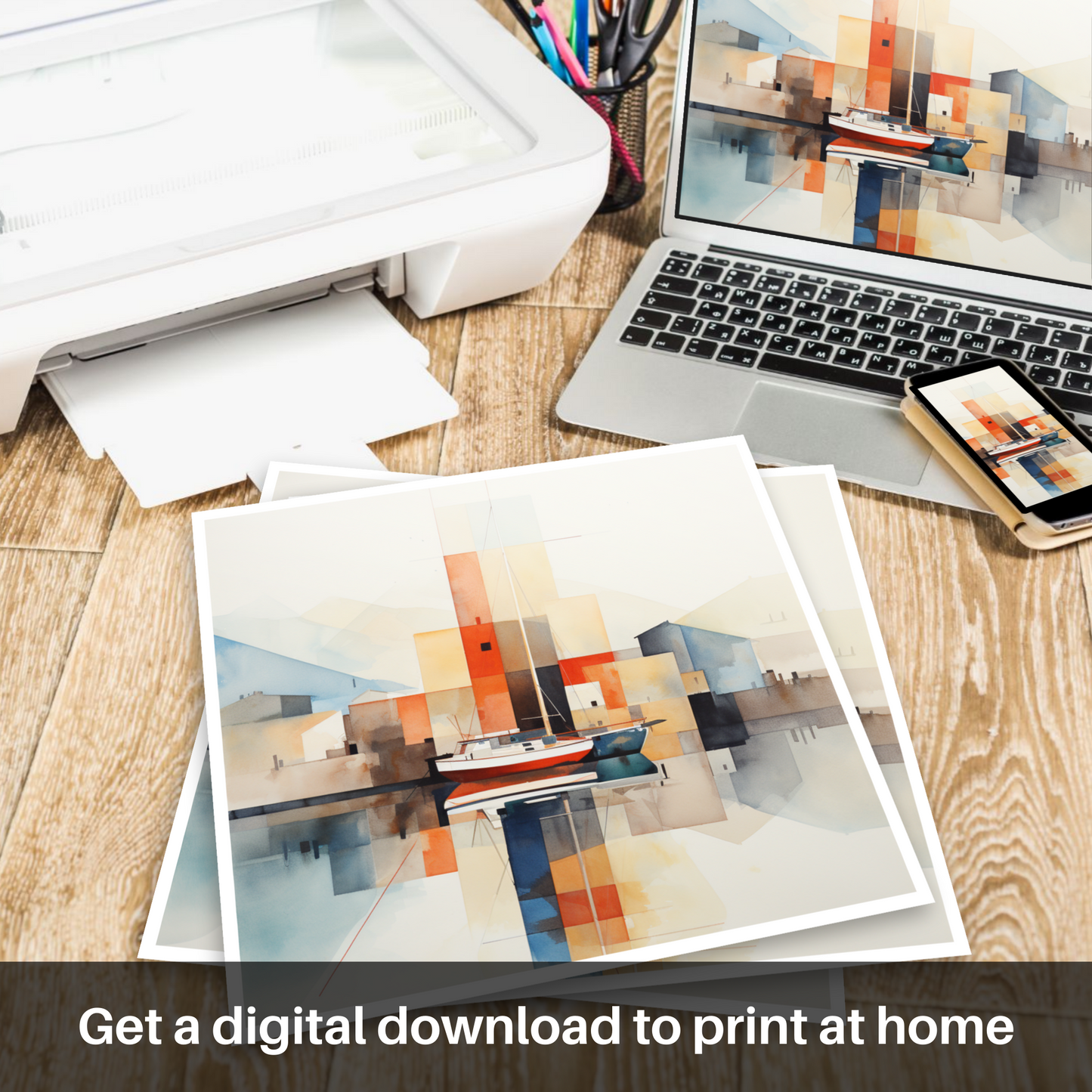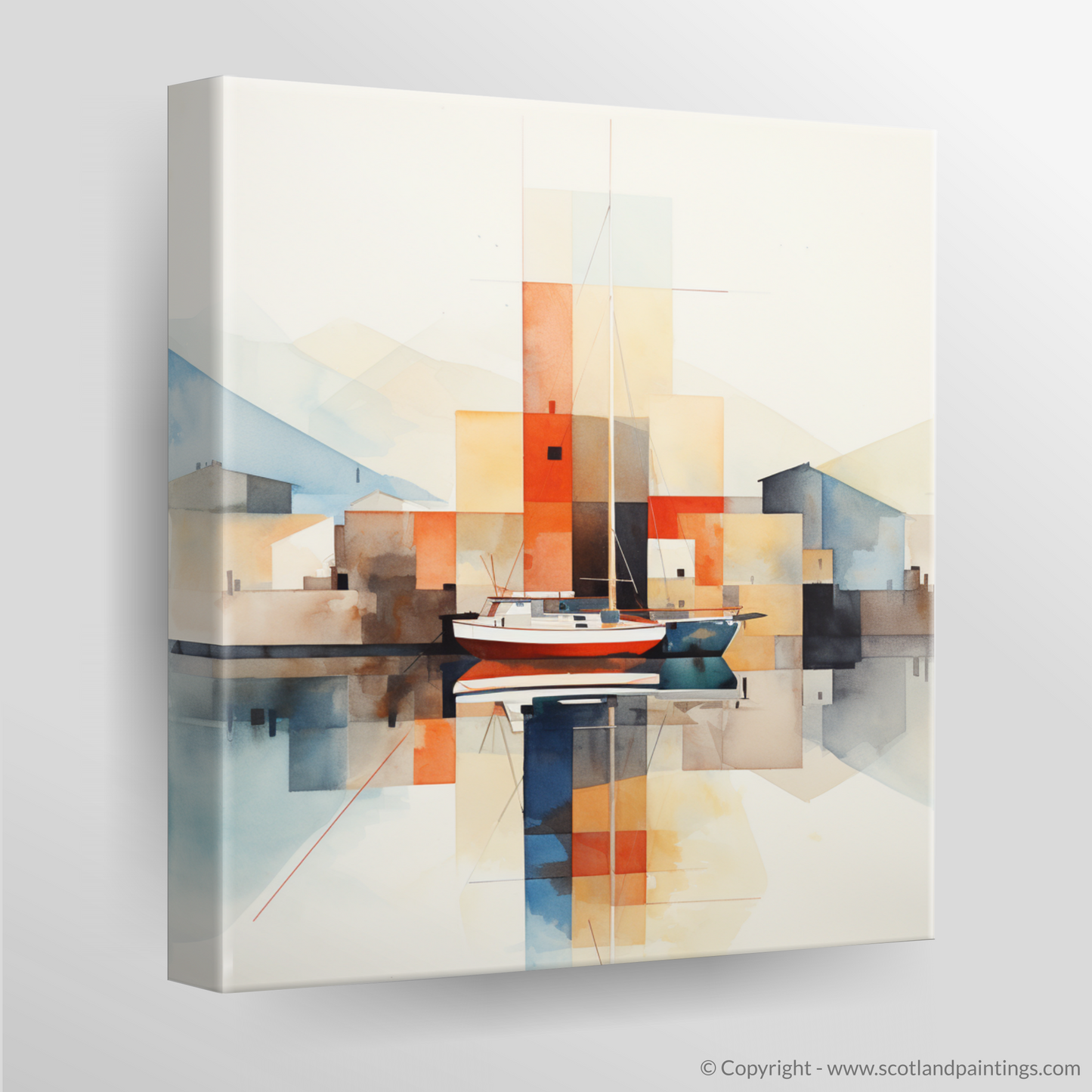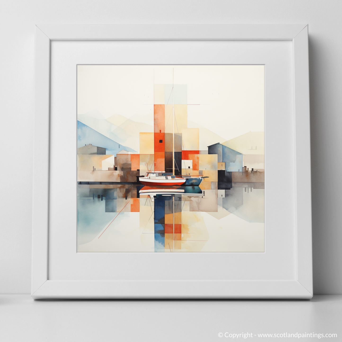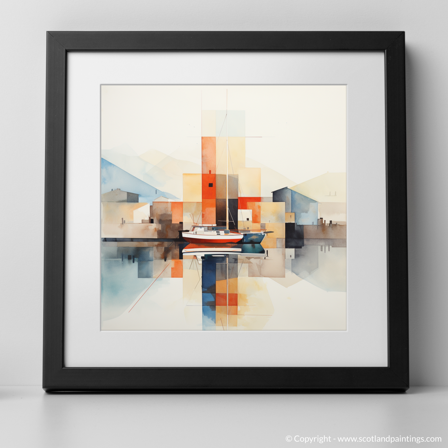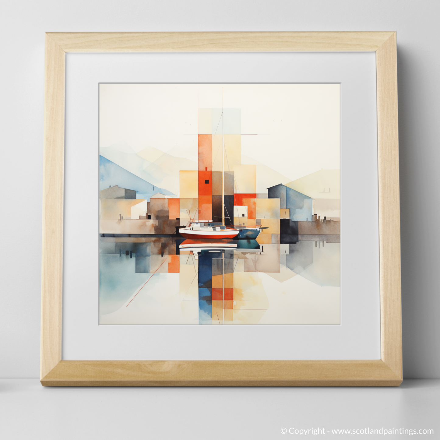 Abstract geometries meld together, carving out the architectural silhouettes of waterfront dwellings and boat houses. The palette is an ode to the natural hues of Scotland's rugged coast, with earthy tones playing alongside soft blues and gentle greys, evoking the calmness of the surrounding sea and skies.