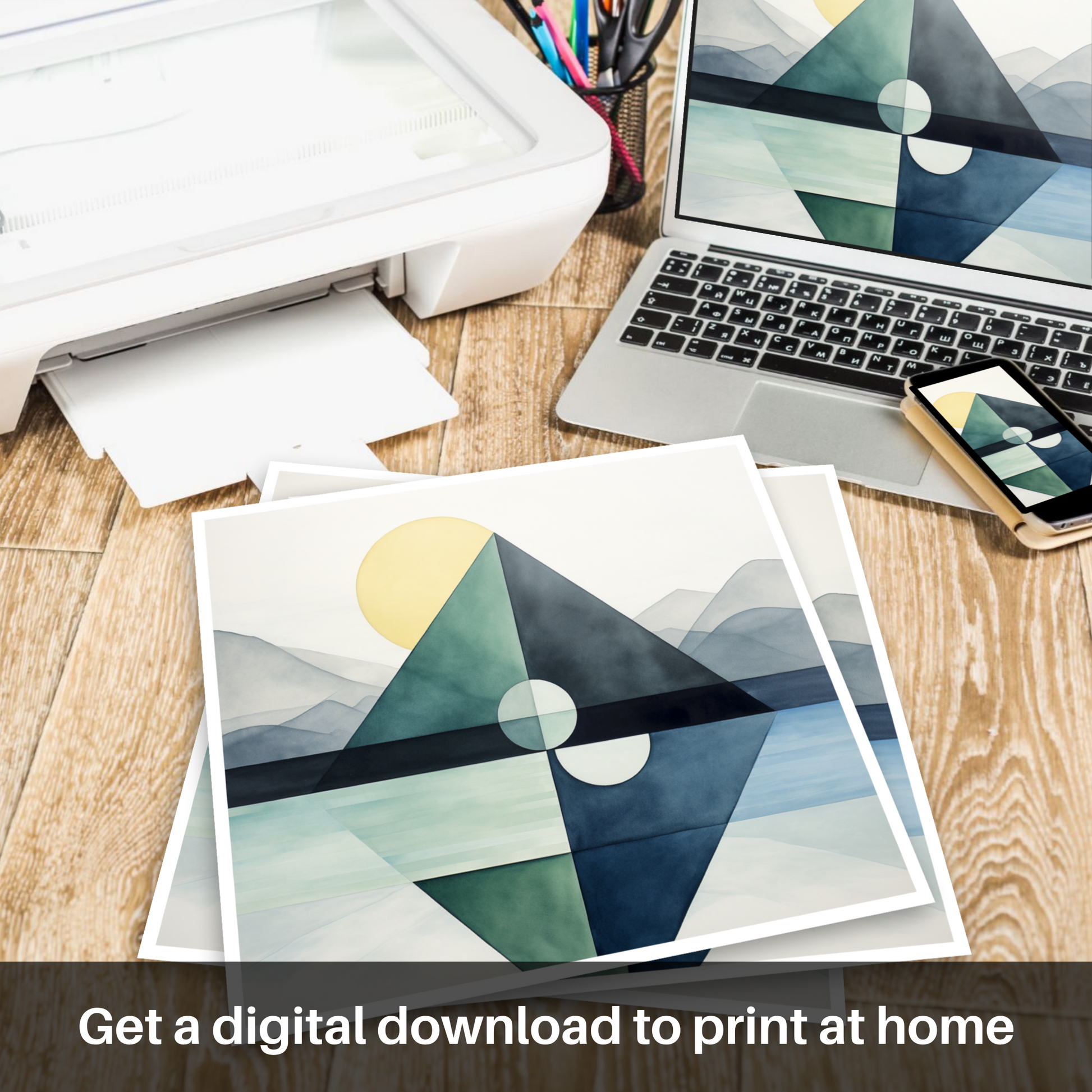 The artwork deploys a harmonious palette, blending cool blues and serene greens to mirror the placid waters of the loch, while gentle gradients suggest the soft undulations of the surrounding hills. Bold shapes intersect with grace, creating a composition that plays with symmetry and balance. A juxtaposed geometric sun casts a warming hue over the scene, its roundness contrasting the predominance of sharp angles and straight lines.