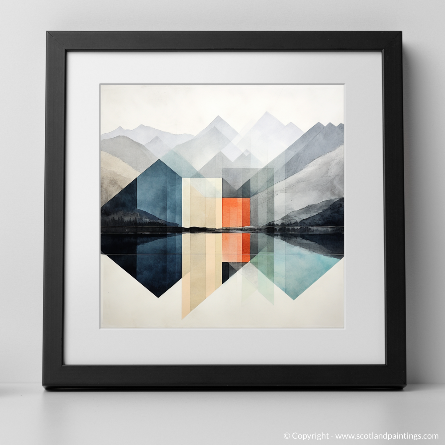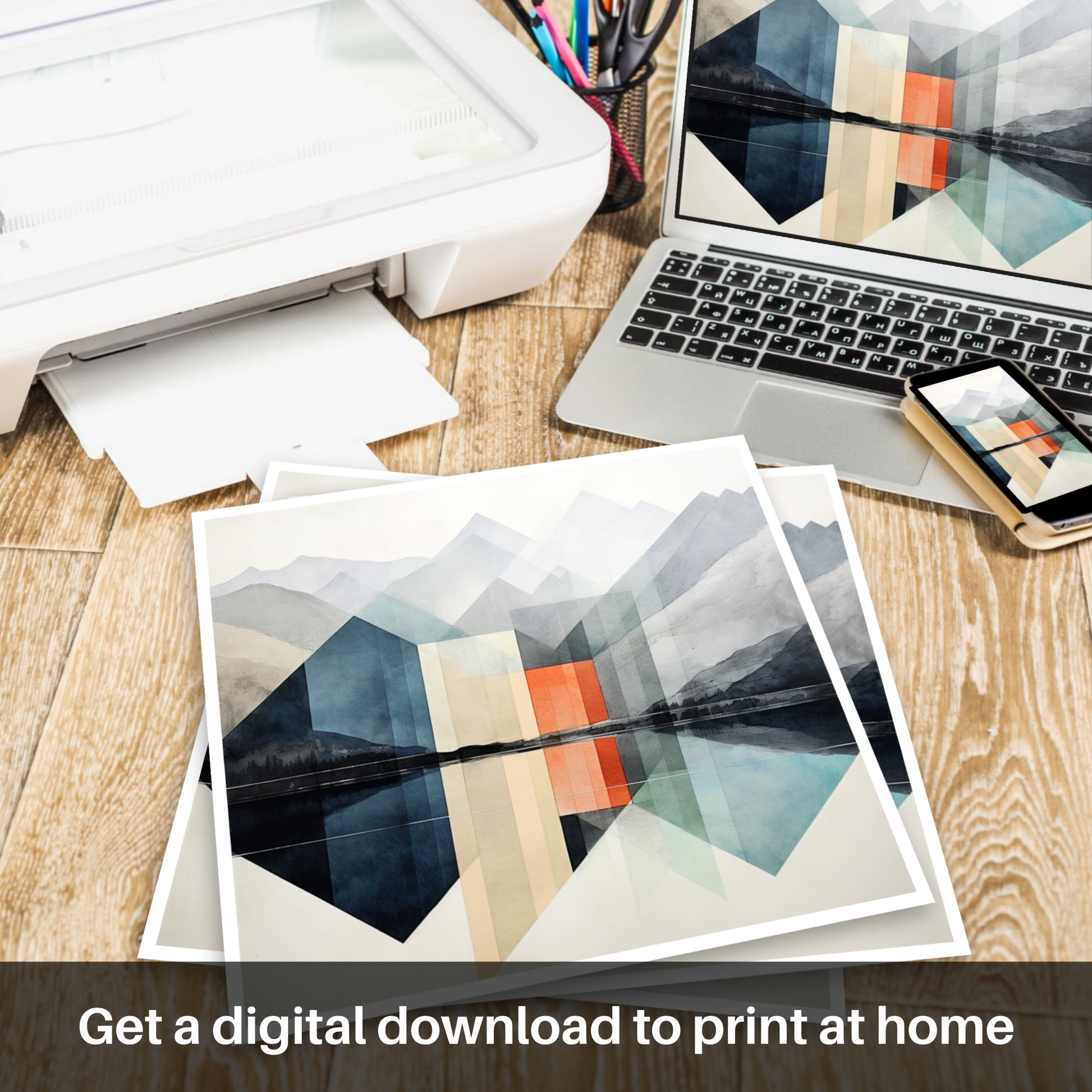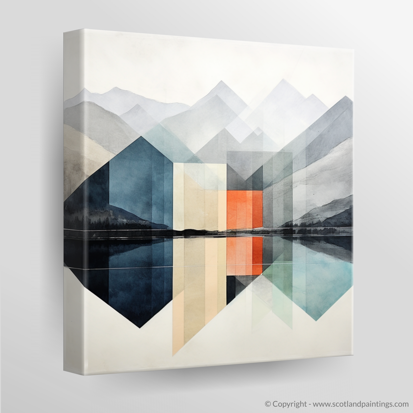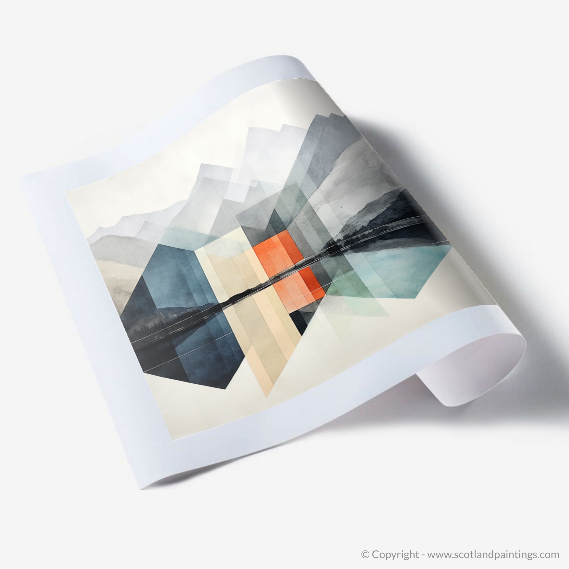 The artwork reimagines the mist-covered peaks and valleys with angular forms, juxtaposed against the still, reflective waters that mirror the precise outlines of the mountains above. Subtle gradations of slate blue, charcoal, and frosty grey dominate the composition, conveying the coolness of the Scottish air and the rugged texture of the landscape. Amidst this soothing spectrum arises a vibrant burst of burnt orange, a nod to the fleeting warmth of the sun as it graces the highlands with its presence. It's a masterstroke that energizes the scene without disturbing the minimalist approach.