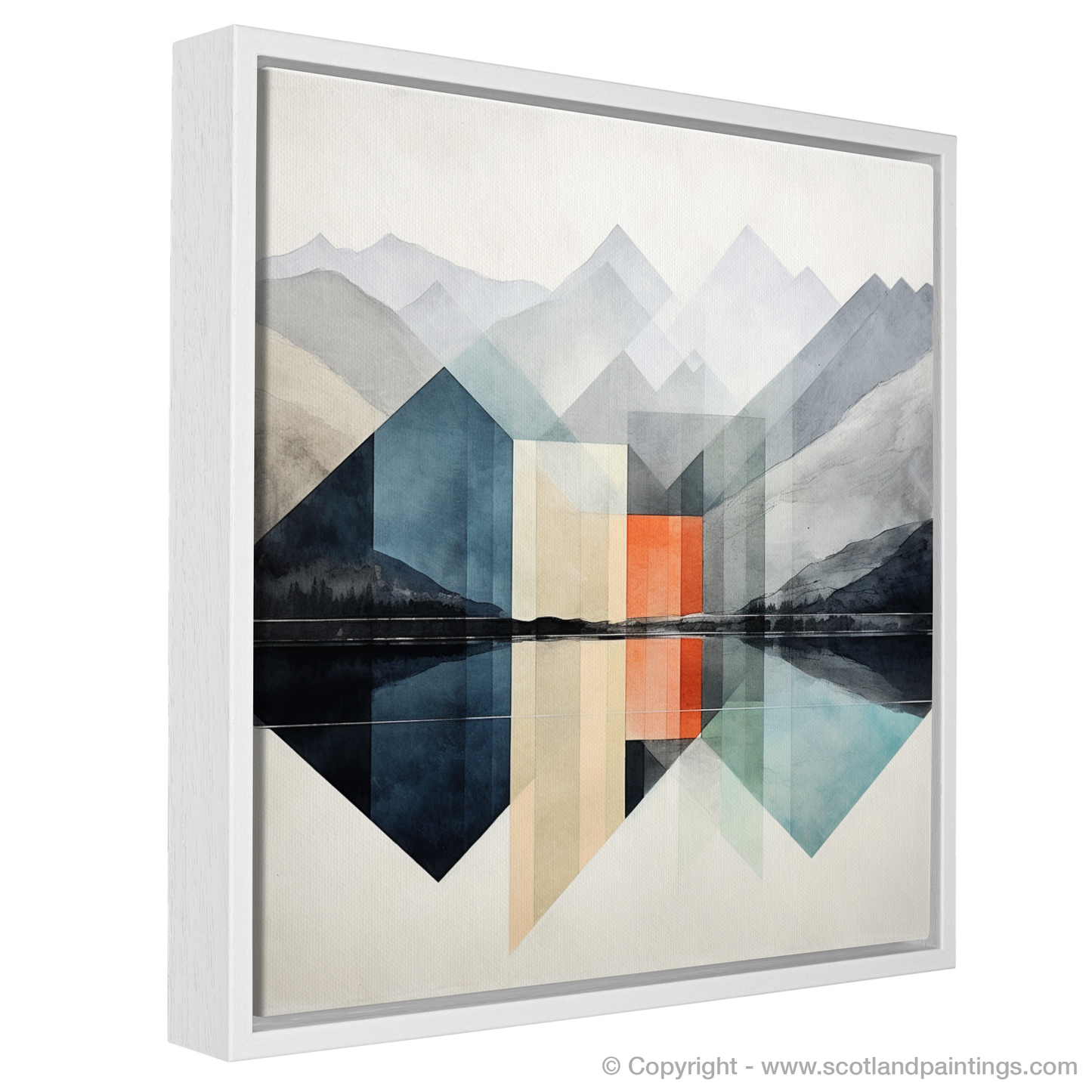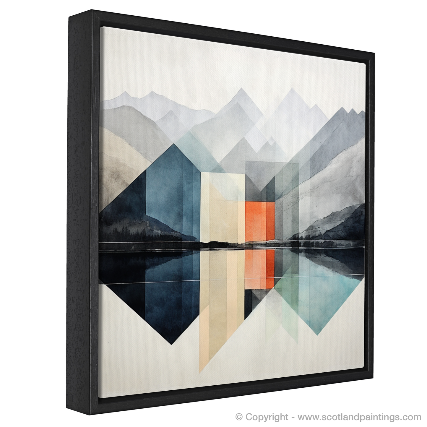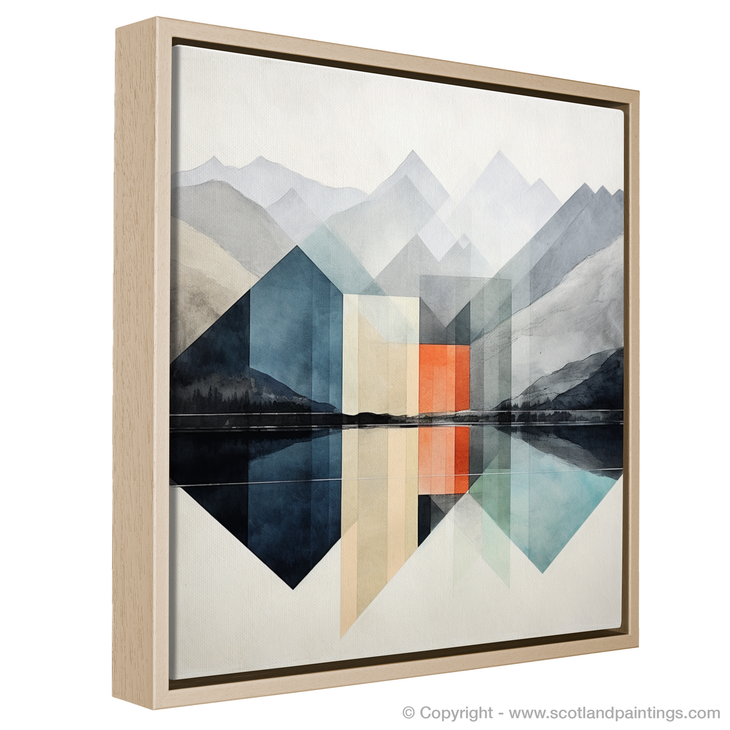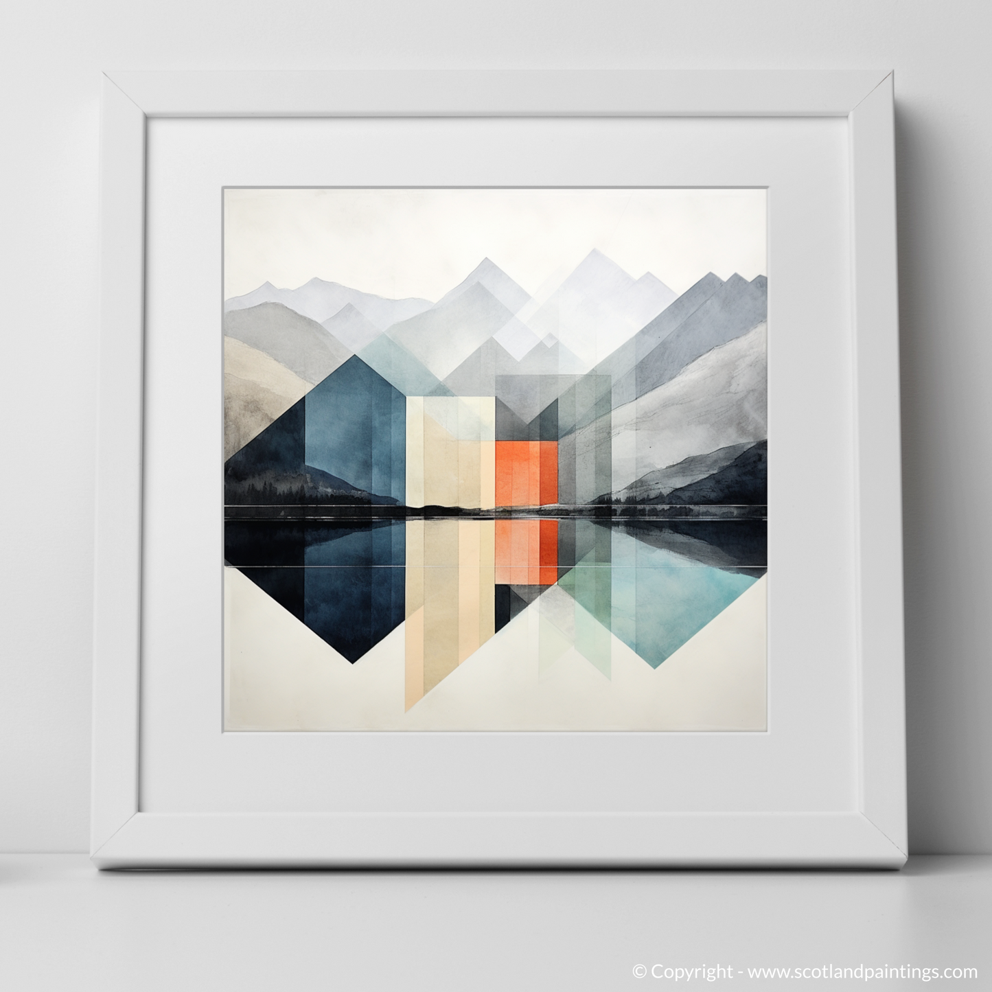 The artwork reimagines the mist-covered peaks and valleys with angular forms, juxtaposed against the still, reflective waters that mirror the precise outlines of the mountains above. Subtle gradations of slate blue, charcoal, and frosty grey dominate the composition, conveying the coolness of the Scottish air and the rugged texture of the landscape. Amidst this soothing spectrum arises a vibrant burst of burnt orange, a nod to the fleeting warmth of the sun as it graces the highlands with its presence. It's a masterstroke that energizes the scene without disturbing the minimalist approach.