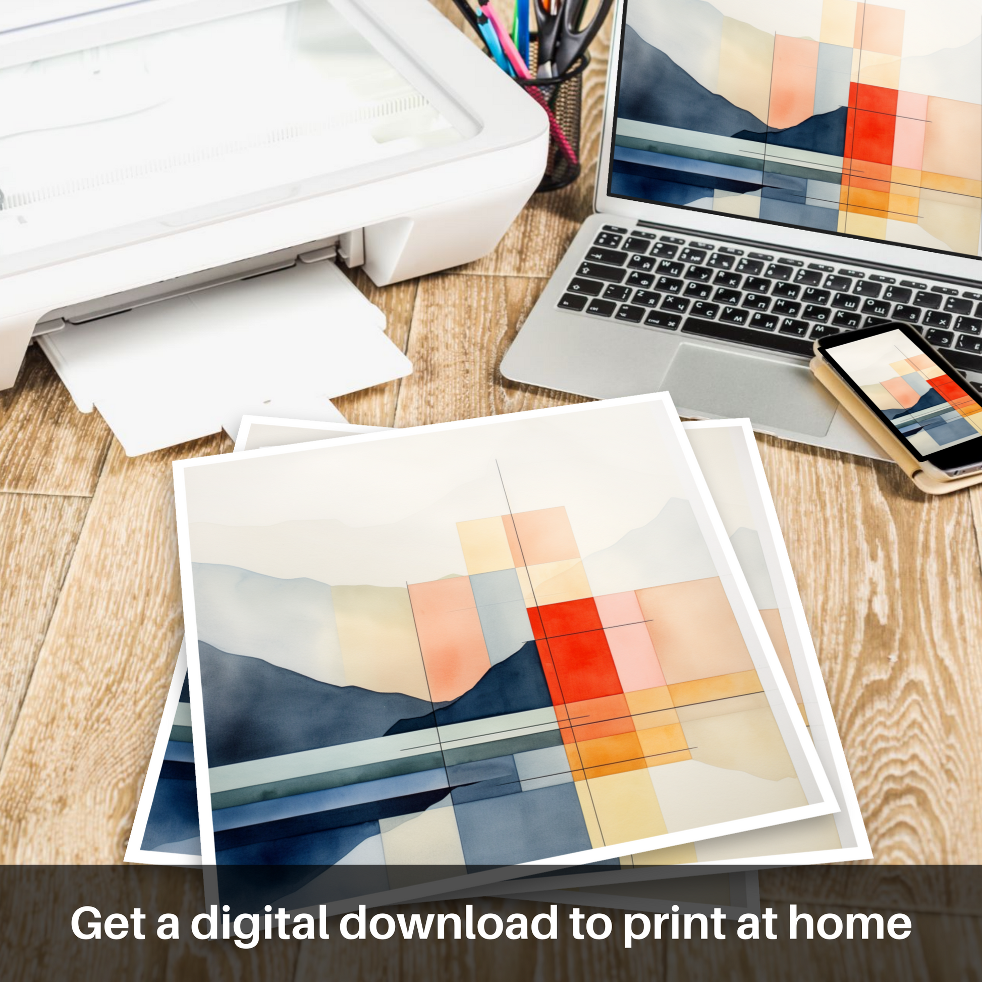 Immerse yourself in the tranquil essence of Glen Etive, distilled into a serene minimalist artwork that captures the timeless beauty of the Scottish Highlands with a contemporary twist. In this captivating print, the rolling contours of the landscape are reimagined through a tapestry of geometric shapes and a soothing palette that echoes the natural hues of the glen.