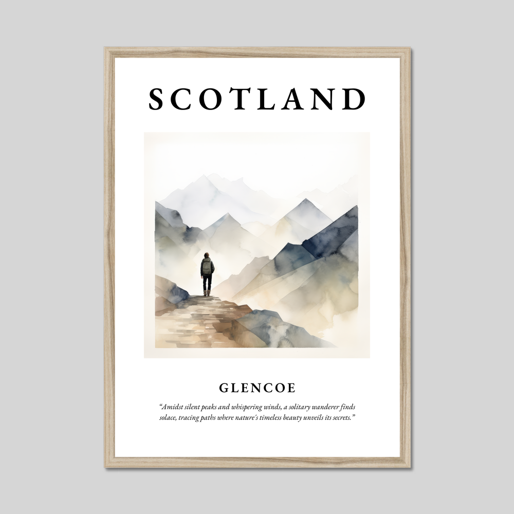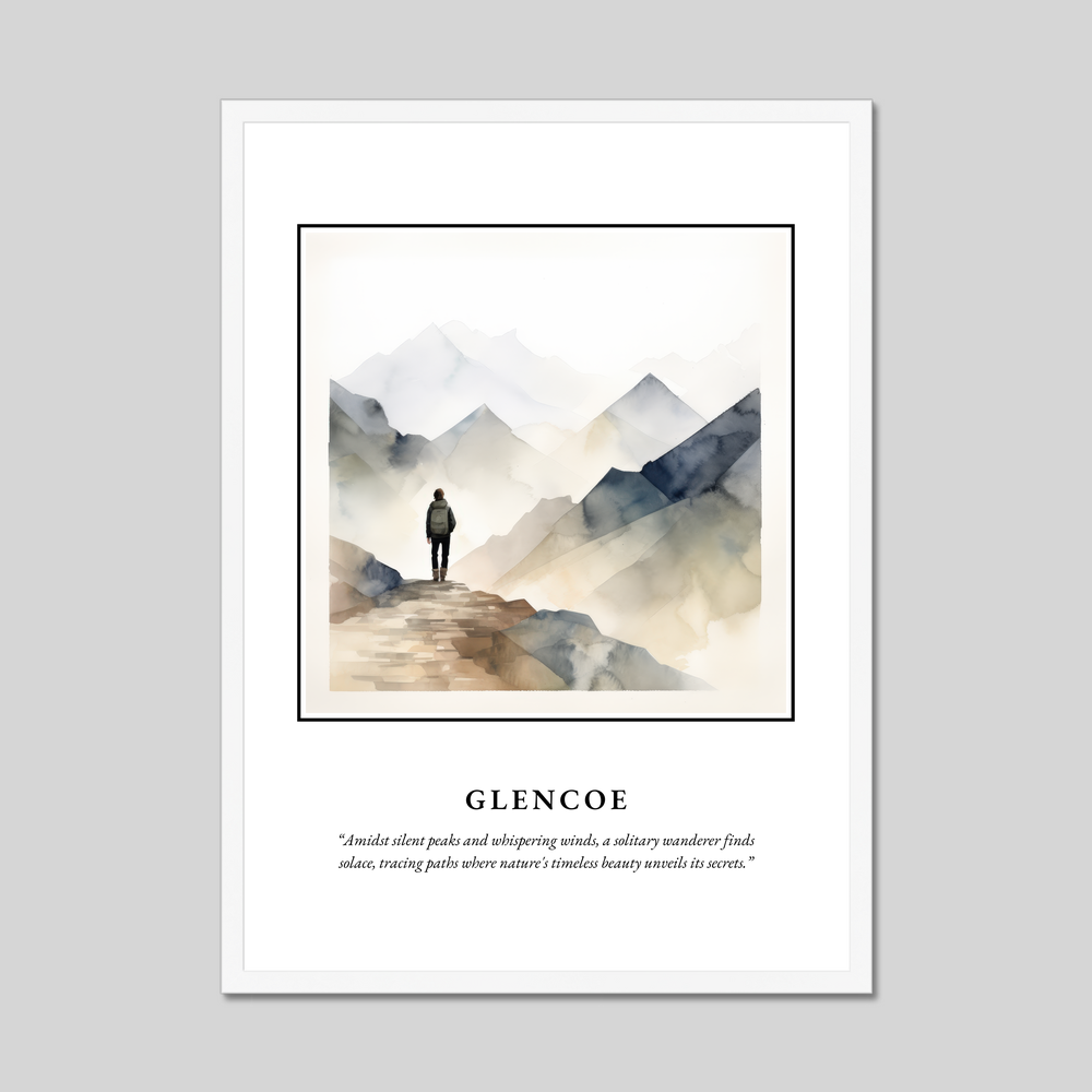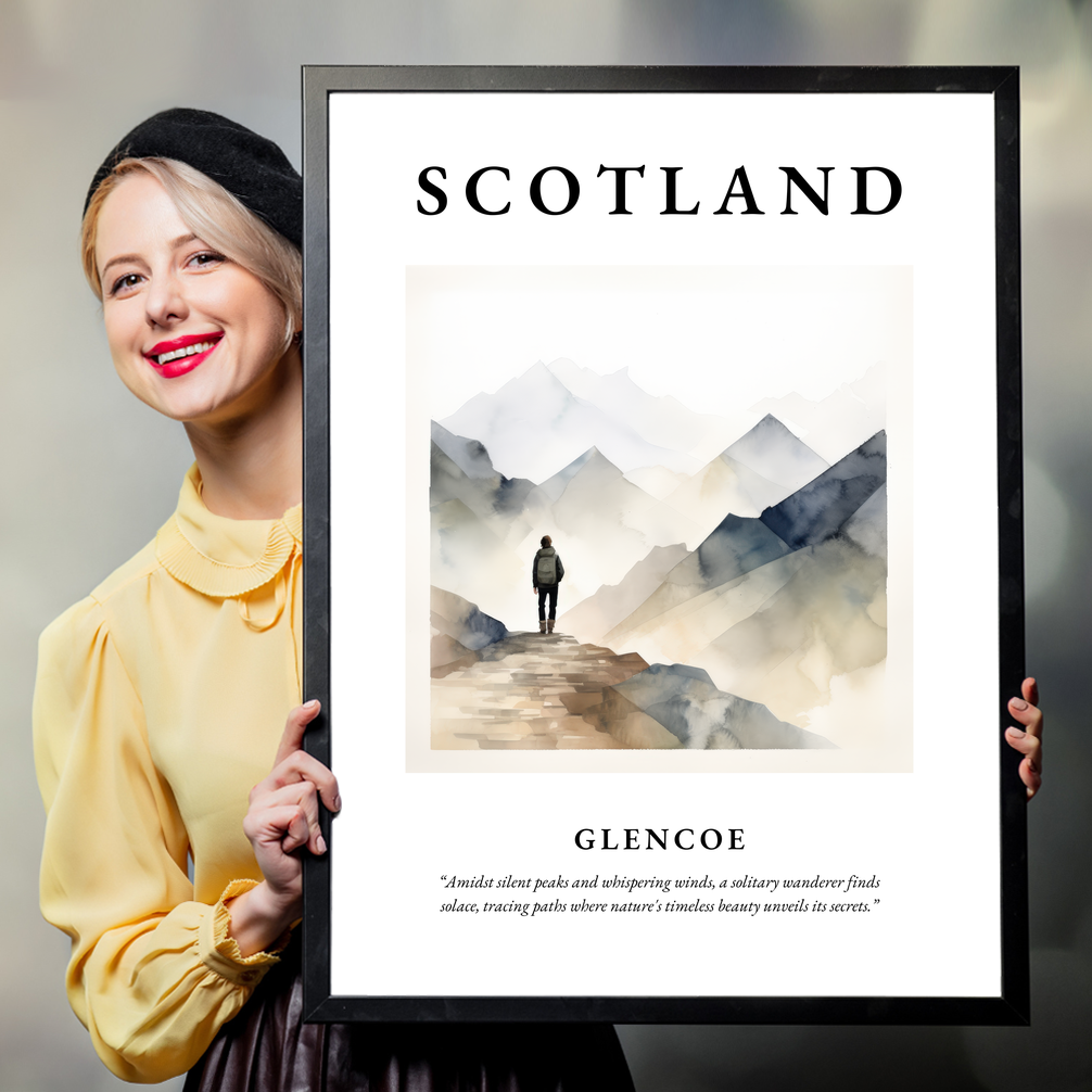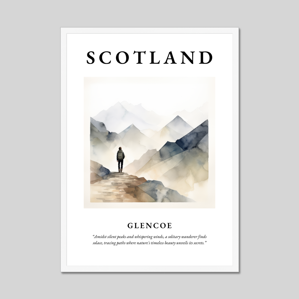 The poster prominently features "SCOTLAND" at its top in bold, commanding letters, setting the stage for the tranquil scene below—a masterful minimalistic painting of Glencoe. The artwork captures the ethereal beauty of towering peaks and wisps of mist, inviting you to imagine the solitary wanderer tracing paths among nature's secrets. Below the painting, the quote “Amidst silent peaks and whispering winds, a solitary wanderer finds solace, tracing paths where nature's timeless beauty unveils its secrets.” evokes a sense of wonder and introspection.