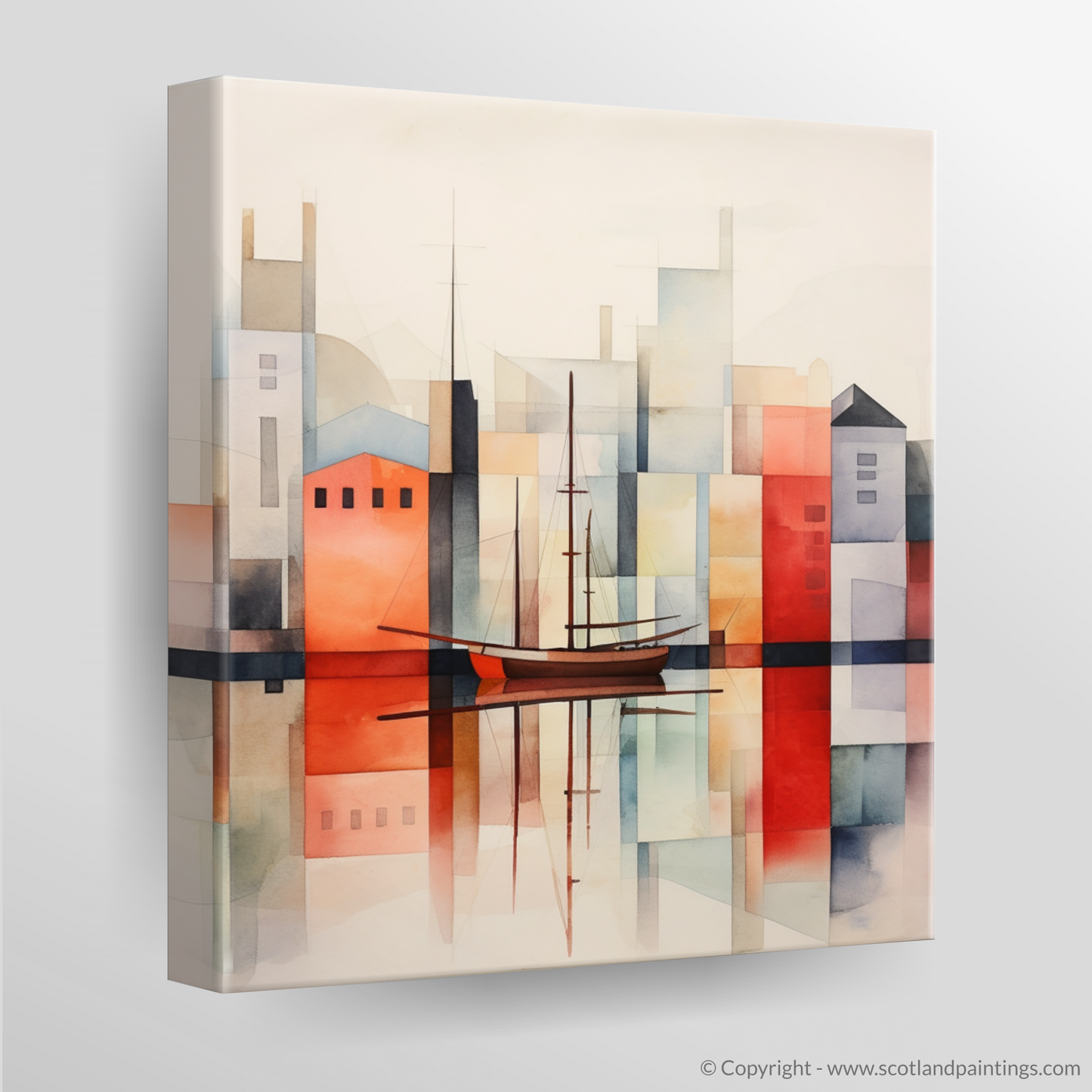 The composition is a symphony of soft, earthy tones interspersed with bold splashes of red and blue, encapsulating the coastal environment's natural and manmade elements. Buildings rendered in abstract blocks tower in the backdrop, suggesting the presence of the town without overwhelming the senses. Central to the scene is a solitary boat, its elegant masts reaching skyward, mirrored in the glassy harbour along with the shapes and hues of its surroundings.