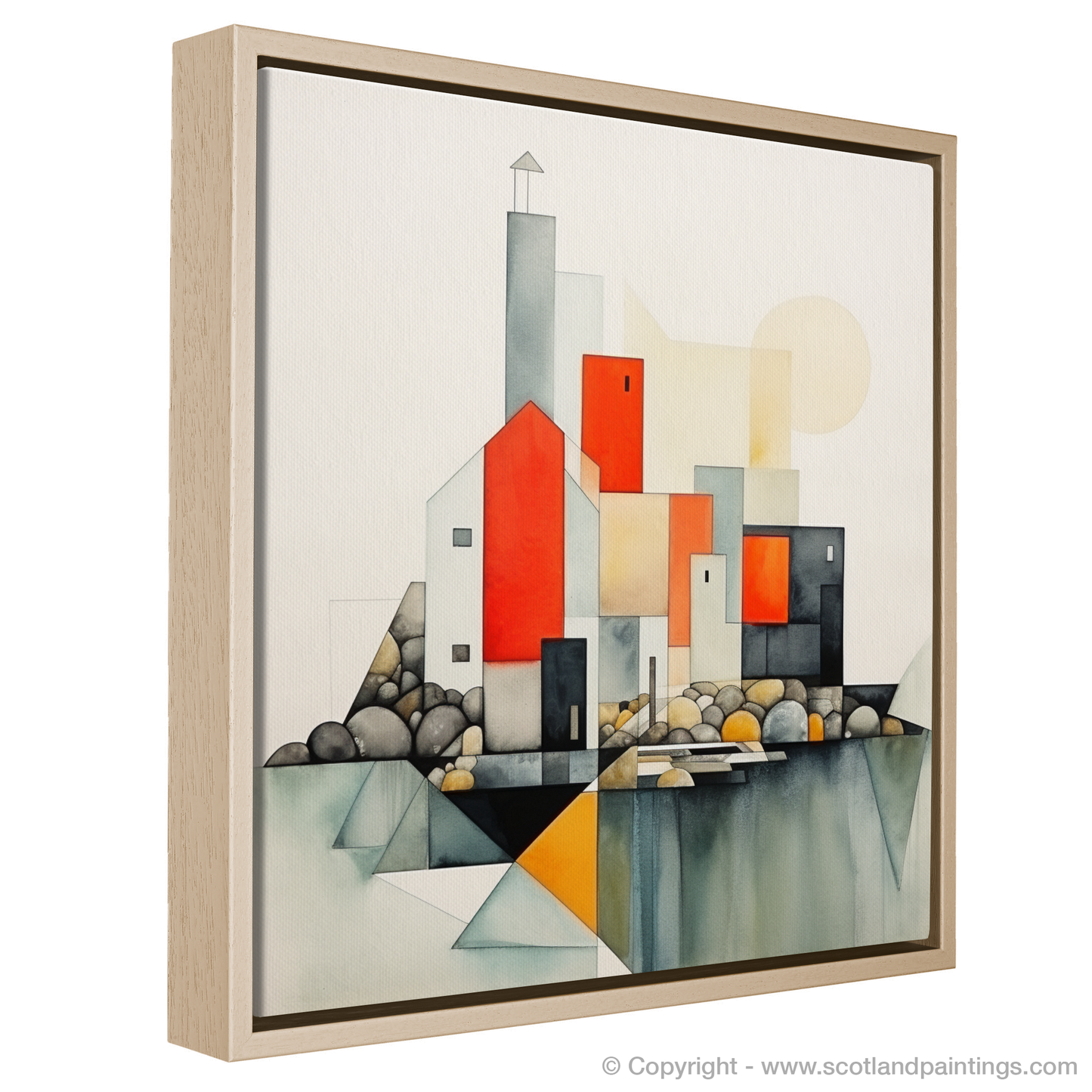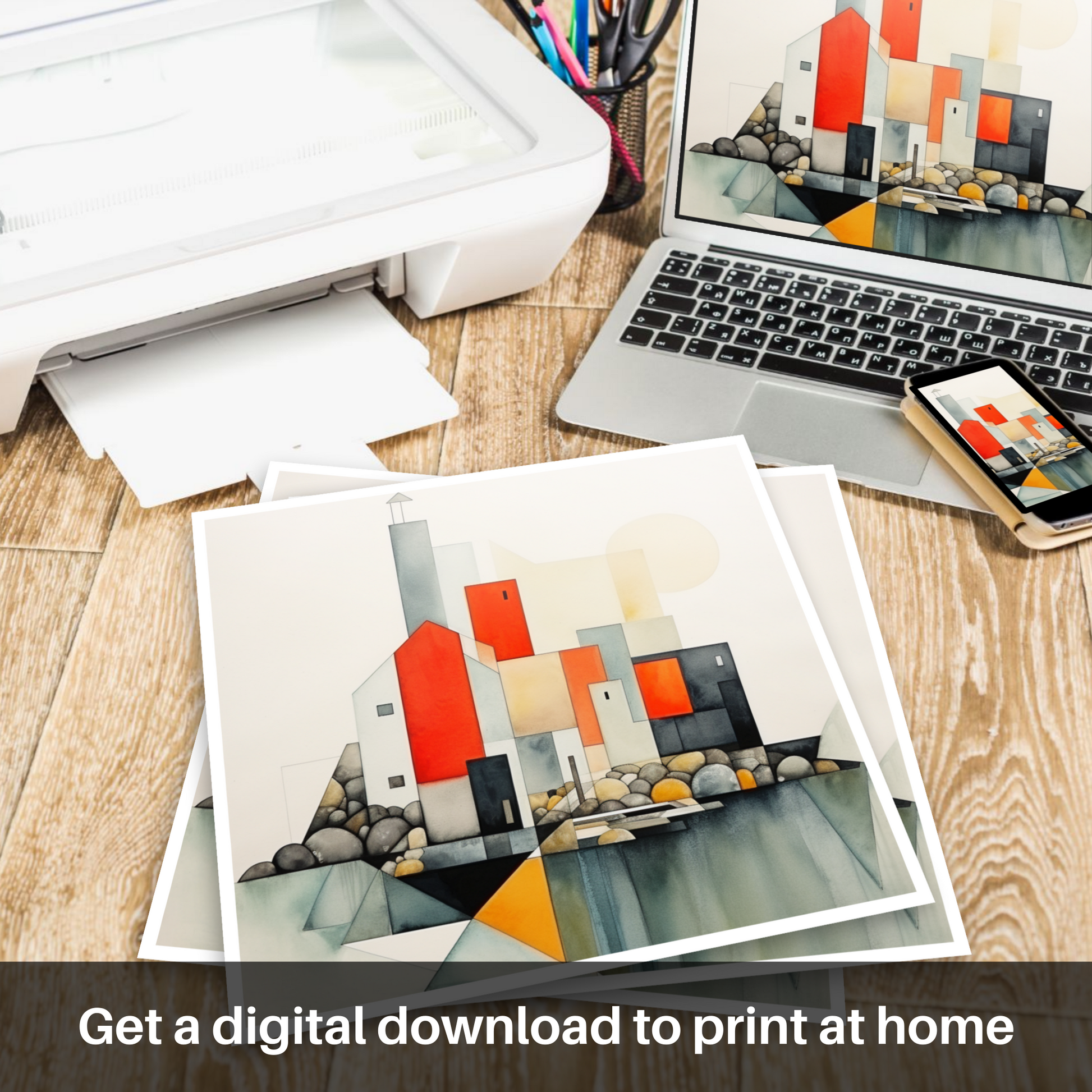 Immerse yourself in the serene beauty of a distant isle with this exquisite print, a symphony of form and colour distilled into a seamless minimalist vista. Upon this canvas, the spirit of the Shetland Islands is reimagined through a harmonious palette of soothing neutrals punctuated by pops of warm terracotta and bold vermilion, echoing the distinctive hues of island life.