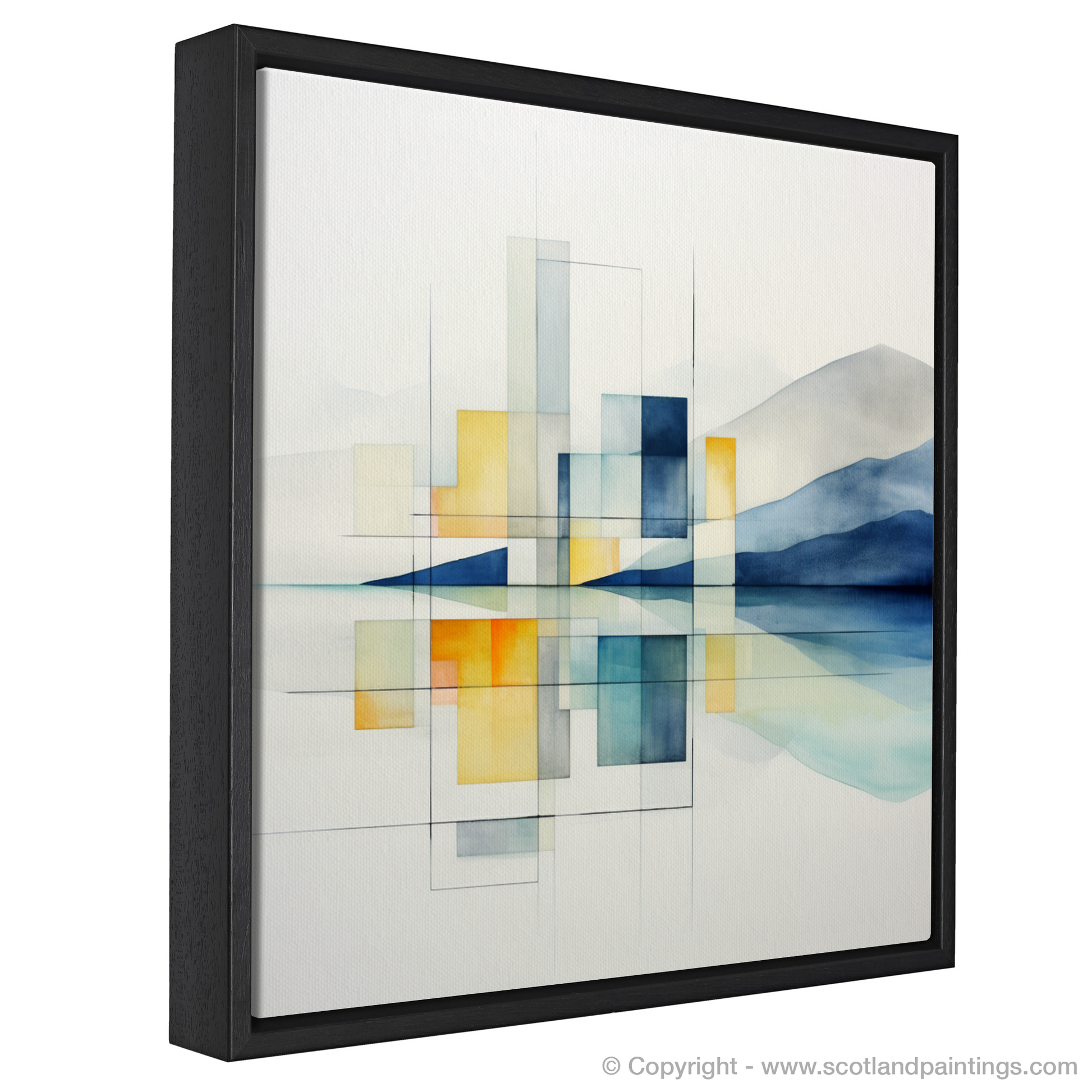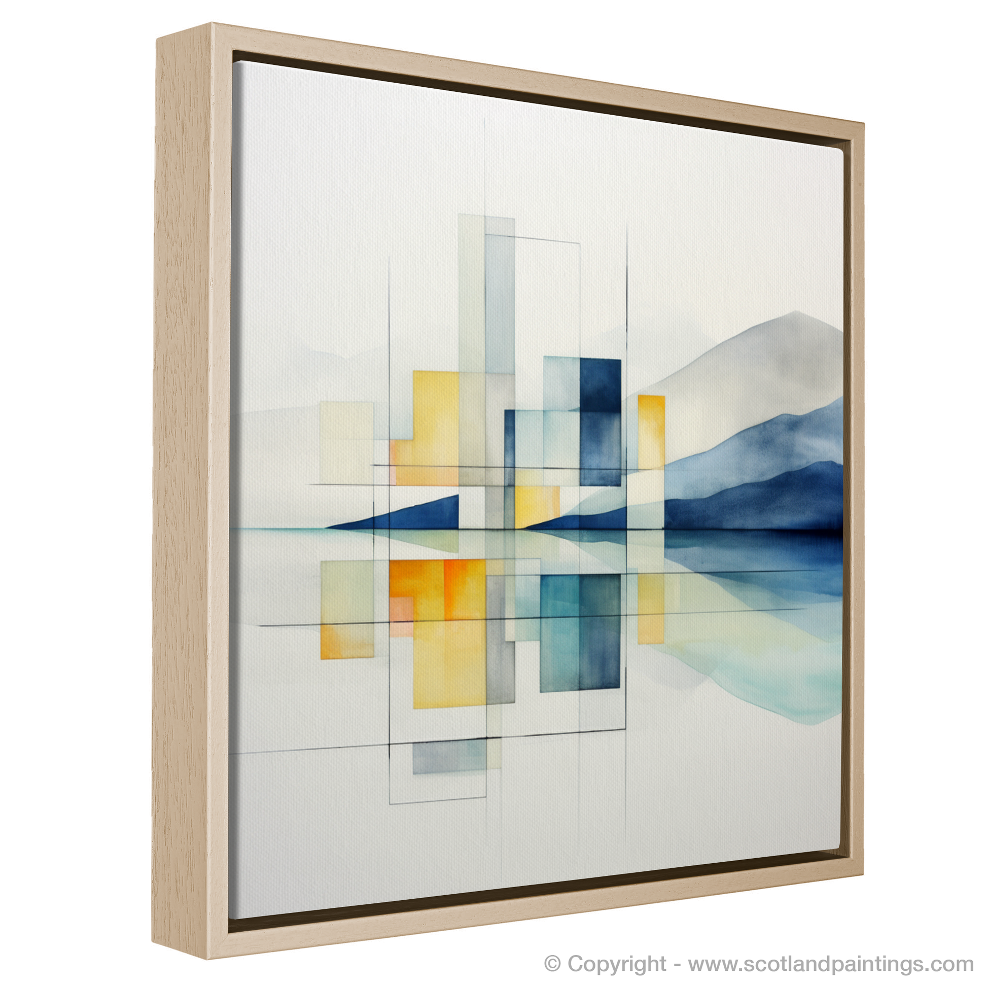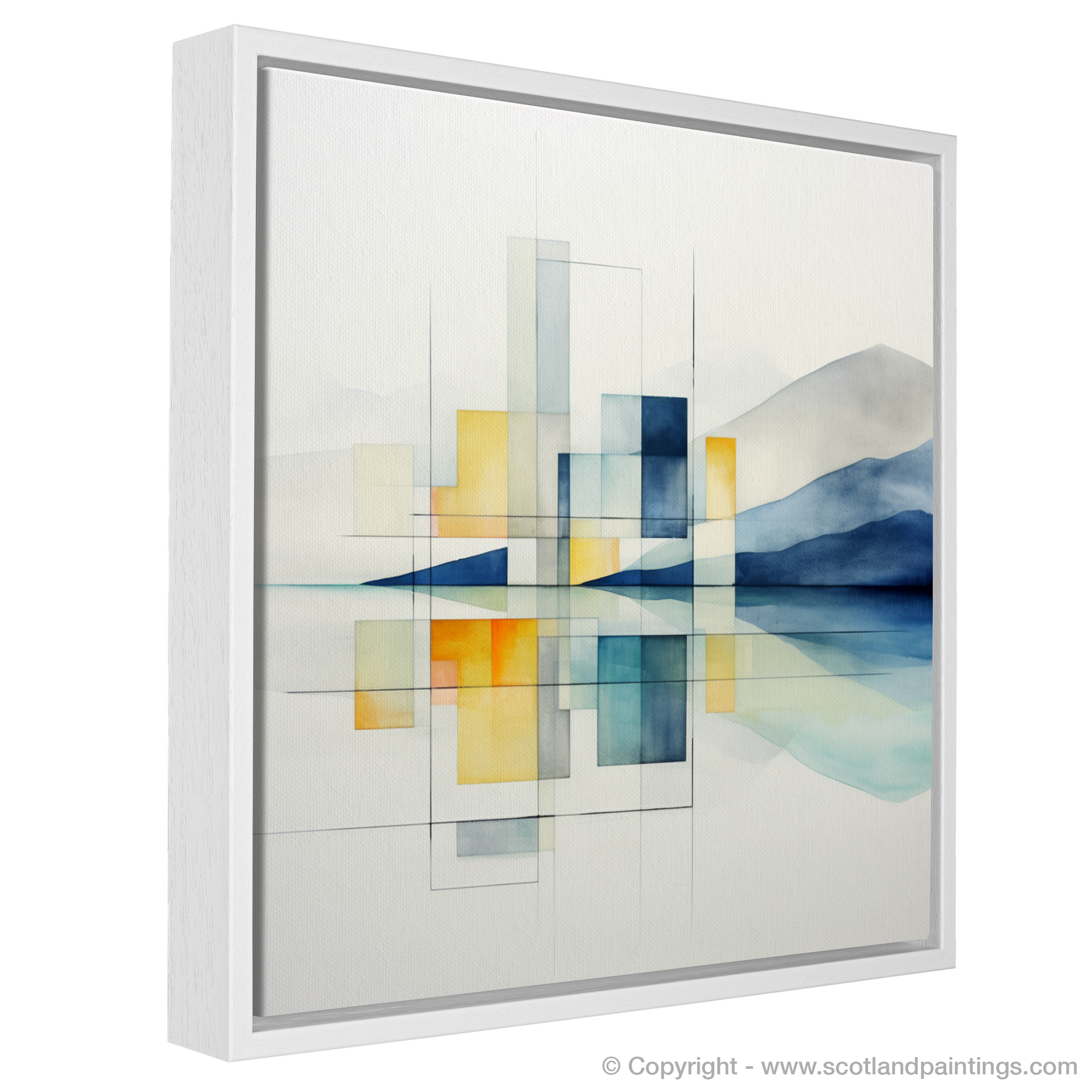 Outlined by graceful lines and solid rectangles, the silhouette of Jura's iconic hills and misty horizon are abstracted into an arrangement that prioritises harmony and balance. Each geometric form is meticulously aligned, creating windows to the soul of the landscape, offering a view that is both austerely simplified and complex in its evocation of mood and place.