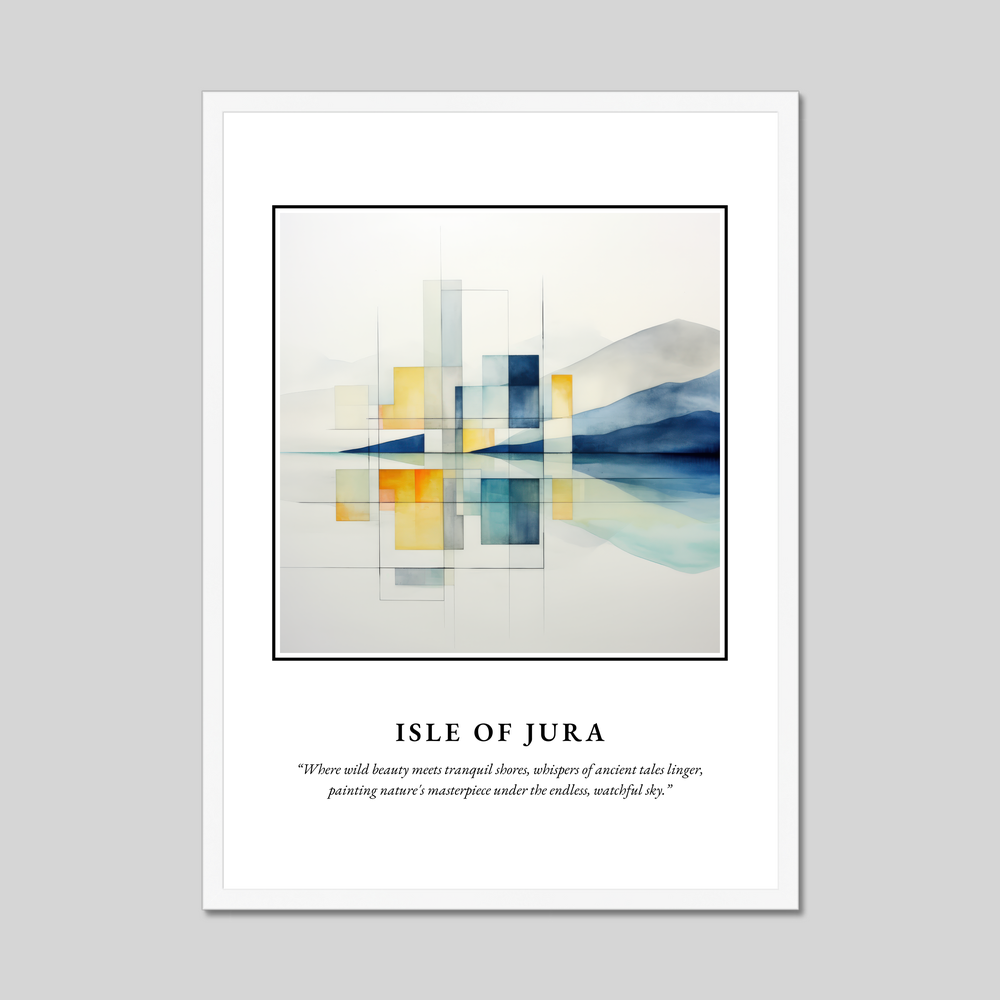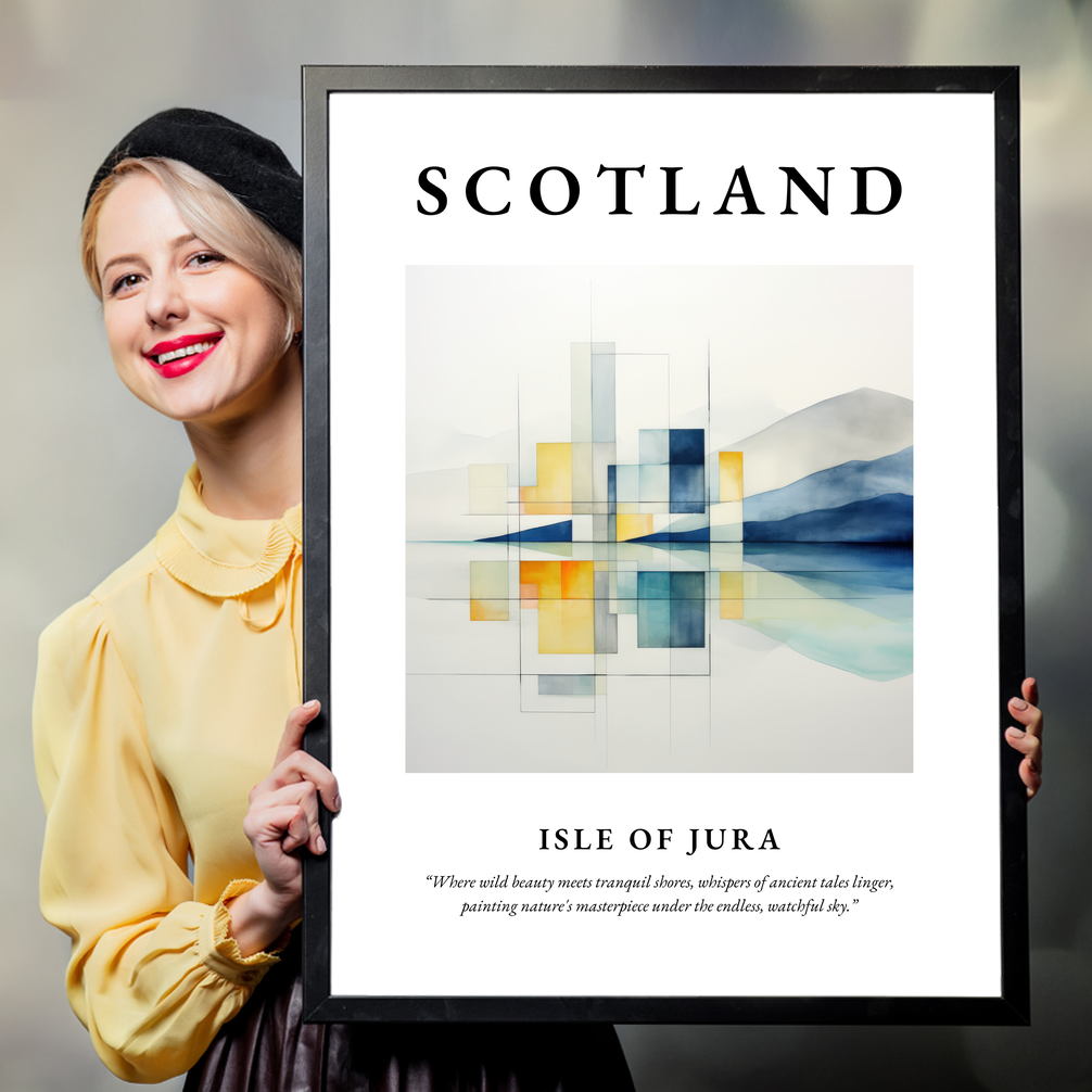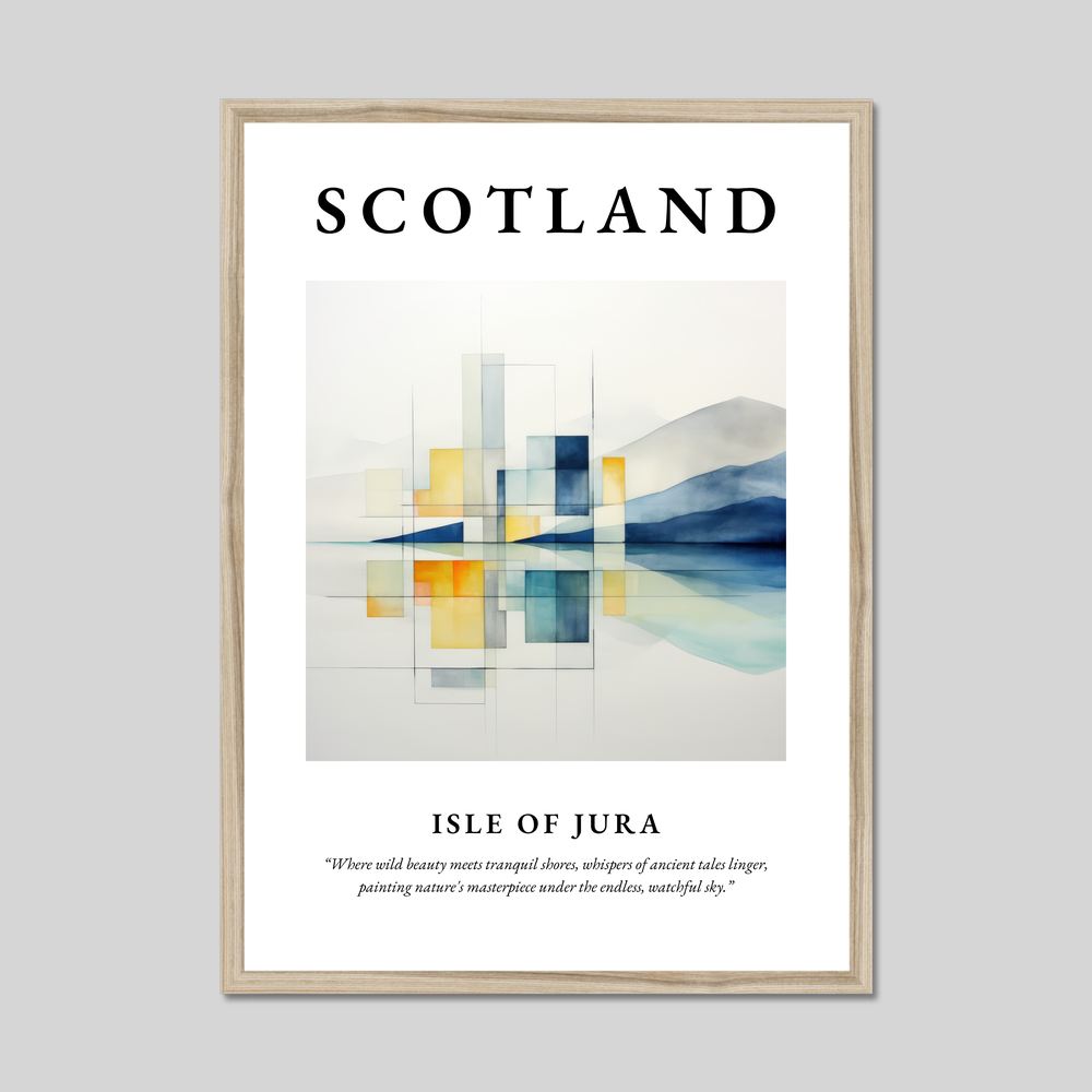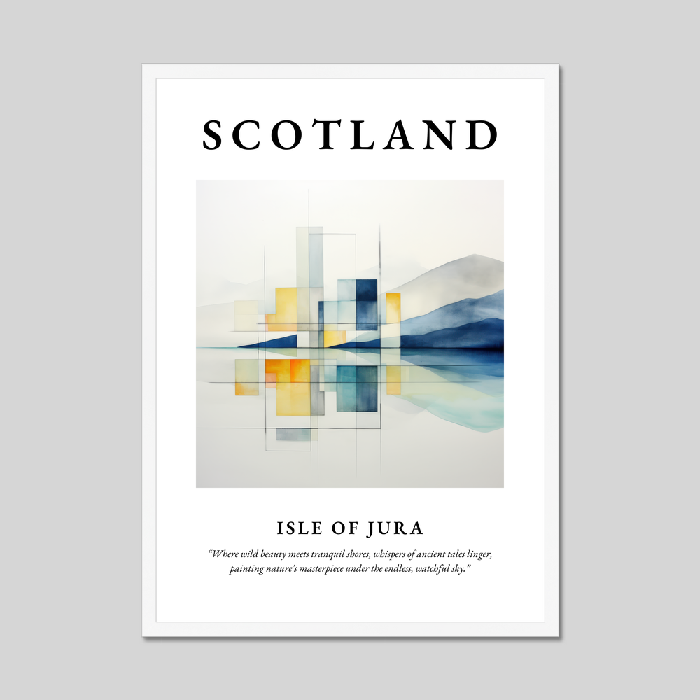 The poster's minimalist painting captures the essence of Jura’s landscape with geometric harmony. Subtle hues of blue and amber create an abstract reflection of the island’s serene waters and majestic hills. The bold lettering of “SCOTLAND” up top is a proud announcement of heritage, while the evocative quote beneath the artwork whispers the island’s timeless allure: “Where wild beauty meets tranquil shores, whispers of ancient tales linger, painting nature's masterpiece under the endless, watchful sky.”