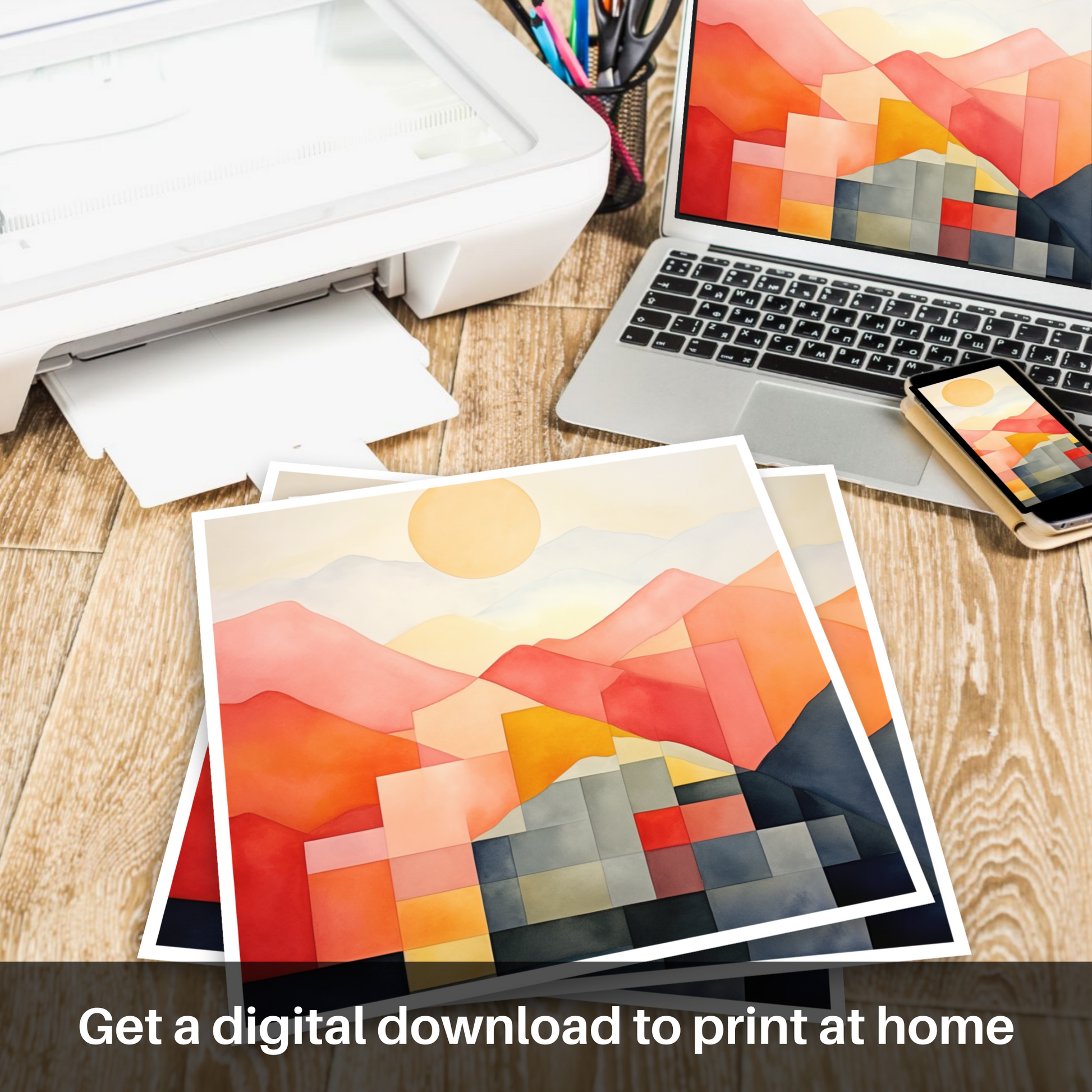 In the foreground, the artwork shifts to a palette of earthy terracotta, dusty pink, and burnt orange, constructing an abstract semblance of the rugged terrain. The stark geometry of the landscape is playfully contrasted with the organic roundness of the sun, producing a composition that is both grounded in the earth yet airy and weightless.