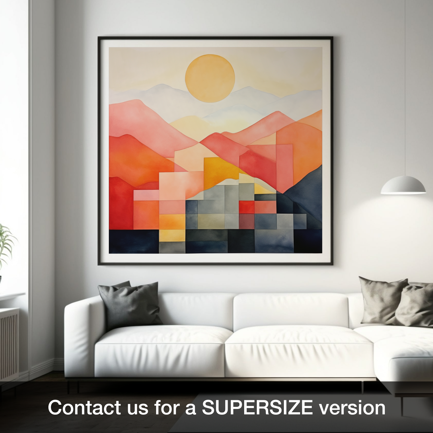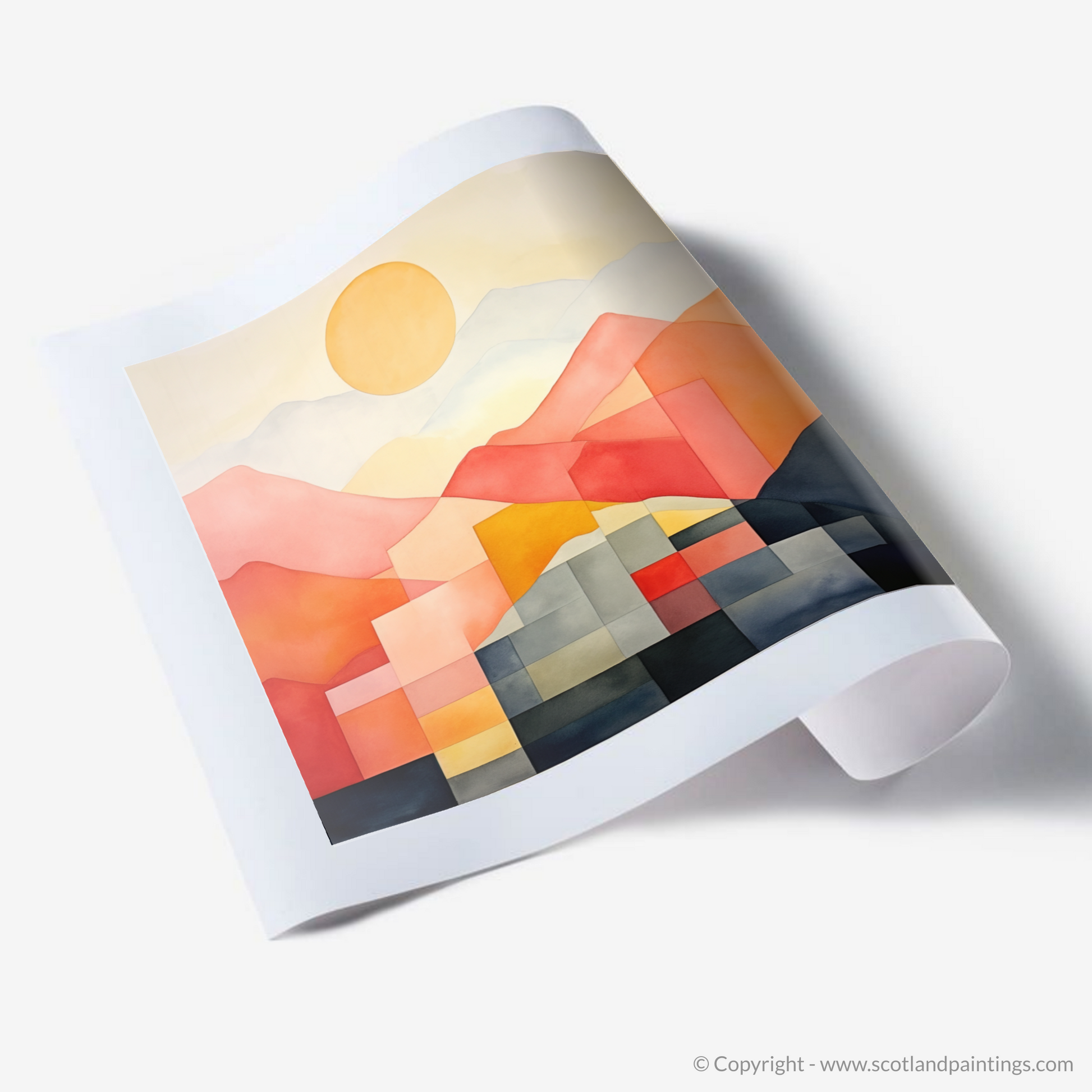 Immerse yourself within the serene beauty of the Scottish highlands, elegantly captured through the deft touch of minimalistic expression. With Glen Shiel as its inward muse, this exquisite piece masterfully distills the raw magnificence of nature into a tapestry of geometric abstraction. The artwork unfolds a soothing juxtaposition of warm and cool tones, depicting the rolling contours of the mountains in an array of harmonious hues.