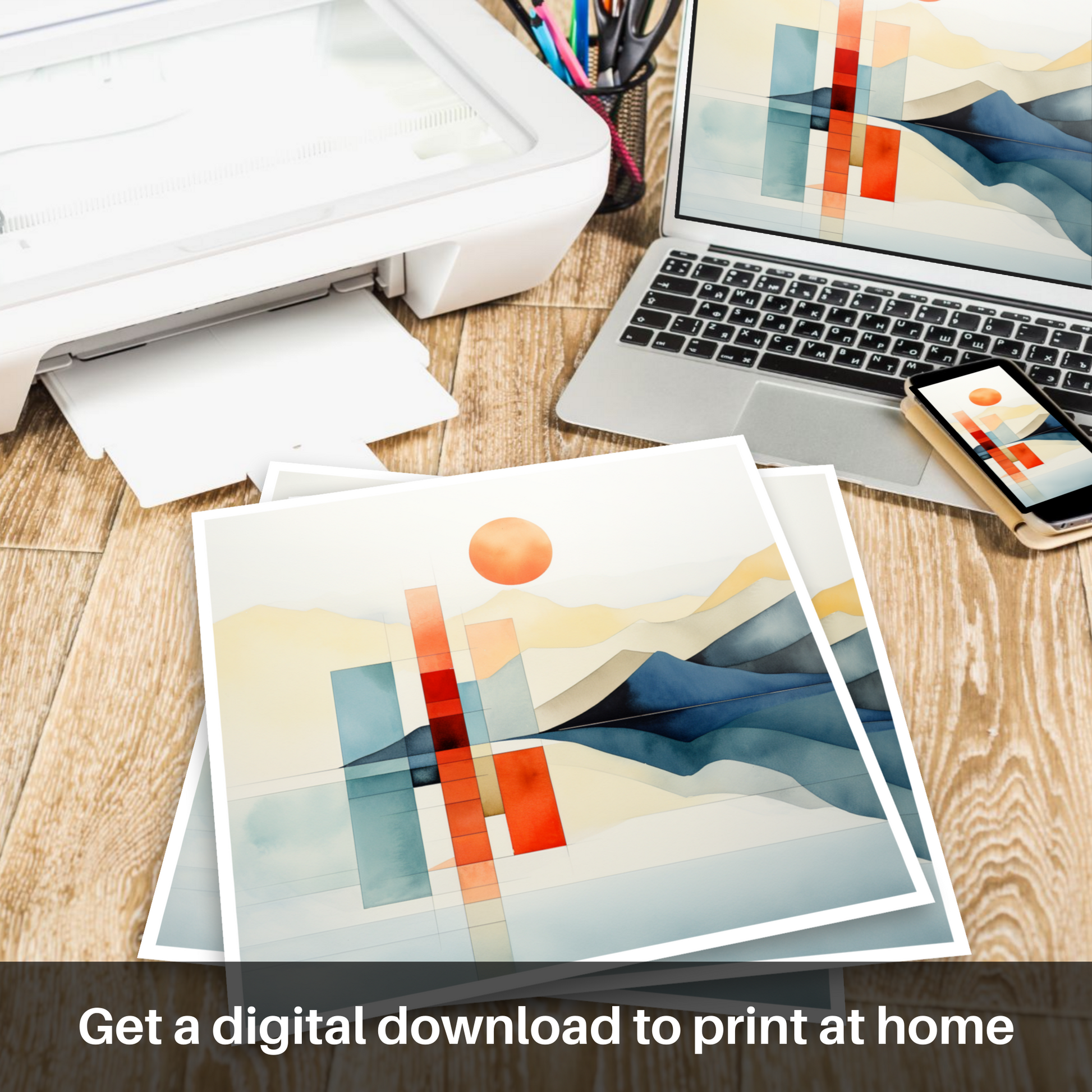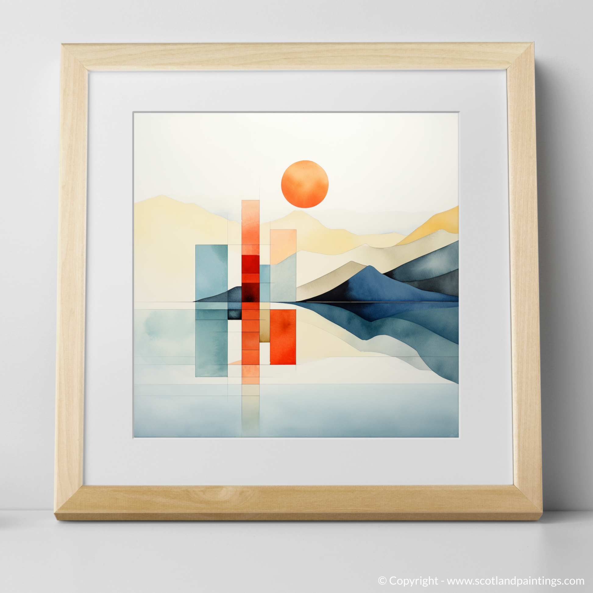 Immerse yourself in the serene beauty of the Scottish Highlands with this exquisite print. Drawing inspiration from the tranquil Loch Morar, the image is a harmonious symphony of minimalist design and soothing colours. Distinct layers of gentle blues and muted greys form abstract mountain silhouettes, captured in their purest geometrical essence, replicating the peaceful and untouched landscape.