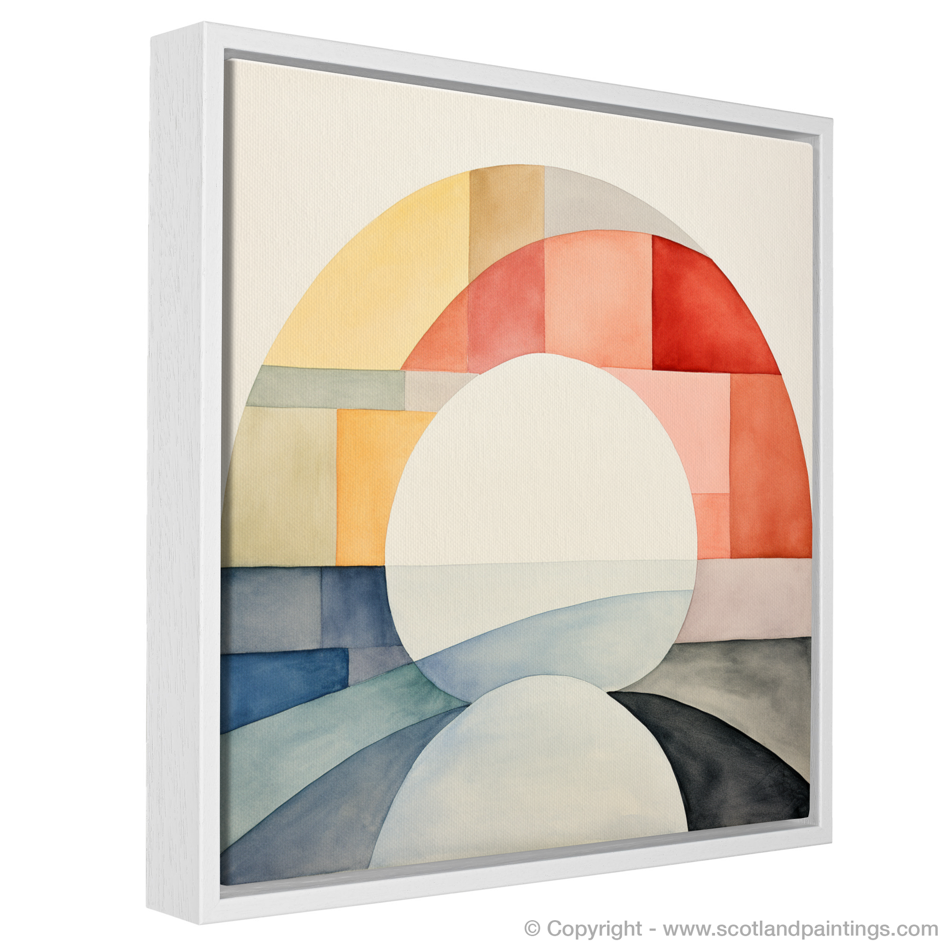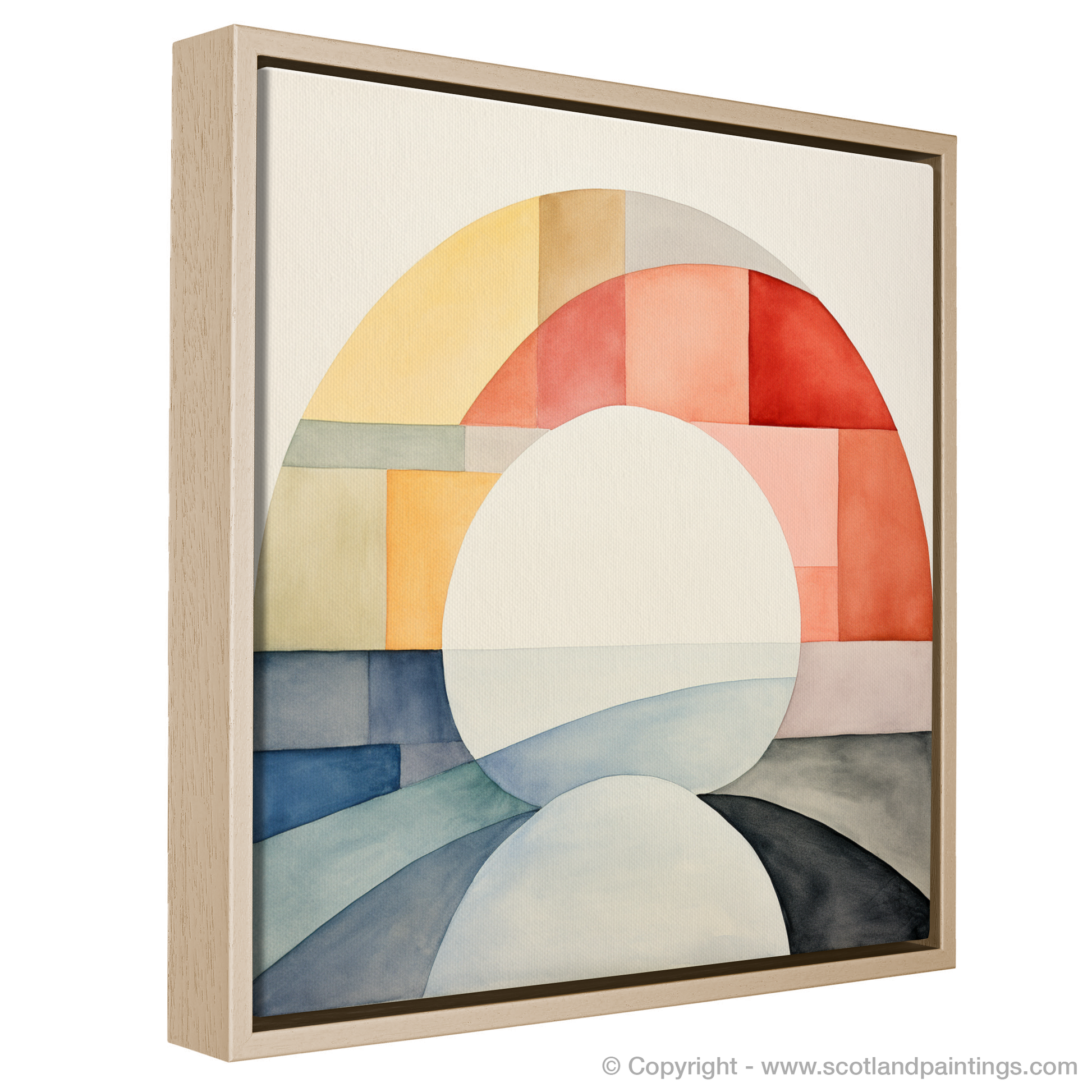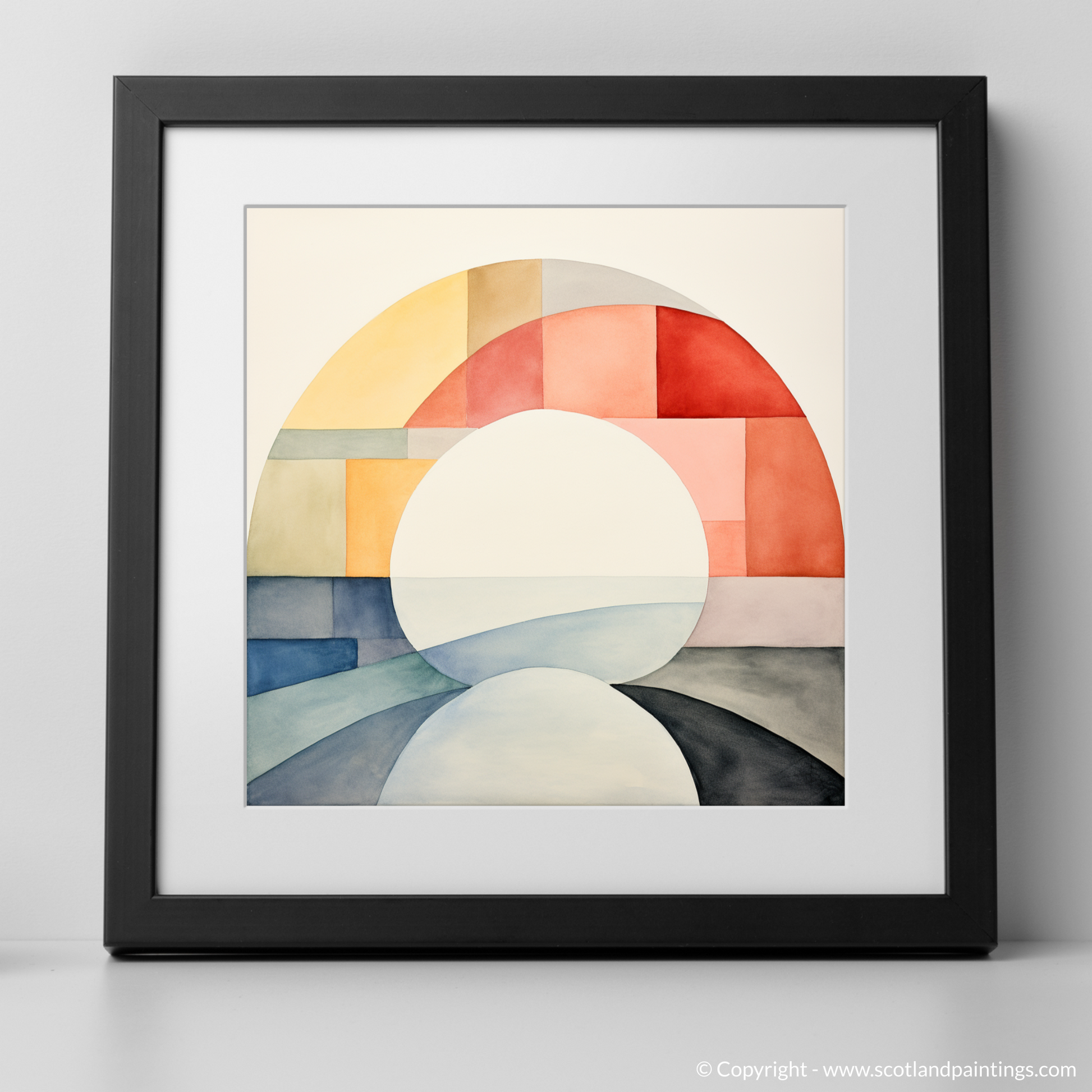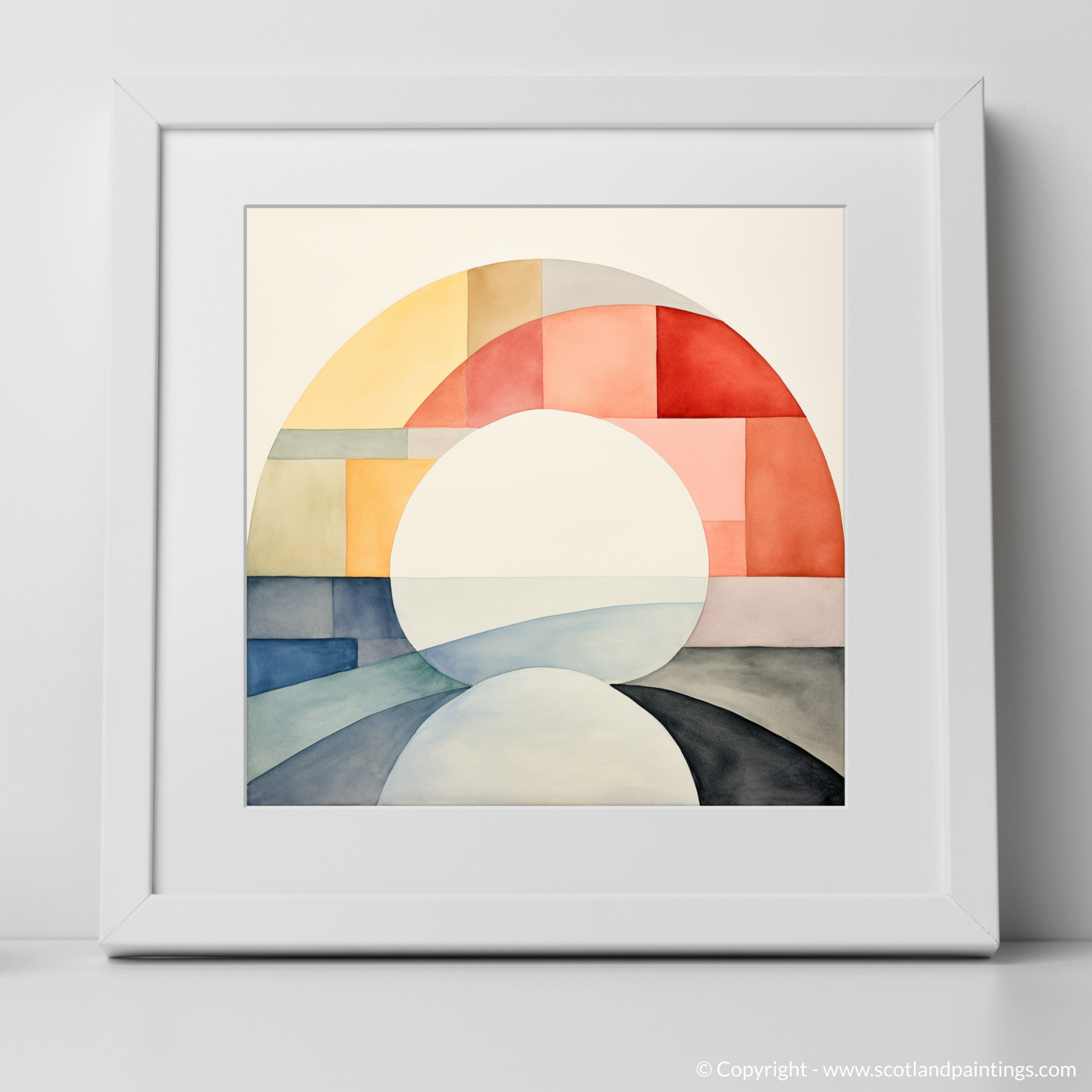 Steeped in tranquillity, this minimalistic masterpiece draws on the delicate interplay of colour and shape to evoke the ethereal beauty of the River Ness. The artwork, a careful composition of soft arcs and geometric blocks, utilises a serene palette that ranges from warm apricot hues to cool azure tones, suggesting the harmonious dance of sunlight across water and land.