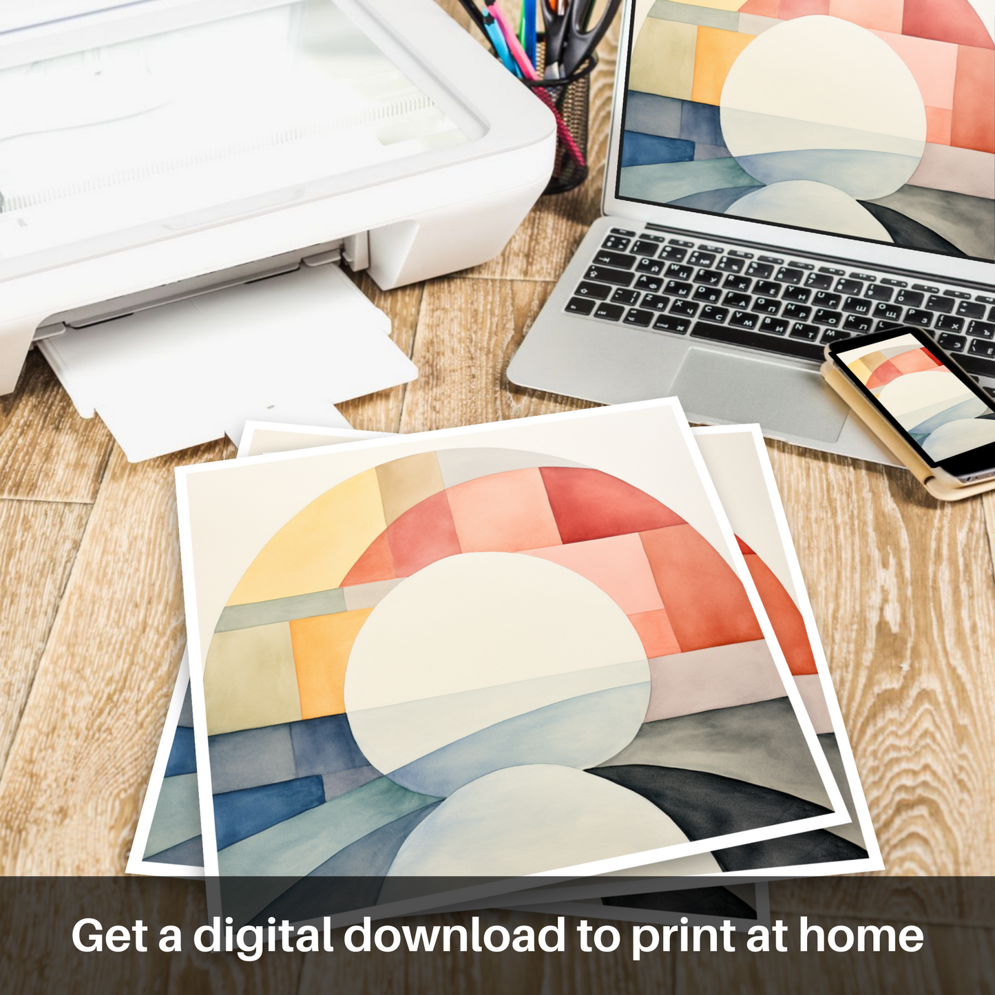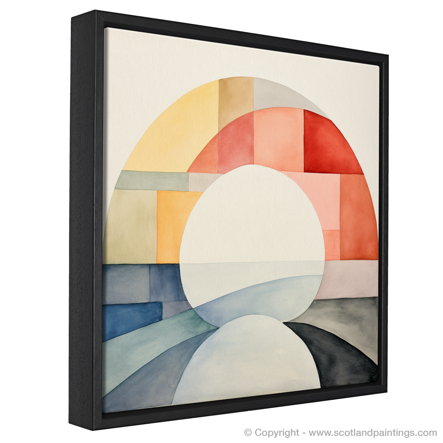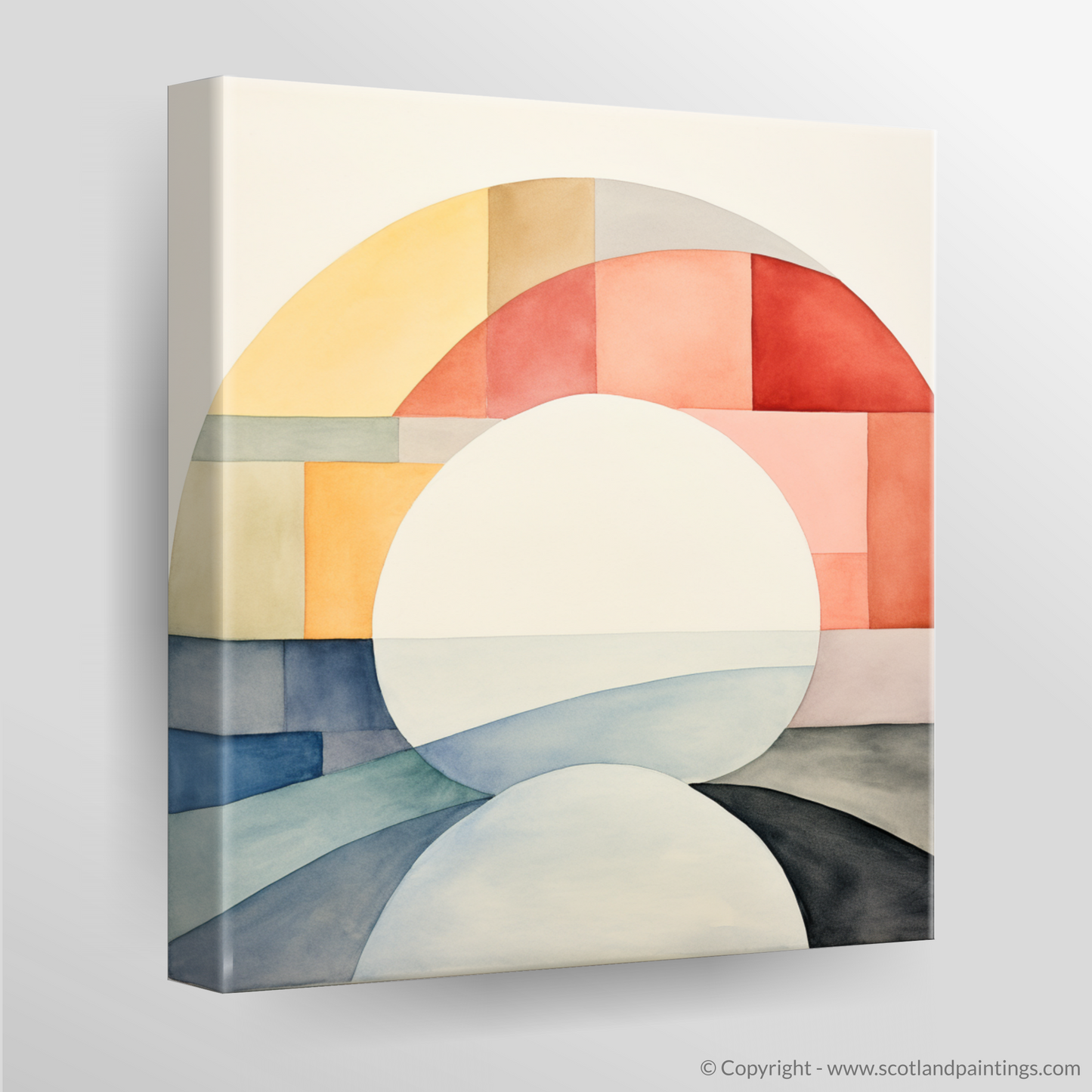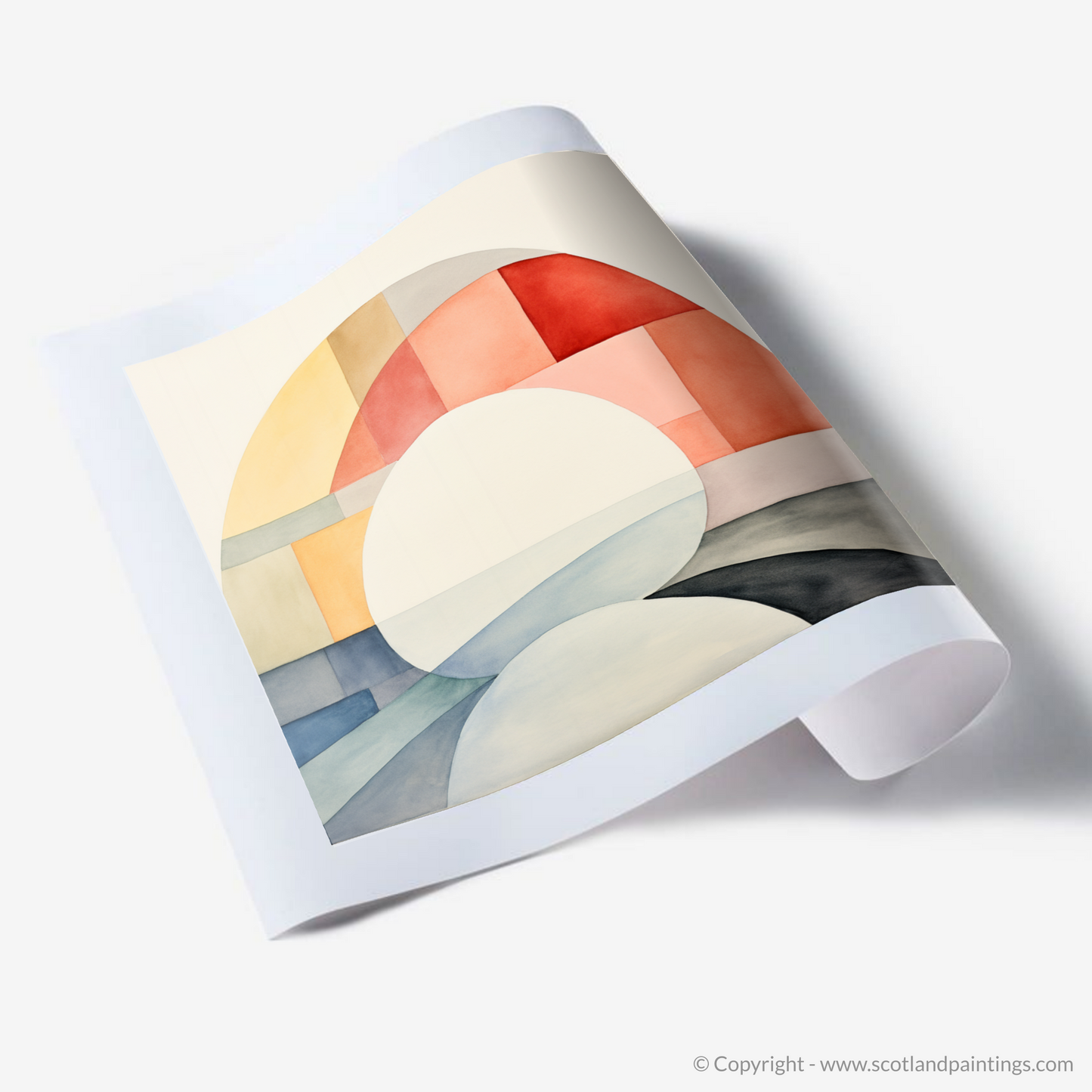 Steeped in tranquillity, this minimalistic masterpiece draws on the delicate interplay of colour and shape to evoke the ethereal beauty of the River Ness. The artwork, a careful composition of soft arcs and geometric blocks, utilises a serene palette that ranges from warm apricot hues to cool azure tones, suggesting the harmonious dance of sunlight across water and land.