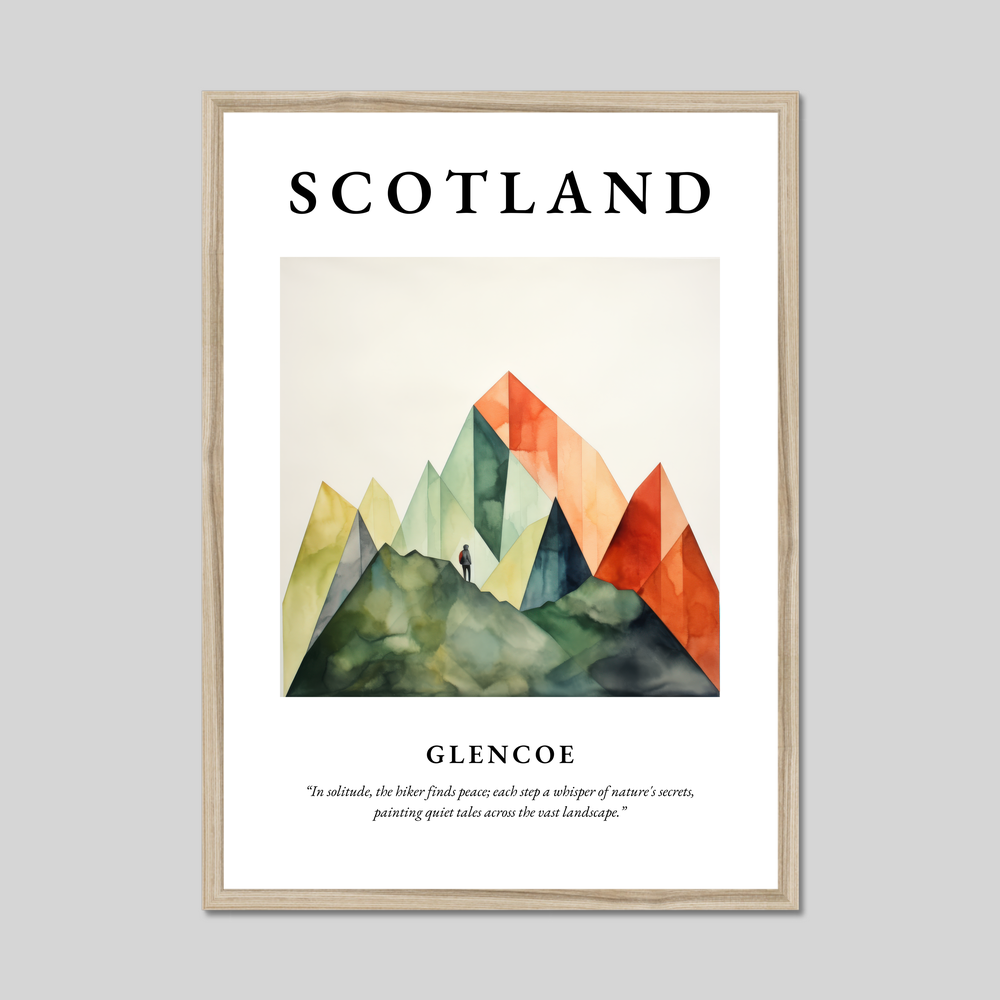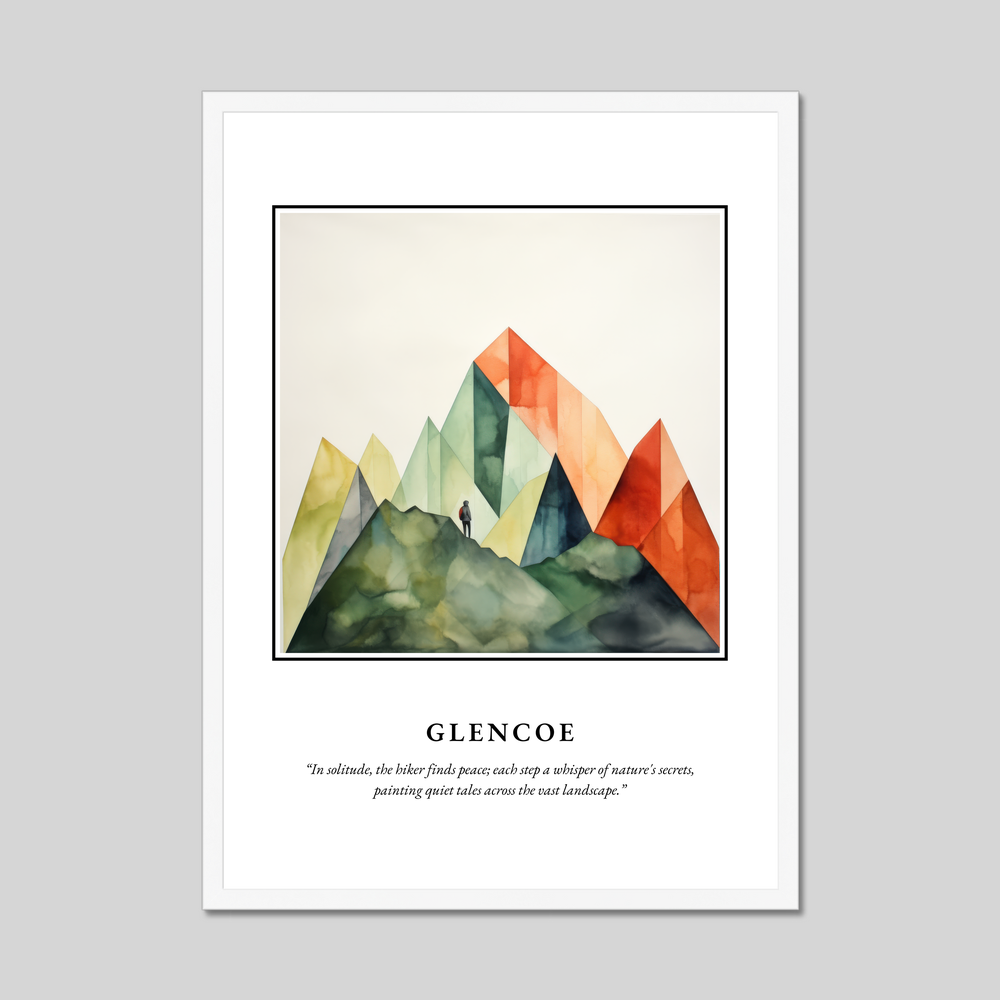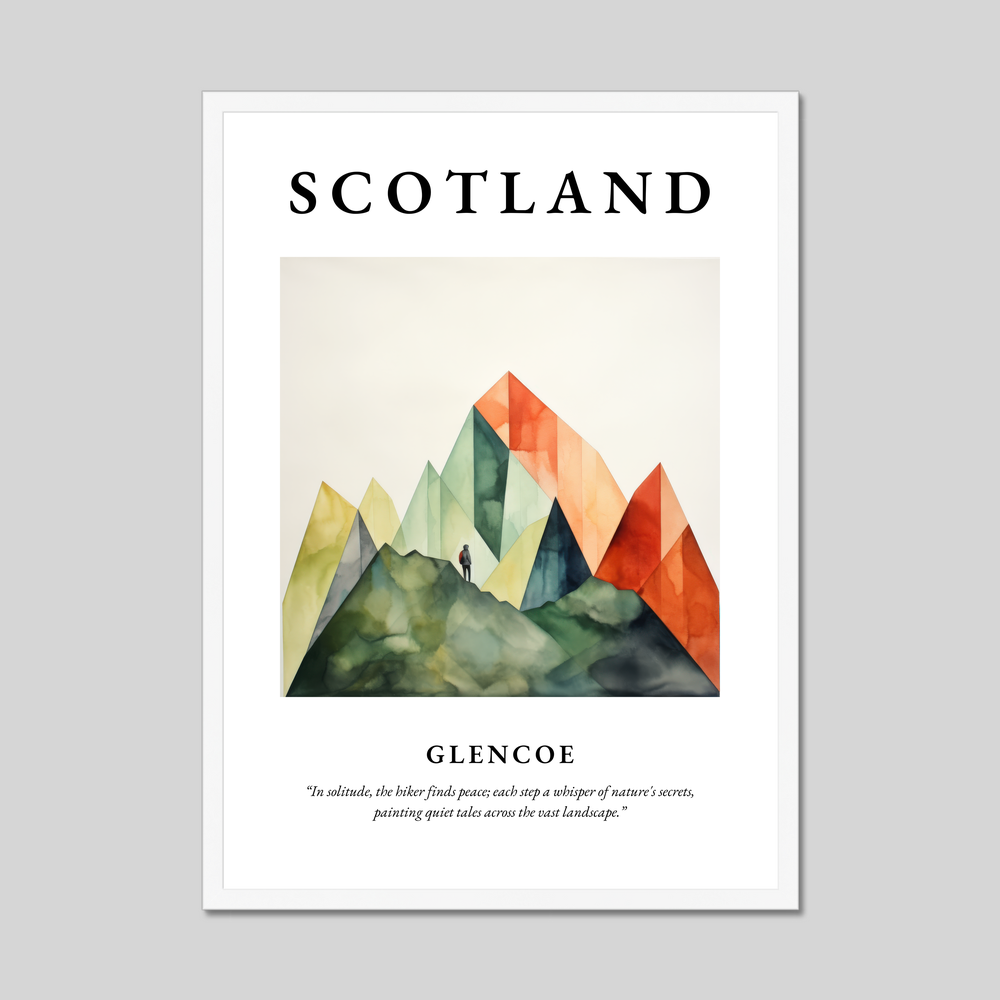 At the top, bold lettering spells out “SCOTLAND,” anchoring the eye to the heart of the Highlands. The centrepiece, a minimalist painting of Glencoe, beautifully captures the dramatic landscapes with simple geometric forms and soothing hues. The thought-provoking quote beneath, “In solitude, the hiker finds peace; each step a whisper of nature's secrets, painting quiet tales across the vast landscape,” invites reflection and adds depth to the visual narrative.