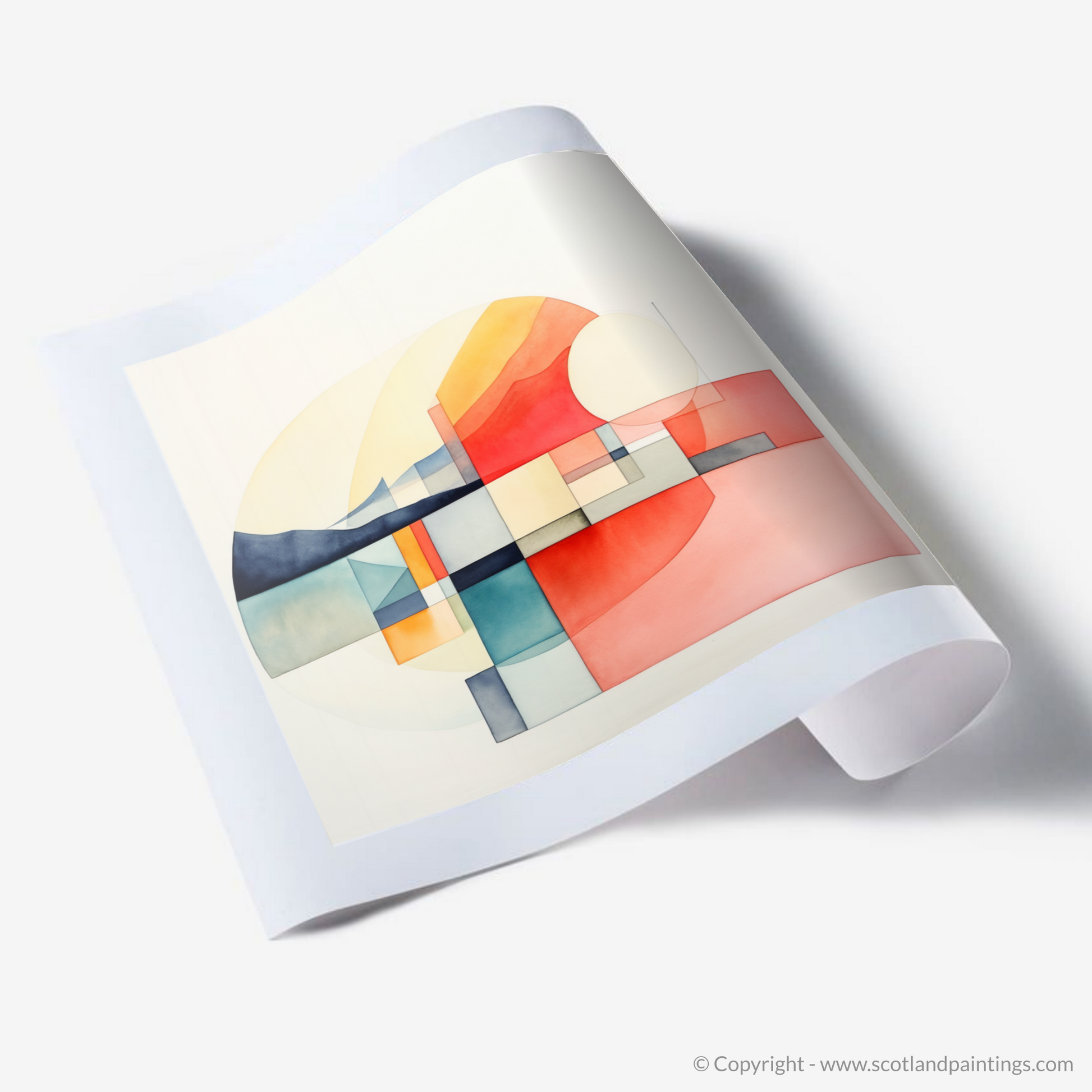The artwork's palette is a harmonious symphony of warm and cool tones that evoke the changing skies and rugged terrains of the Scottish Highlands. Bold oranges and soft yellows suggest the fleeting warmth of a setting sun, while the gentle blues and greys pay homage to the stoic presence of distant mountains and the vast expanses of water that define Skye's terrain.