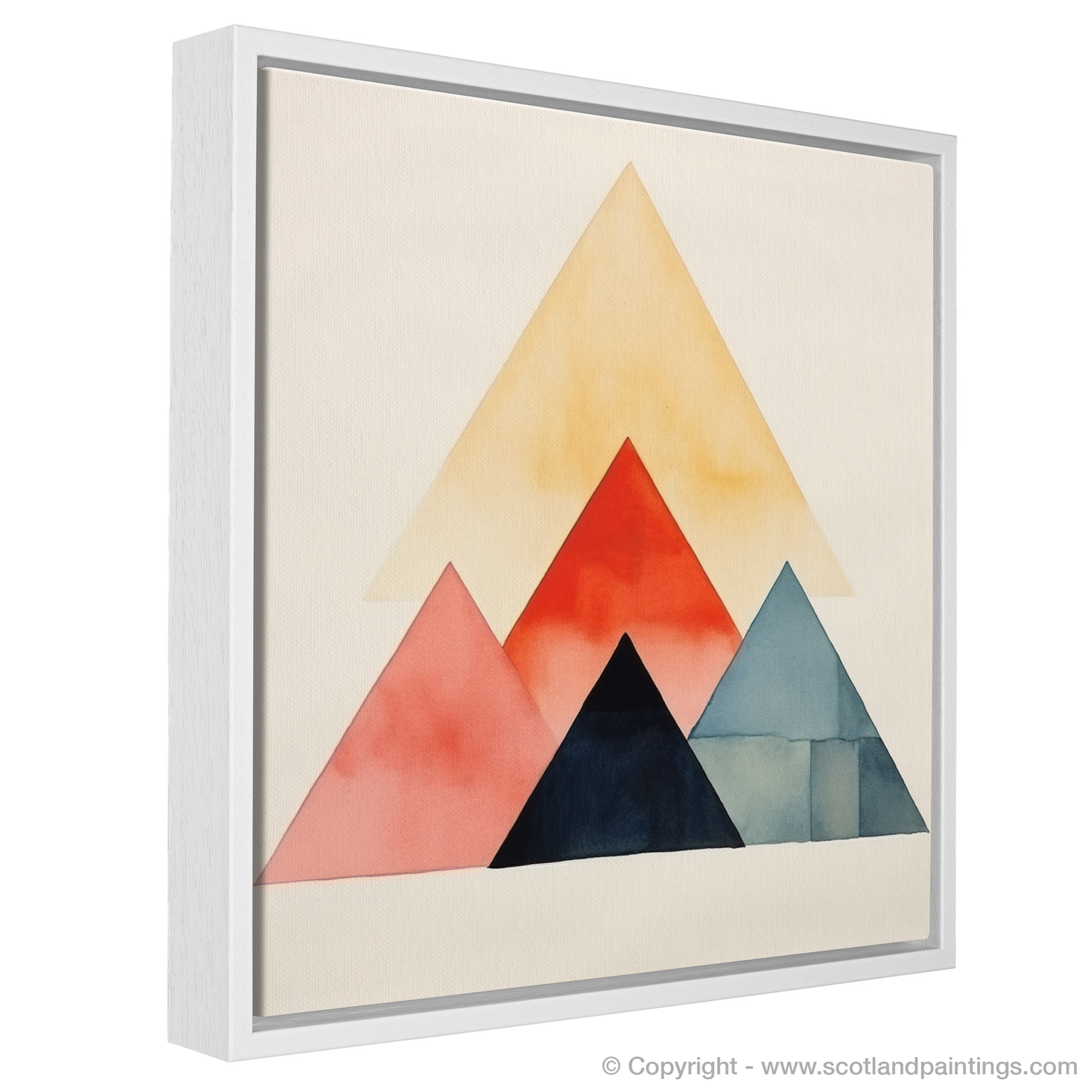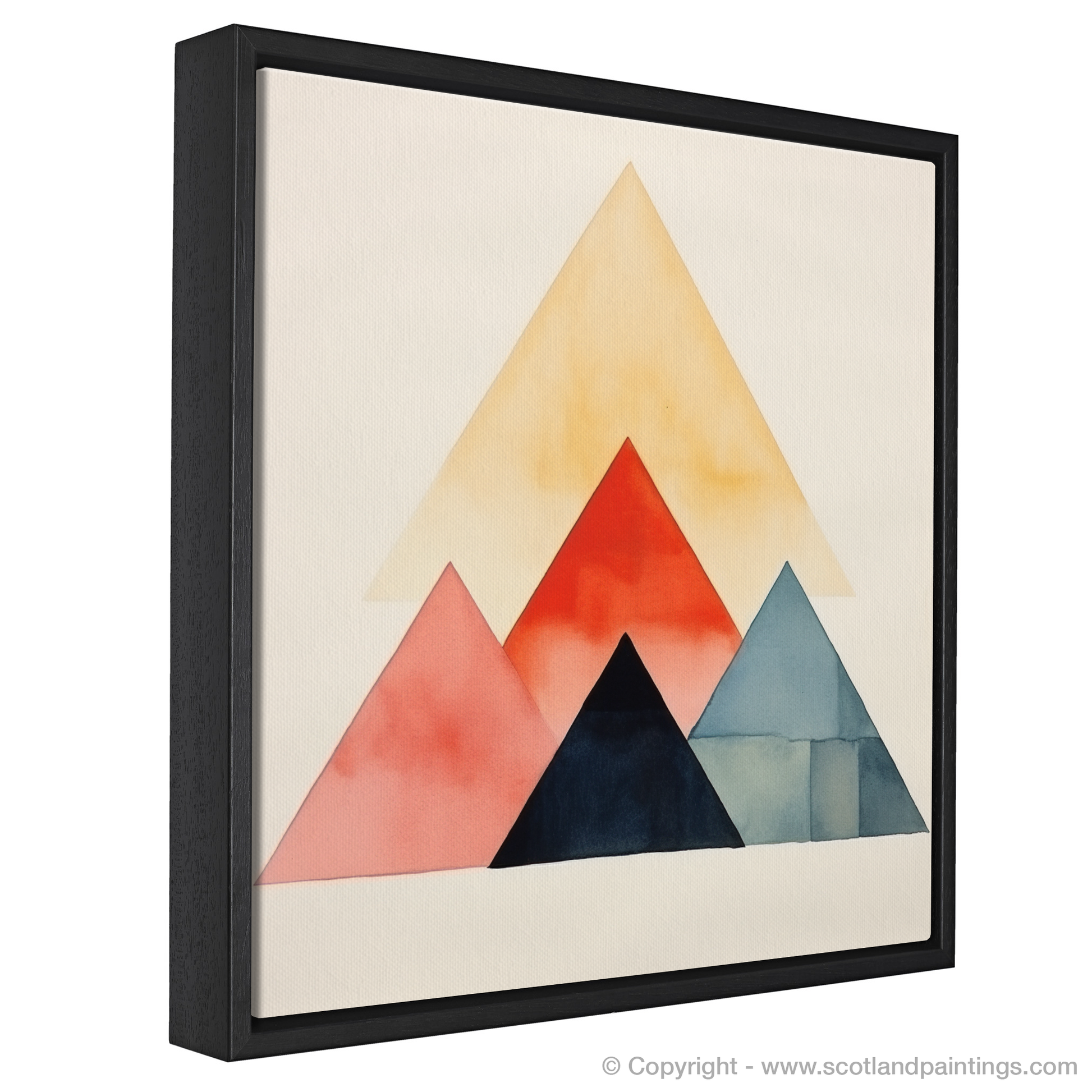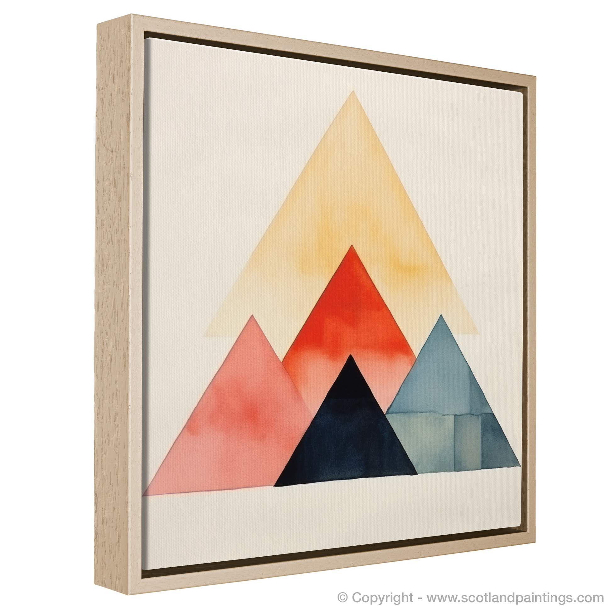 At the heart of the composition lies a trio of triangles, each a testament to the power of simplicity in art. These angular forms, reminiscent of the rugged peaks themselves, are imbued with a spectrum of colours that evoke the shifting light and varied atmosphere of the mountain environment. The largest triangle soars with a gradient of golden hues, suggesting the gentle warmth of a setting sun against cool mountain air.