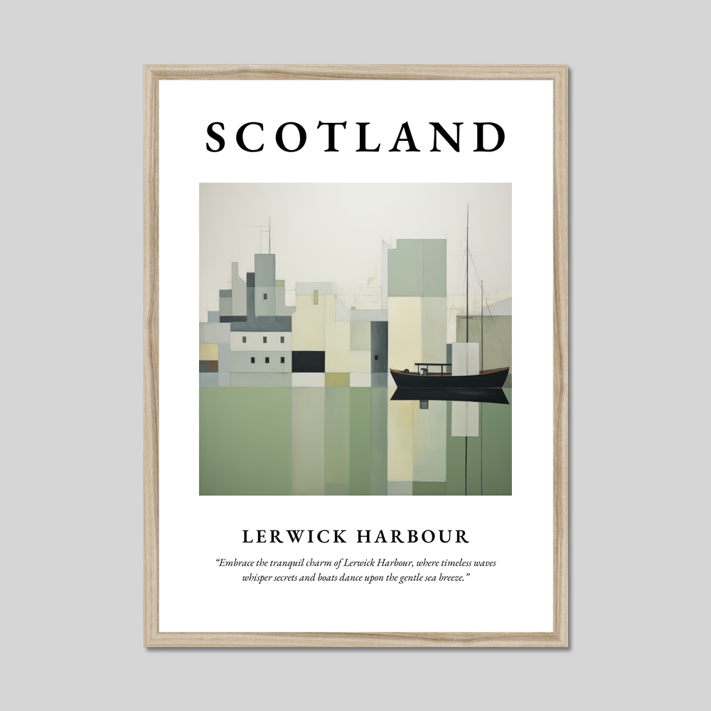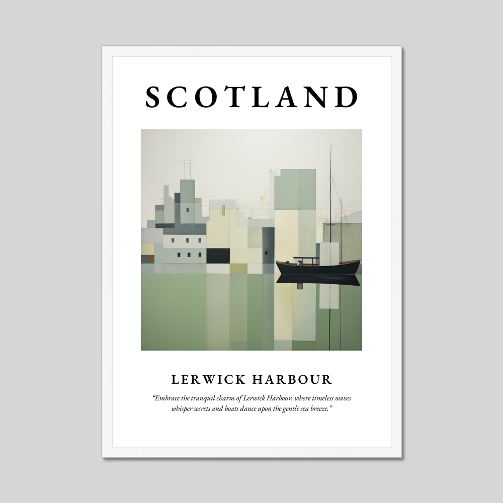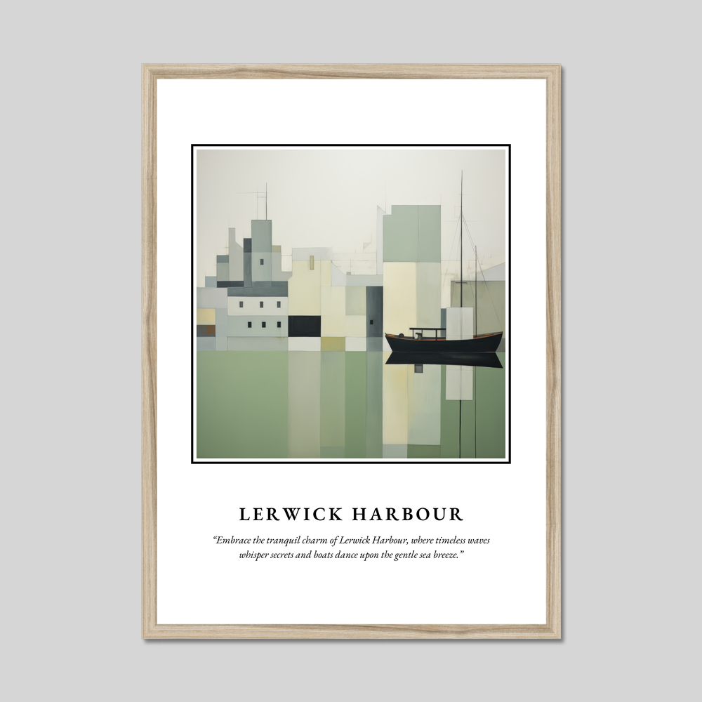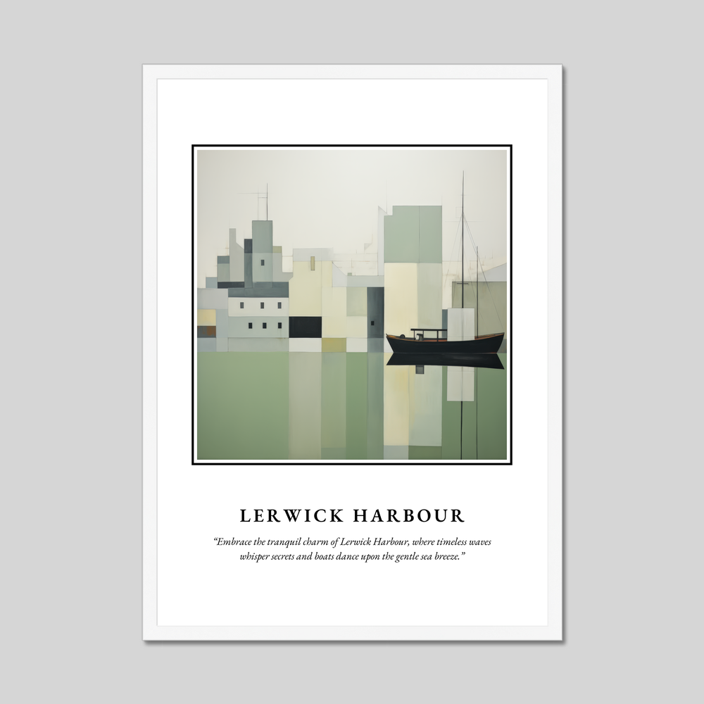 Beneath the painting, a thought-provoking quote invites reflection: “Embrace the tranquil charm of Lerwick Harbour, where timeless waves whisper secrets and boats dance upon the gentle sea breeze.” It’s a perfect fit for those who cherish a connection to the harbour, have fond memories of visits, or simply adore the purity of minimalist art.